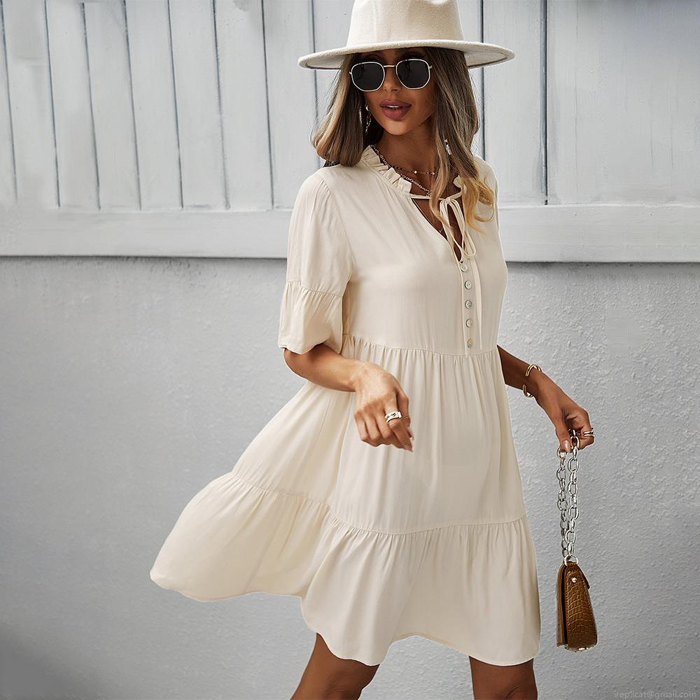Solid Color, Ruffles, Button Decoration, Cake Skirt, V-neck Tie