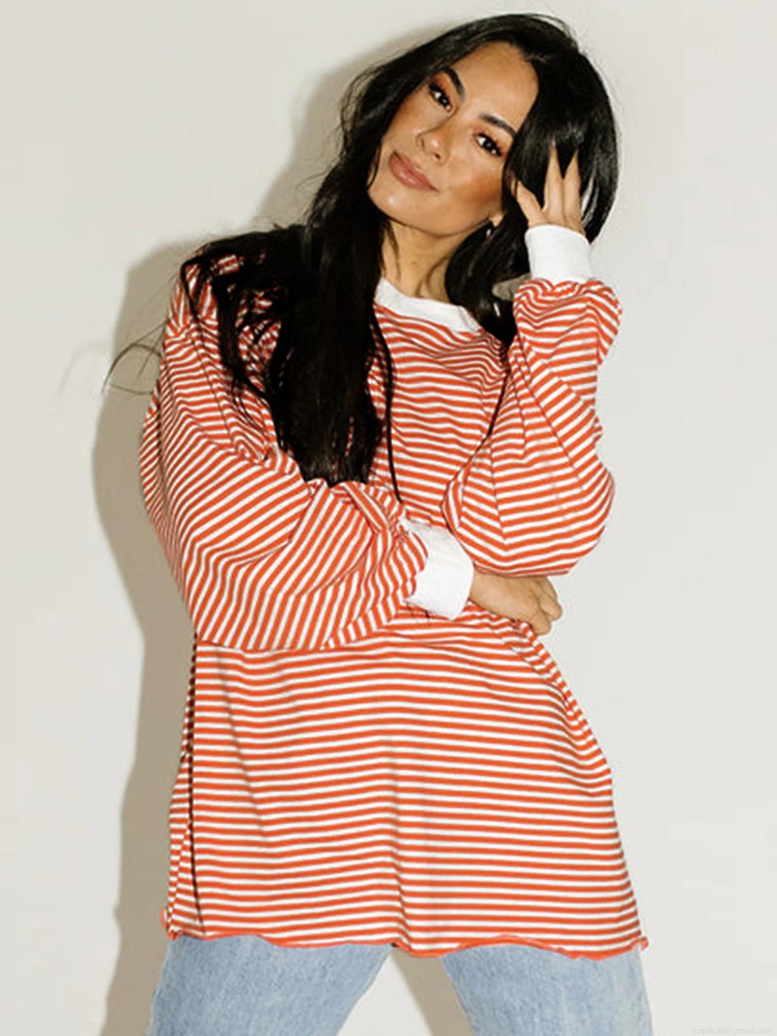 Women's Casual Viscose Striped Long Sleeve Sweatshirt Loose Fit Color Block Crew Neck Pullover Top Streetwear Fashion Autumn Spring Fashionable Striped T-Shirt