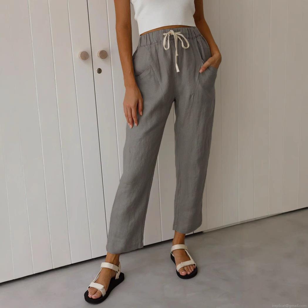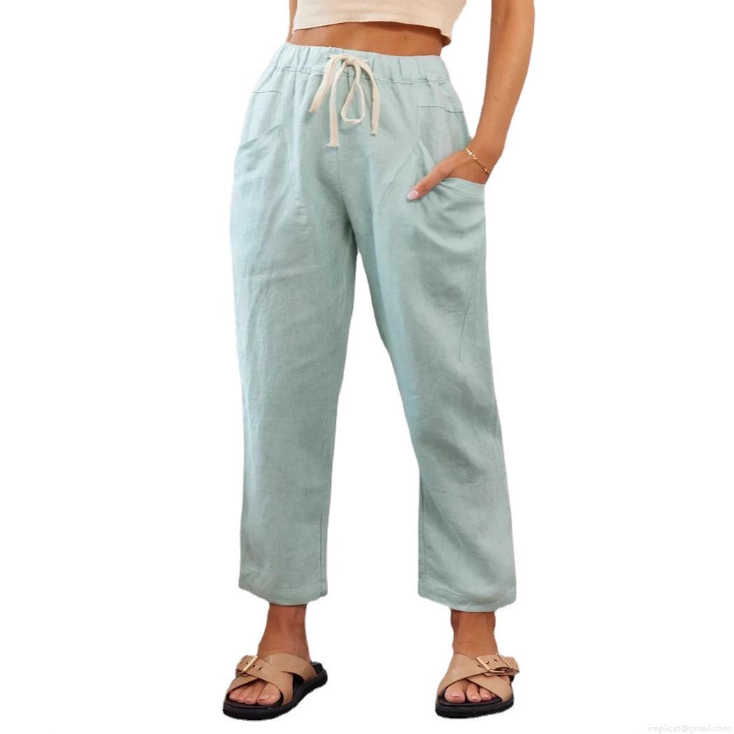 • Women's Cotton Linen Straight Leg Casual Pants High Waist Drawstring Nine-Point Trousers Solid Color Summer Breathable Lightweight Lounge Pants With Pockets