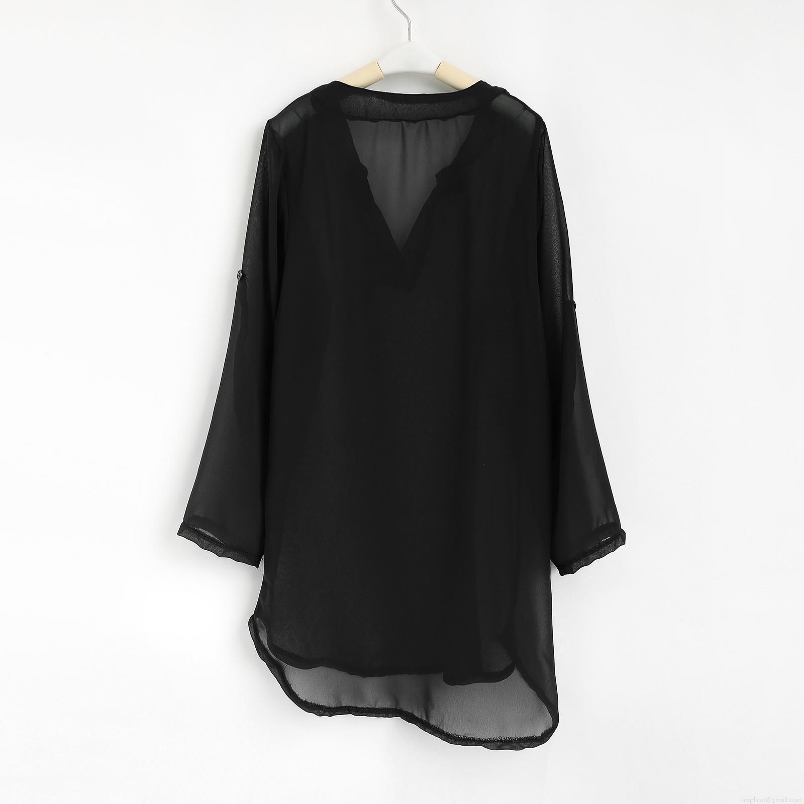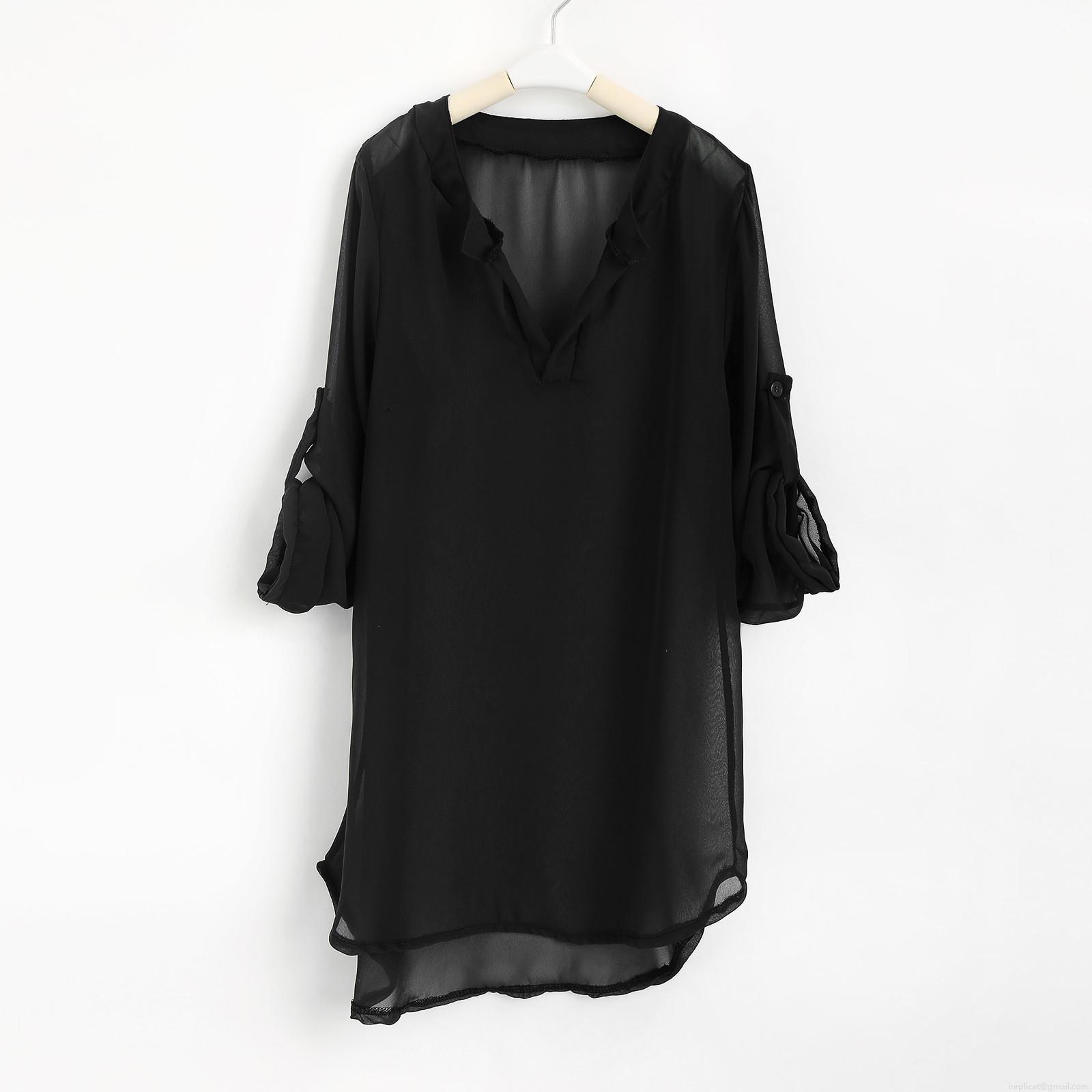 • Women's Deep V-Neck Chiffon Beach Cover Up Shirt Loose Solid Color Long Sleeve Swimsuit Smock Maternity Beachwear Blouse With Side Slit