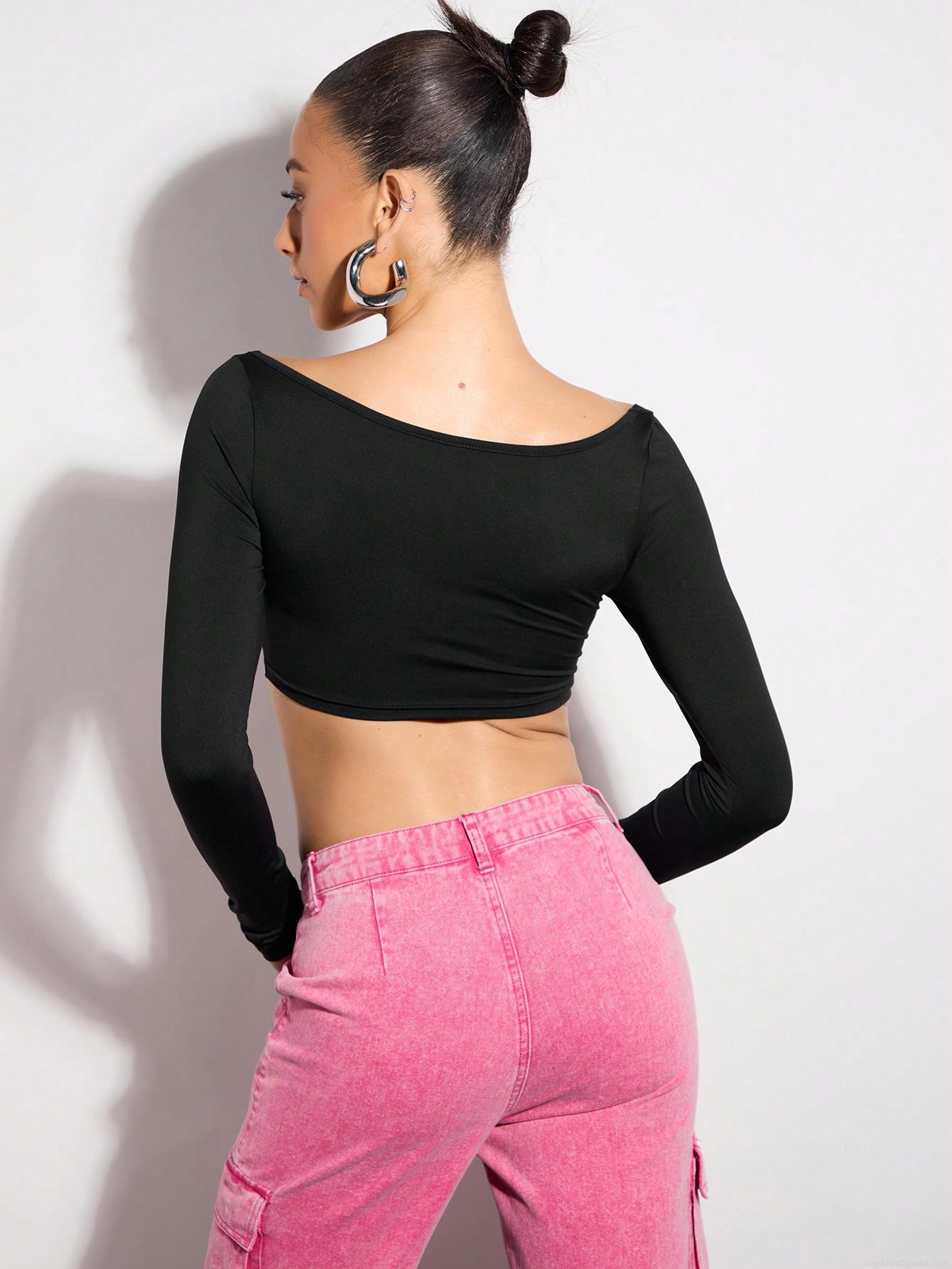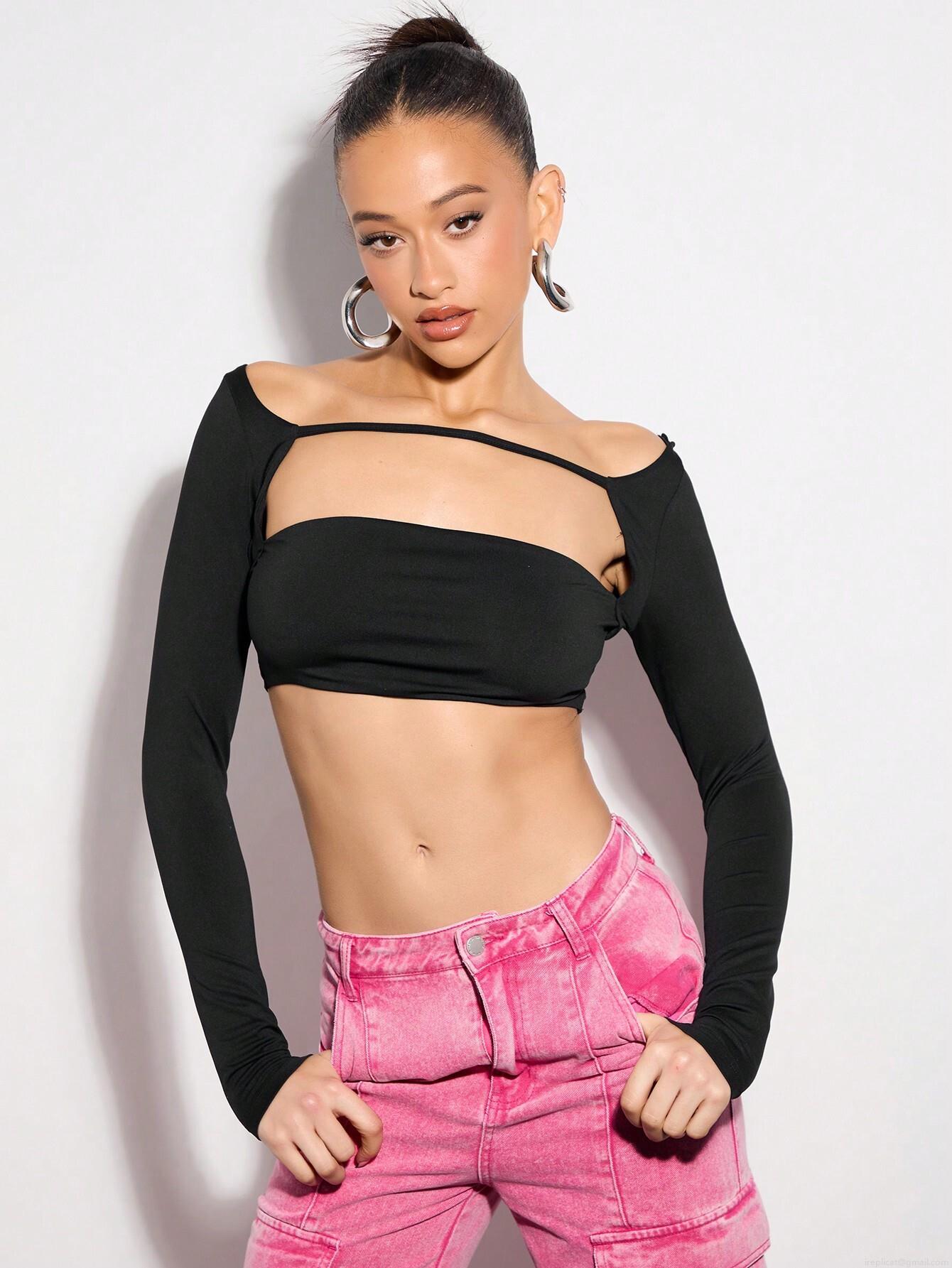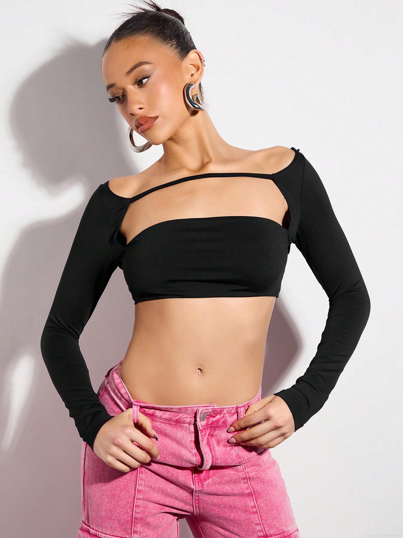 • Women's Sexy Black Cut Out Crop Top Long Sleeve Hollow Out Slim Fit Polyester T-Shirt Mock Neck Hollow Tee For Clubwear Party Fall Winter