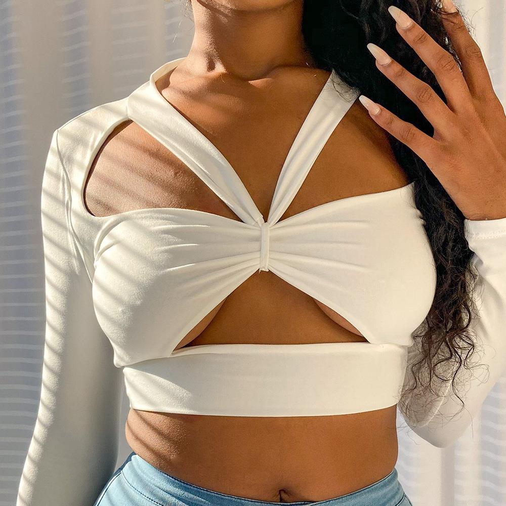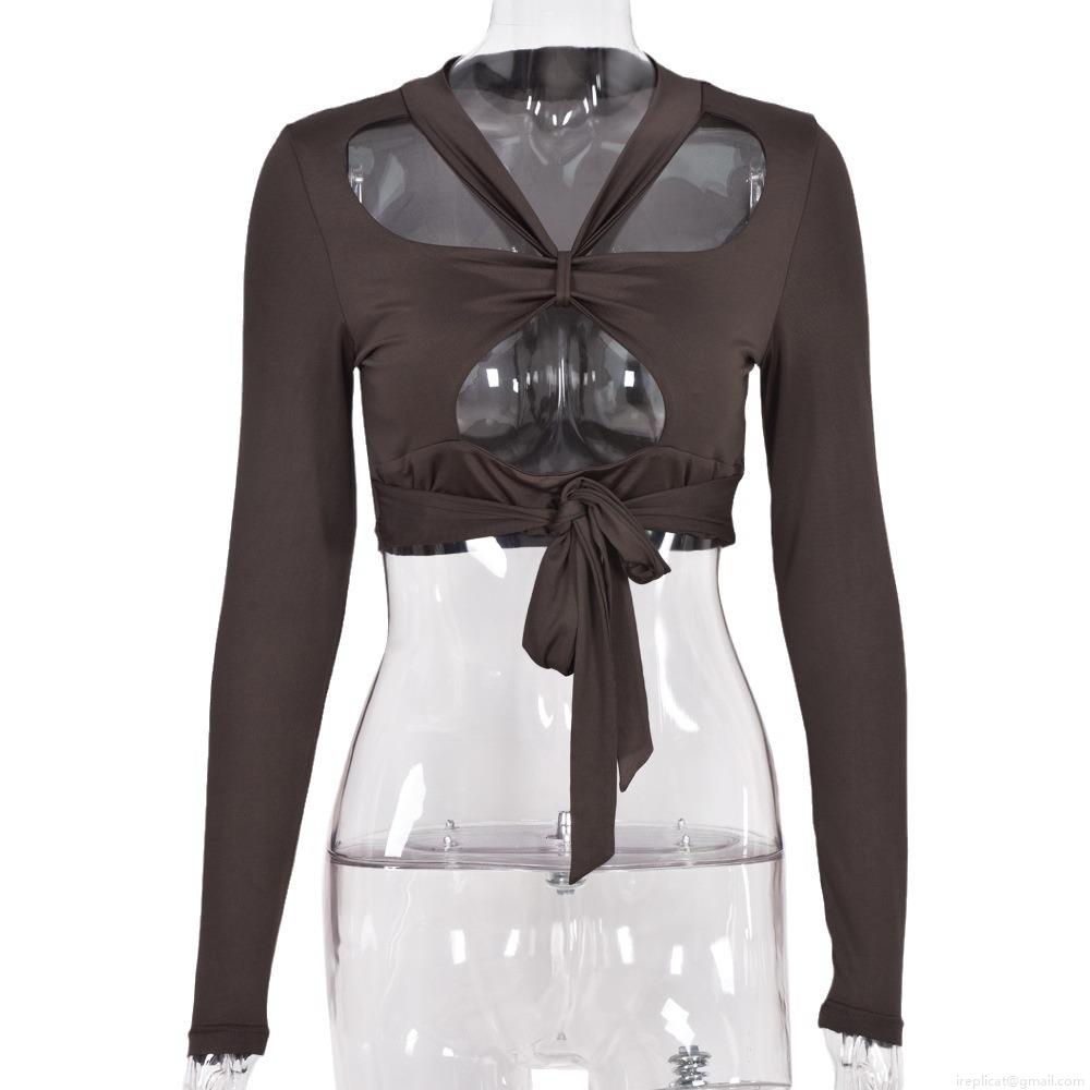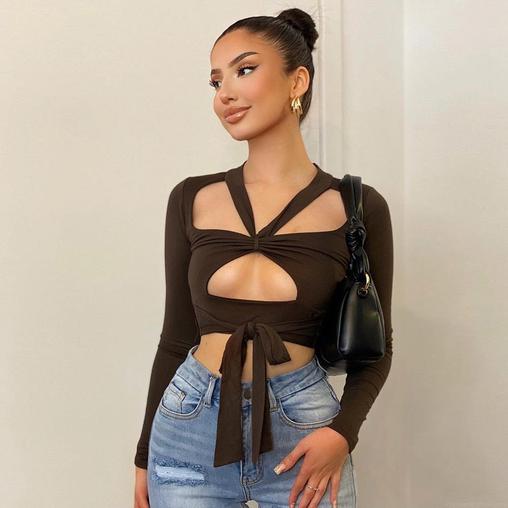 • Women's Sexy Hollow Out Crop Top Long Sleeve Square Neck Tie Up T-Shirt Streetwear Skinny Ribbed Top For Party Clubwear Solid Color 95% Polyester 5% Spandex