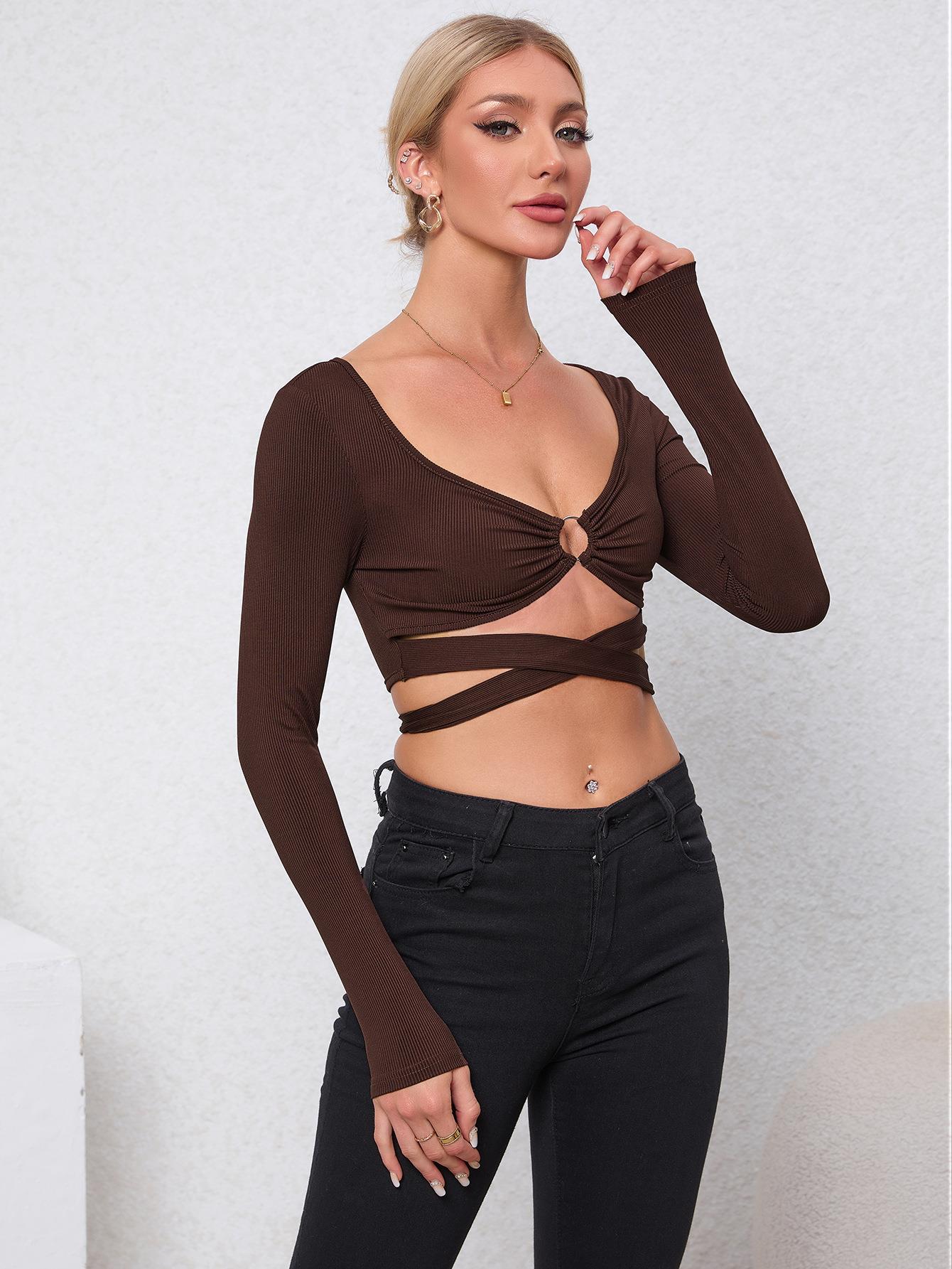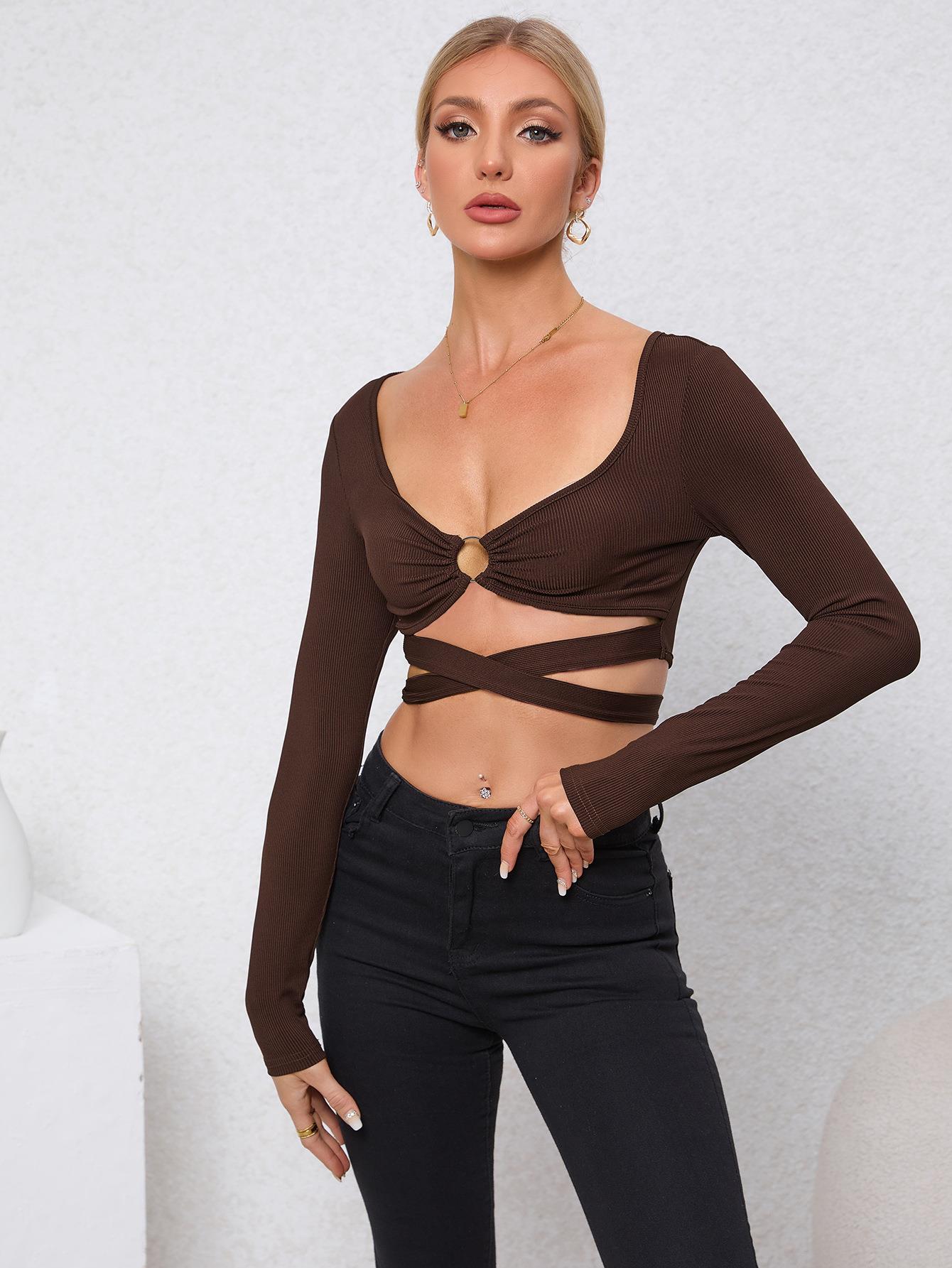 • Women's Sexy Hollow Out Slim Fit Crop Top Long Sleeve Ribbed Knit Top With Metal Ring And Crossover Waist Straps Party Clubwear Streetwear