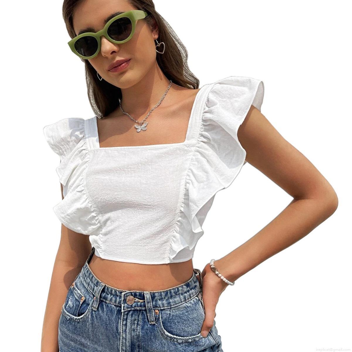 • Women's Sweet White Square Neck Ruffle Sleeve Backless Tie-Up Cotton Crop Top Sleeveless Casual Summer Tank Top Streetwear Fashion Tee