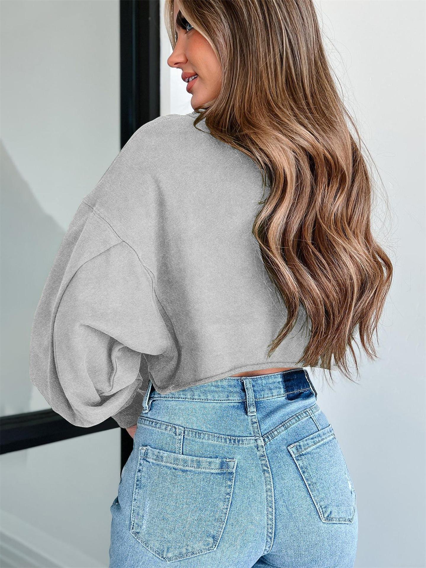 • Women's Cropped Sweatshirt Long Lantern Sleeve Round Neck Solid Color Loose Pullover Top Sexy Streetwear Crop Hoodie for Autumn Winter