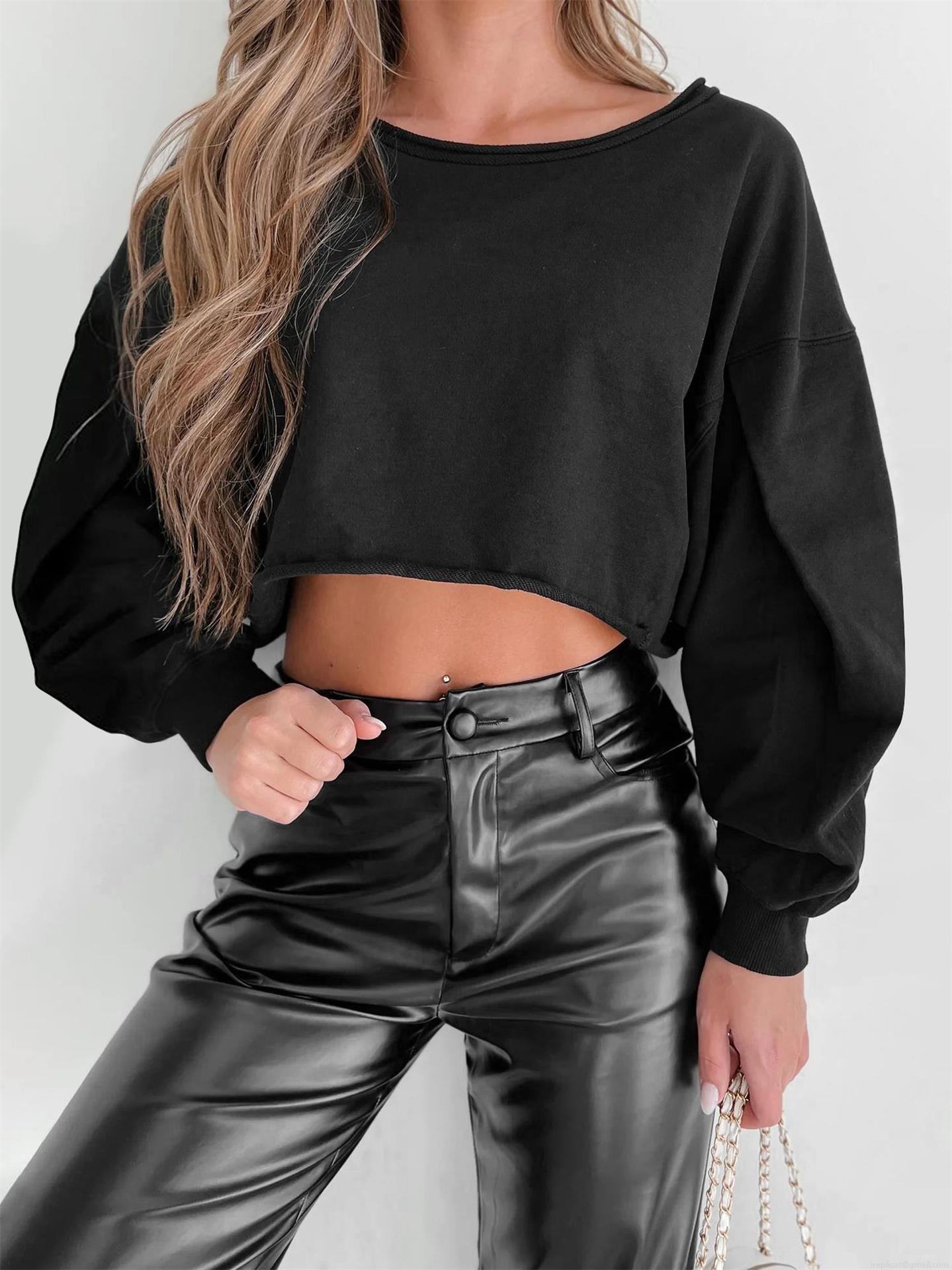 Women's Cropped Sweatshirt Long Lantern Sleeve Round Neck Solid Color Loose Pullover Top Sexy Streetwear Crop Hoodie for Autumn Winter