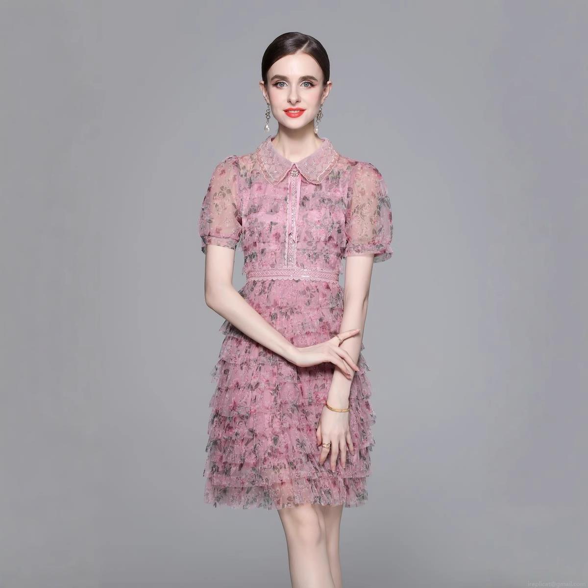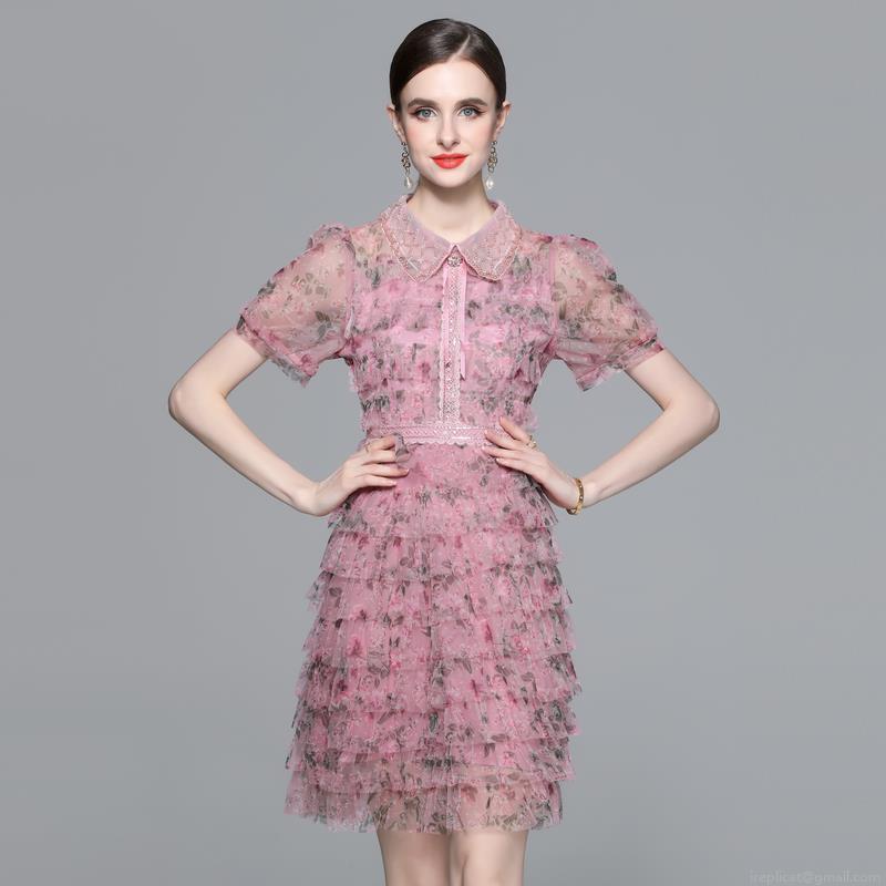 • Women's Elegant Floral Mesh Patchwork Dress With Beaded Peter Pan Collar Puff Sleeve Tiered Cake Midi Dress Sweet Fairy Party Clothing