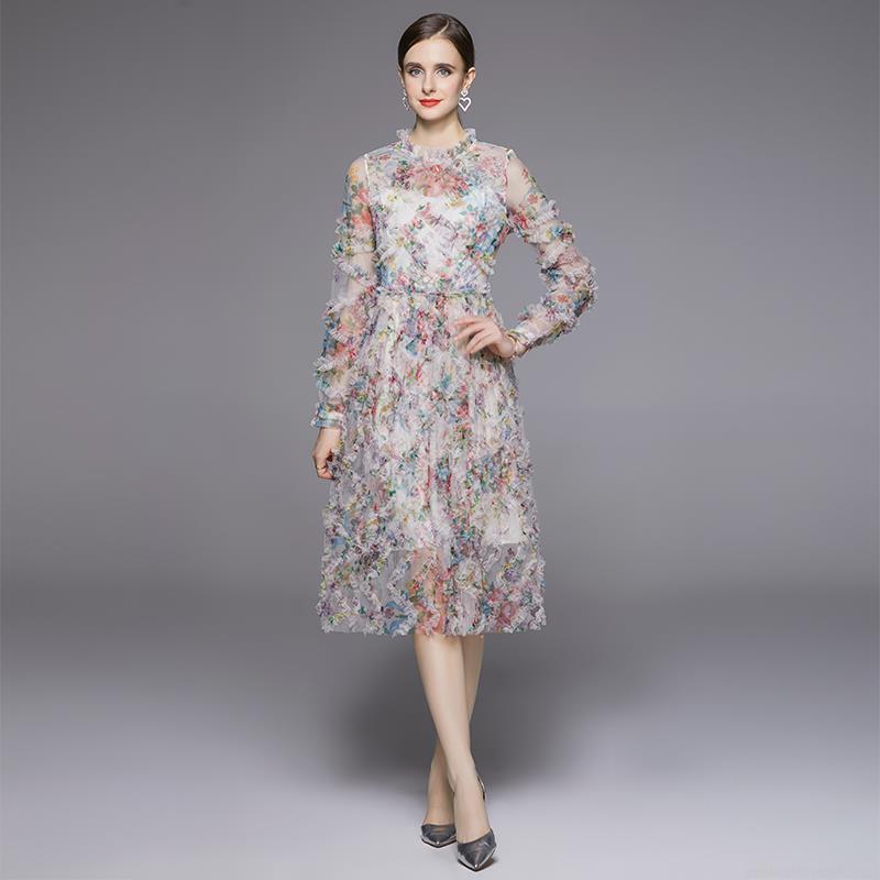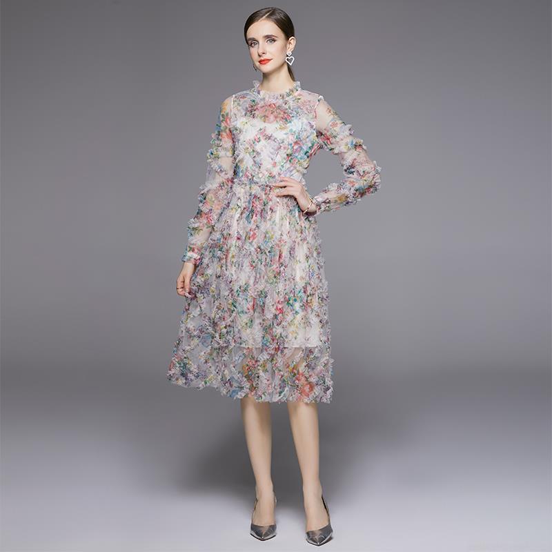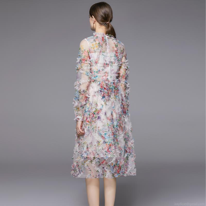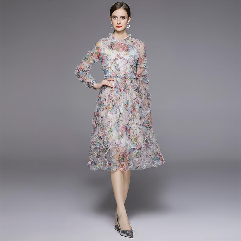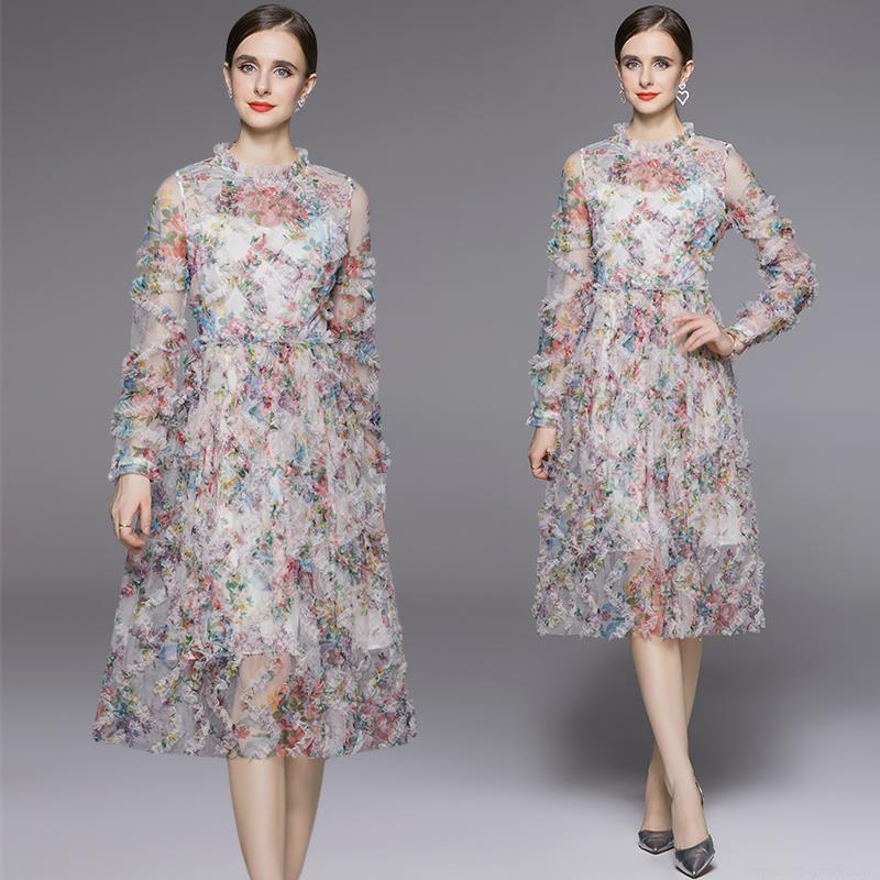 • Women's Elegant Floral Print Mesh Chiffon Long Sleeve Midi Dress High Waist Tiered Ruffle Cake Dress For Party Evening Clubwear Ladies Fashion Outfit
