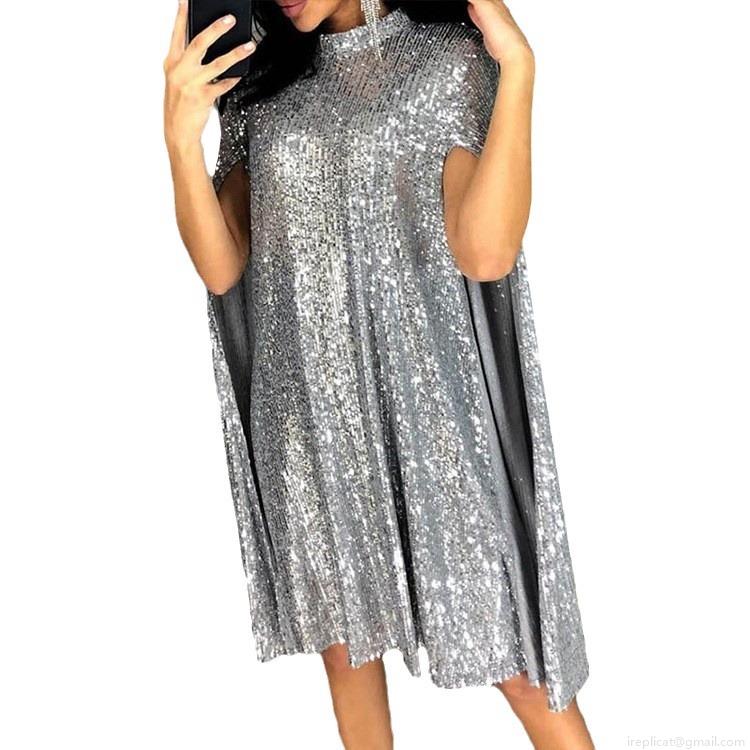 • Women's Elegant Sequin Cape Dress Stand Collar Loose Mini Party Evening Sparkly Sleeveless Cloak Dress For Ladies Formal Solid Color Polyester Outfits