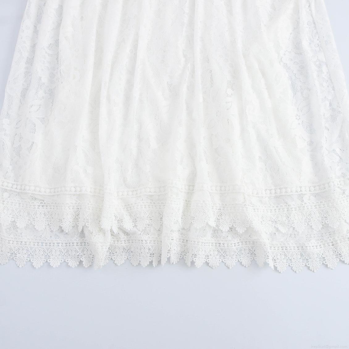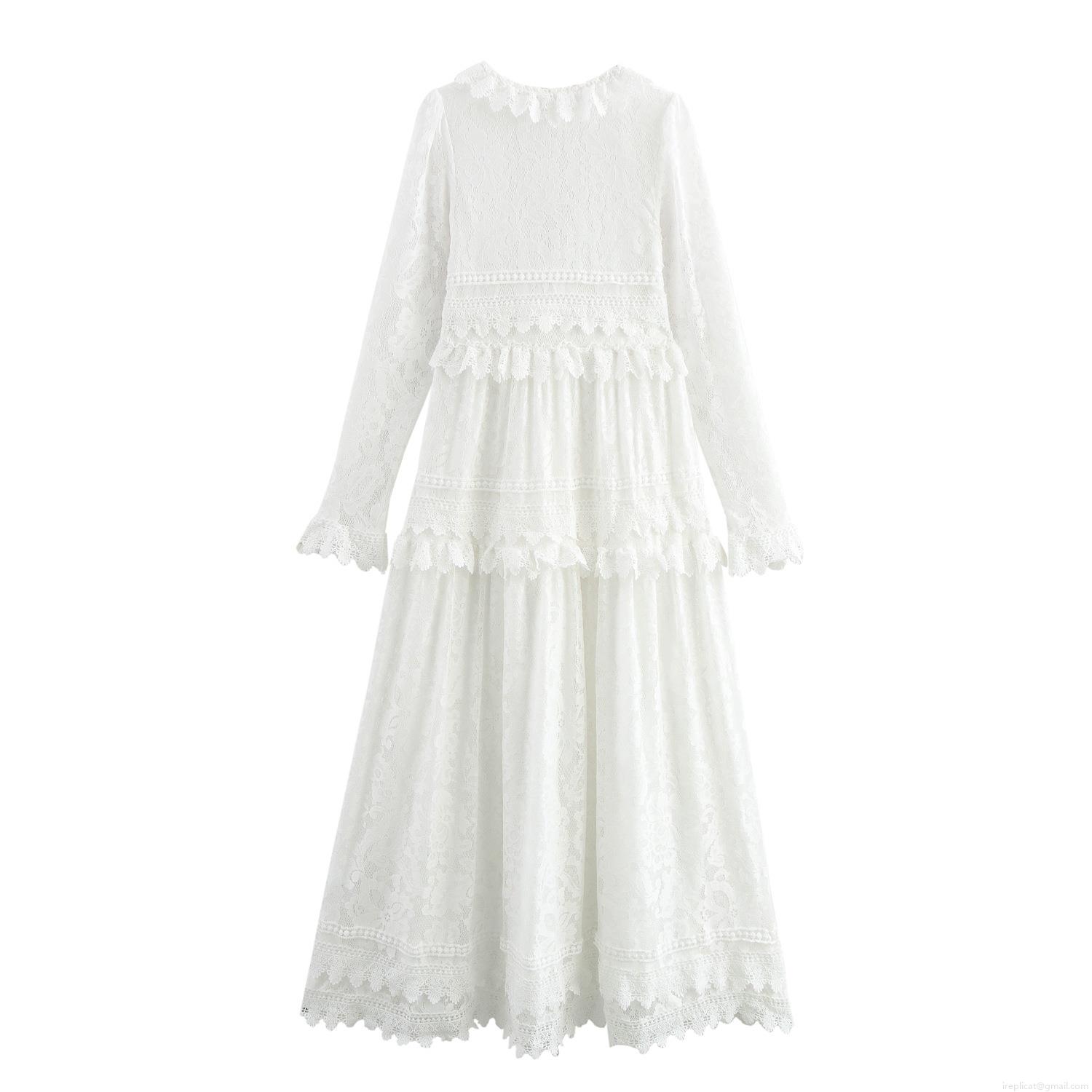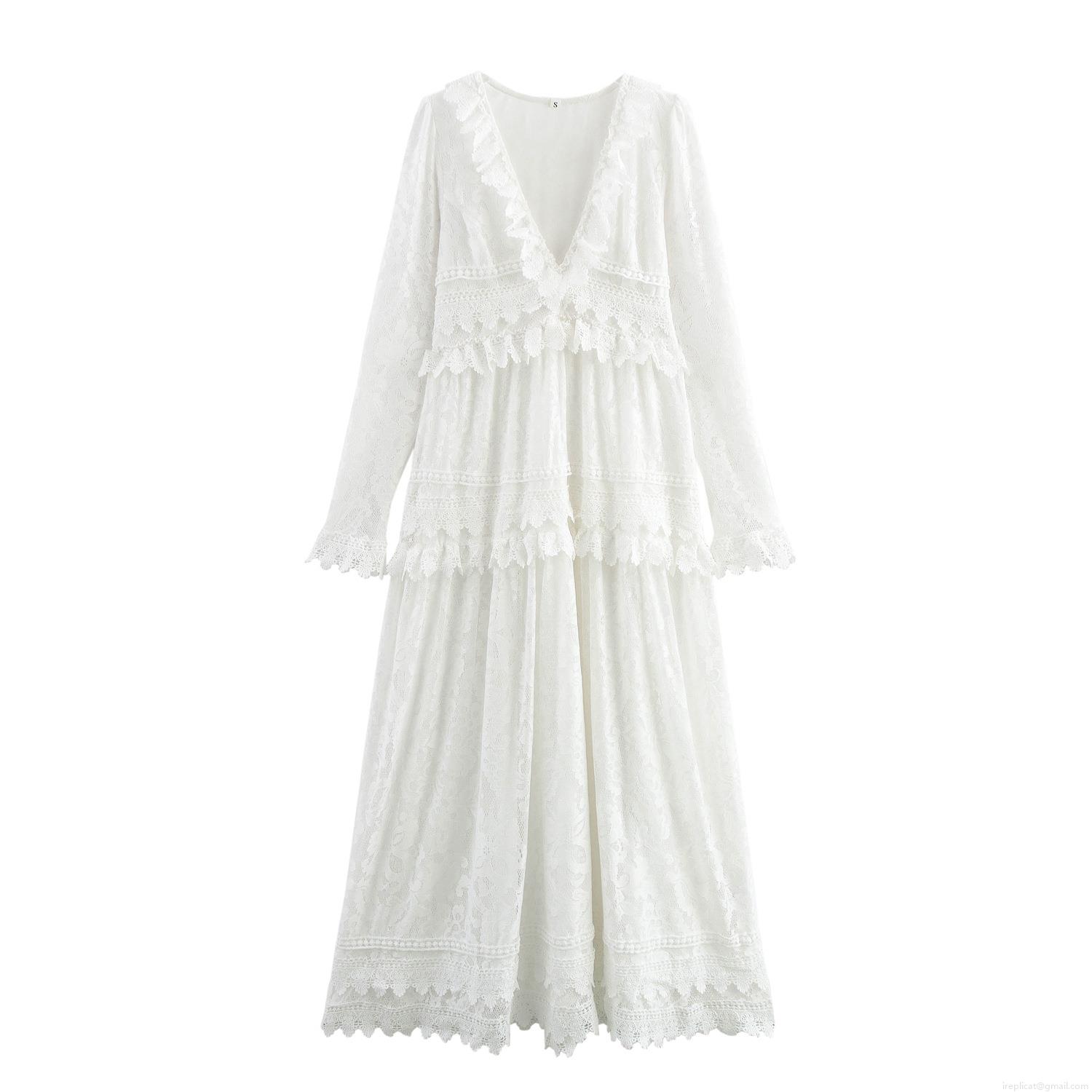 • Women's Elegant White Lace Maxi Dress French V-Neck Long Sleeve Embroidery Ruffle Cake Dress For Vacation Beach Wedding Party