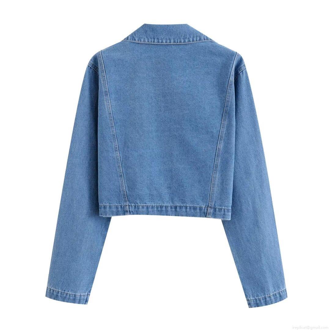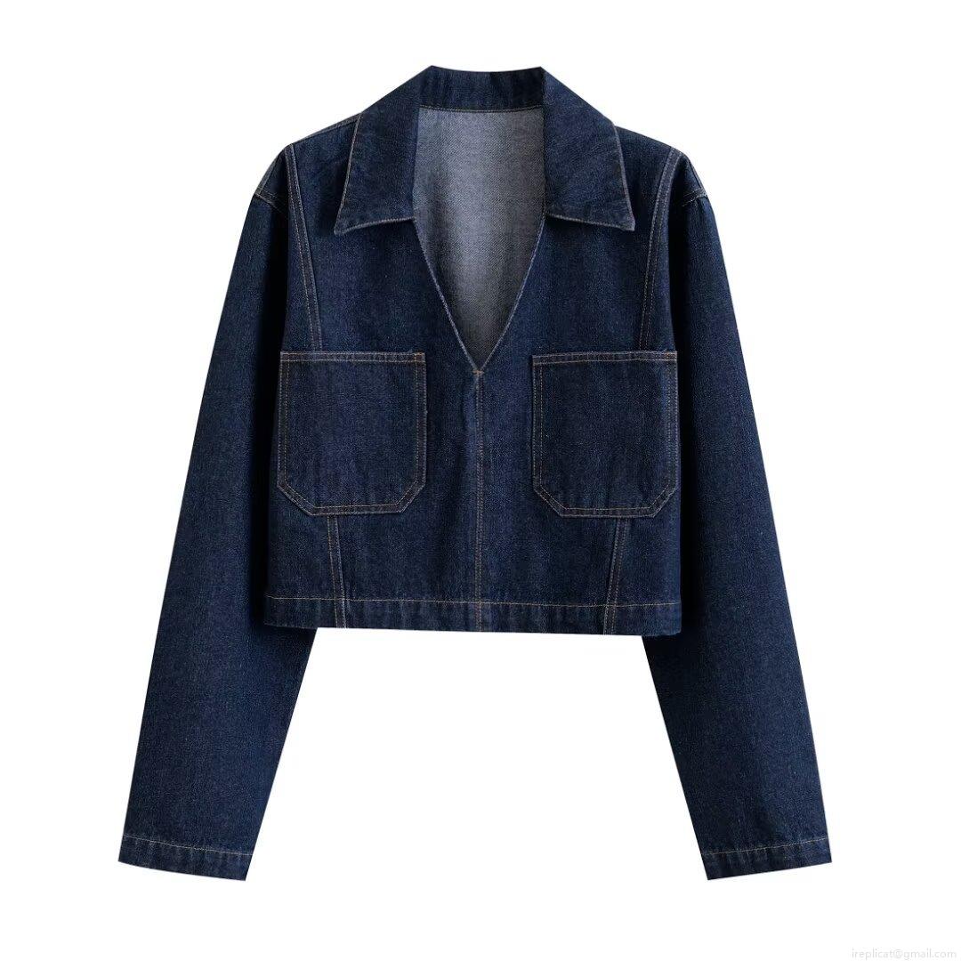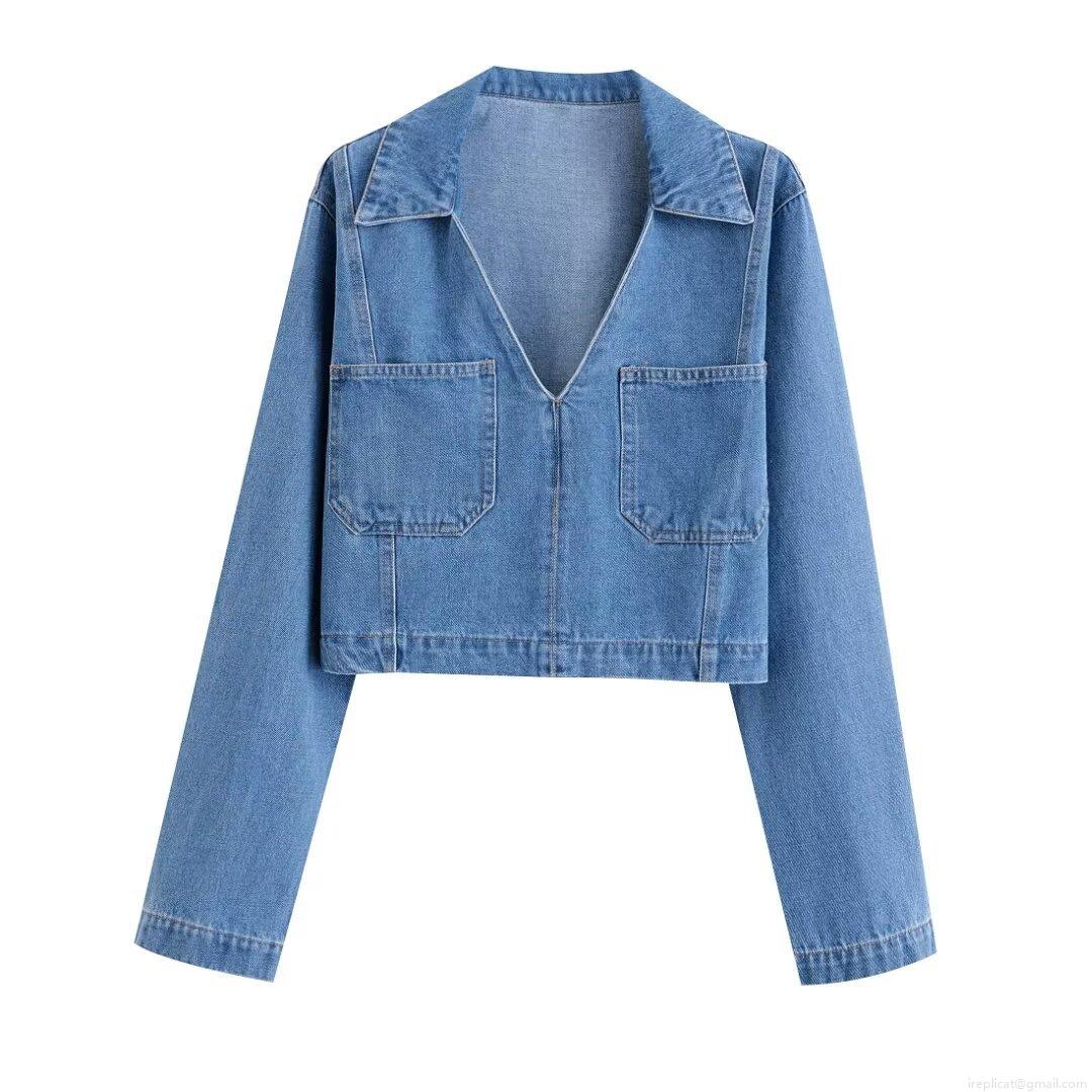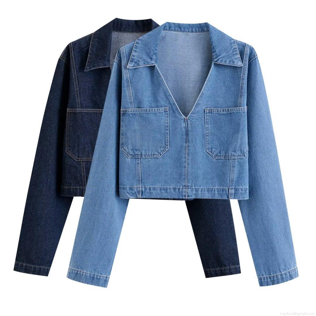 • Women's Fashion Solid Color Lapel Denim Long Sleeve Shirt Top Vintage Cropped Denim Jacket With Pockets For Women Casual Streetwear Autumn Winter Outwear