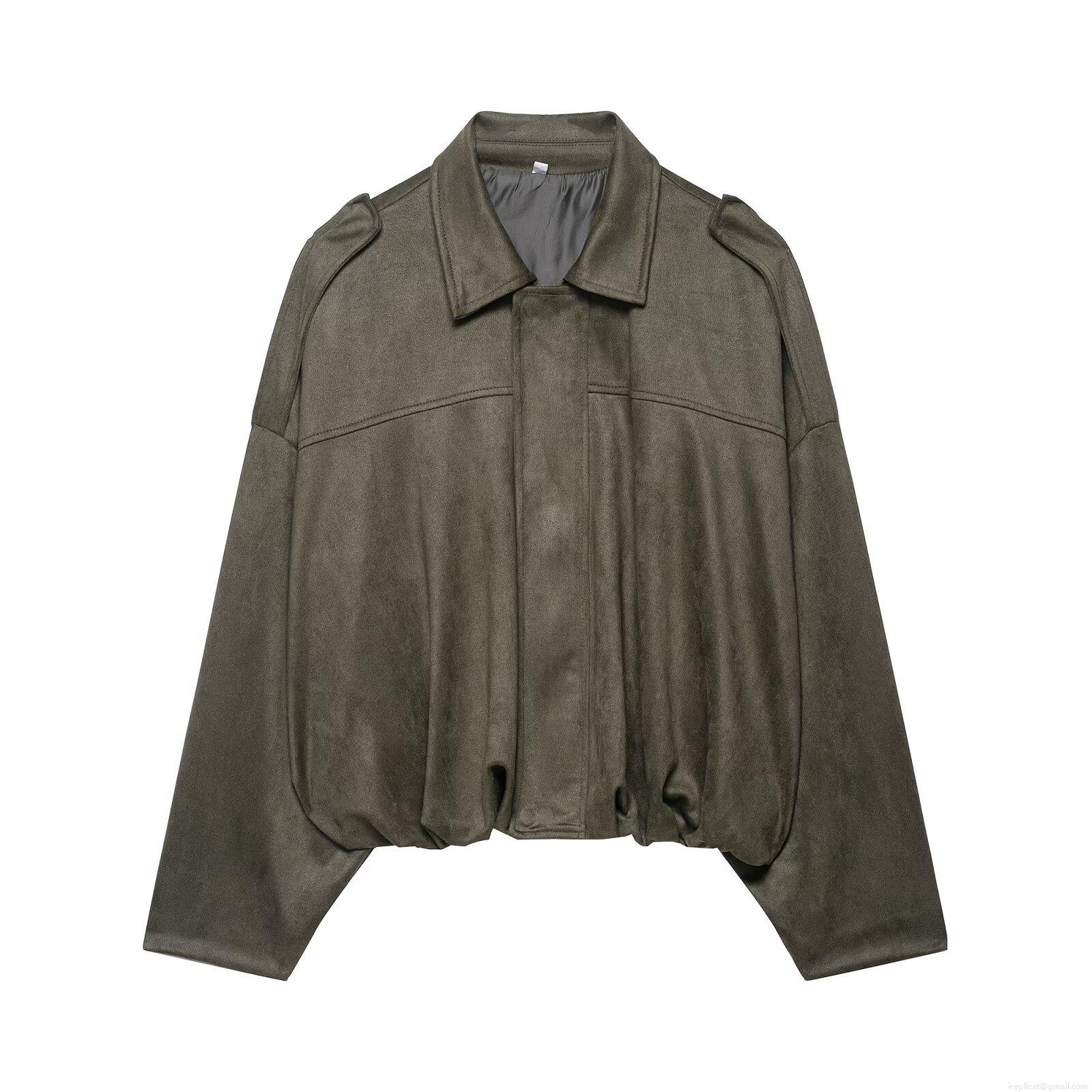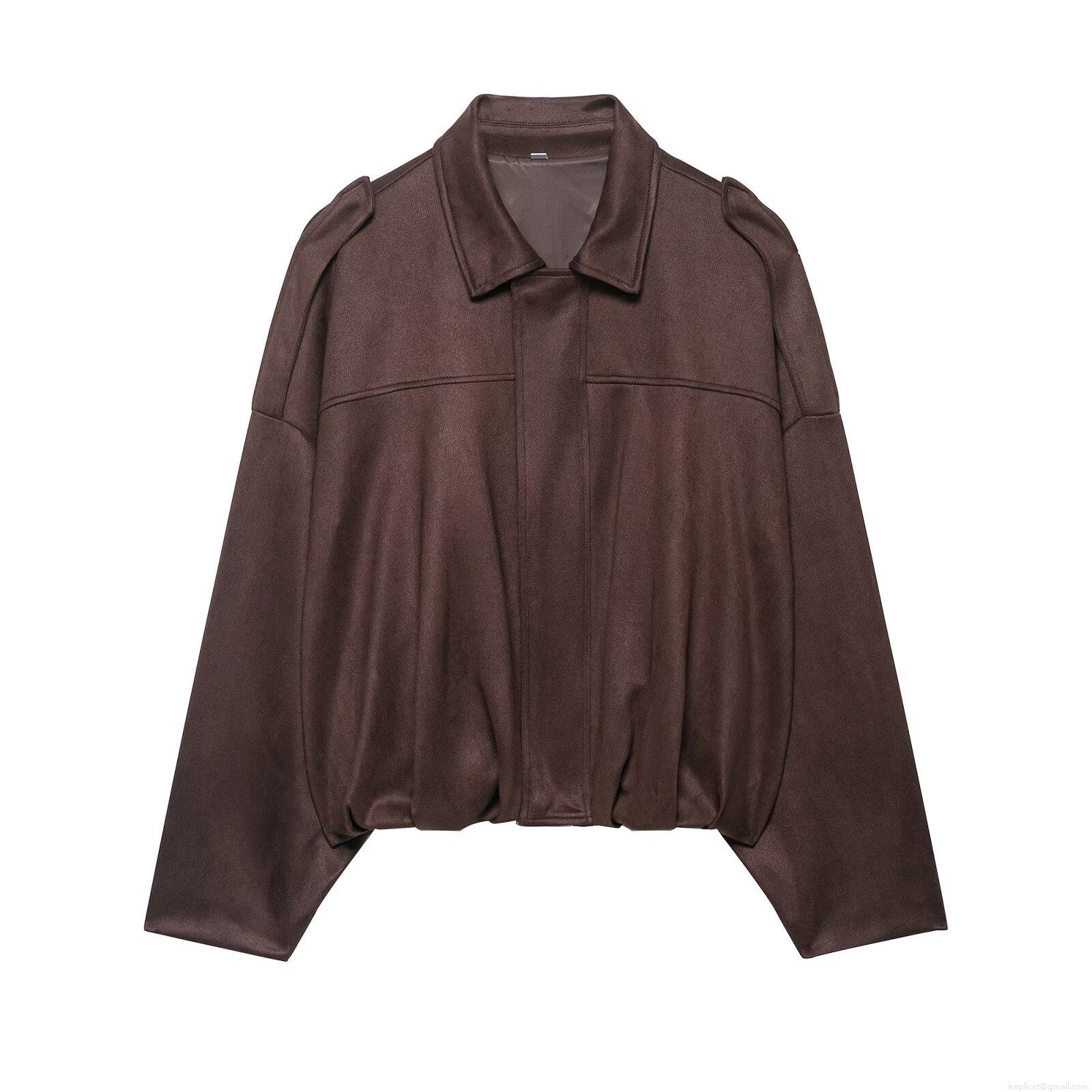 • Women's Faux Suede Cropped Jacket 100% Polyester Lapel Zipper Streetwear Outerwear Solid Color Vintage Loose Baseball Coat With Pockets