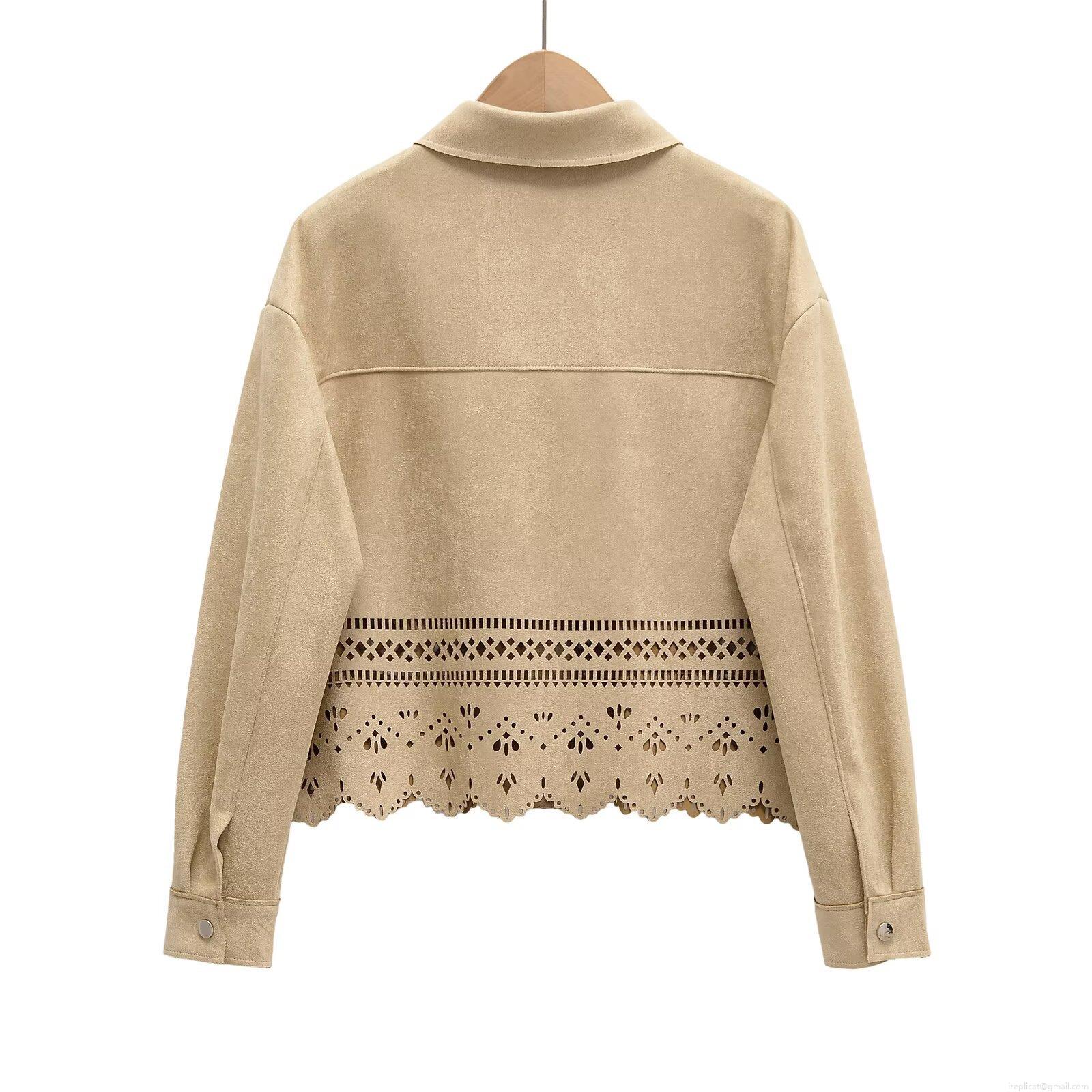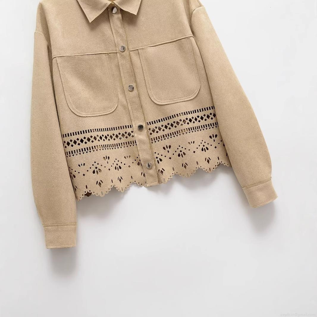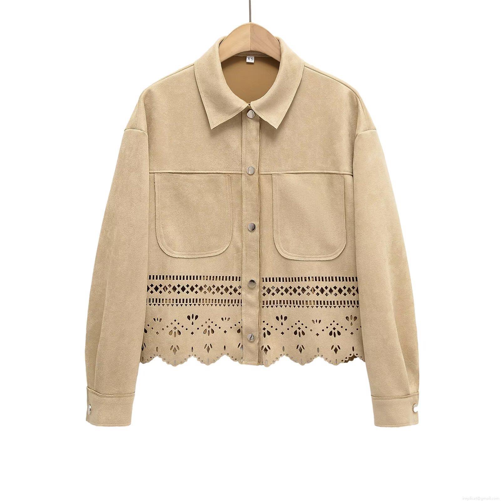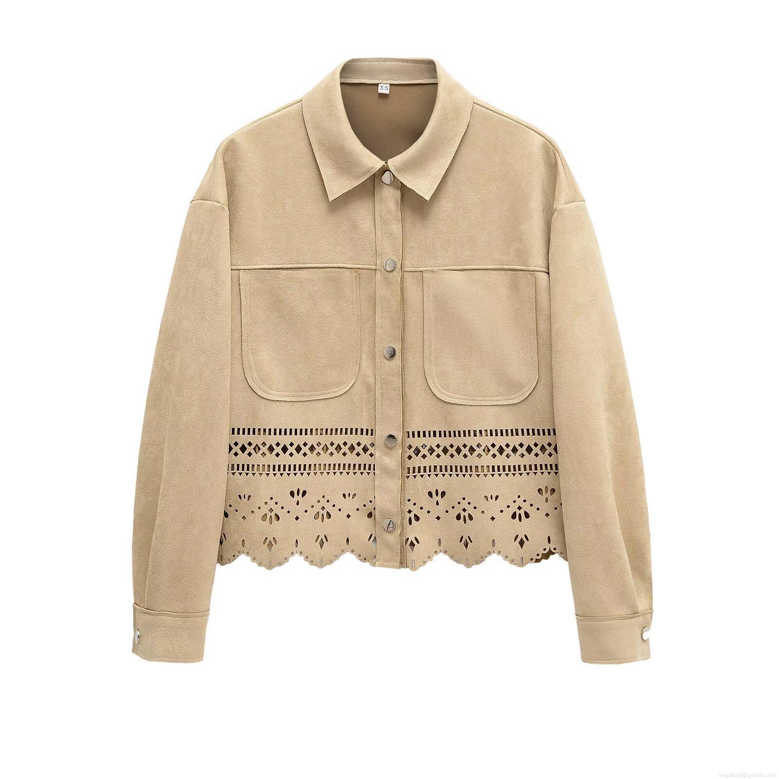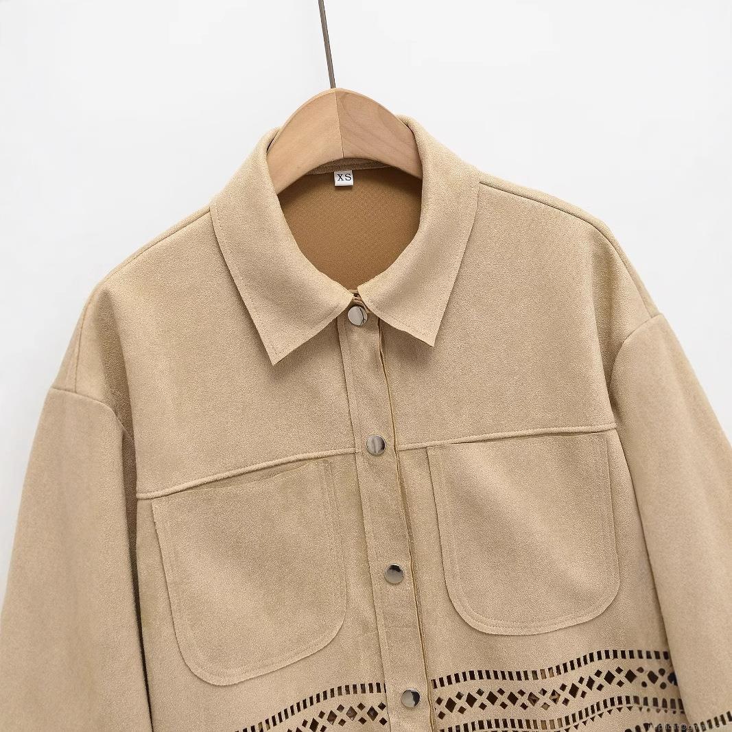 Women's Faux Suede Shirt Jacket Laser Cut Hollow Out Floral Hem Long Sleeve Metal Button Elegant Vintage Khaki Top For Casual Office Party