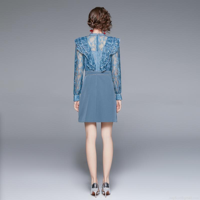 • Women's French Elegant Blue Lace Patchwork Dress Long Sleeve Bow Tie Neck A-Line Midi Dress With Sequins Faux Pearl For Party Event Wedding Cocktail Ladies Chic Luxury Slim Fit Dress
