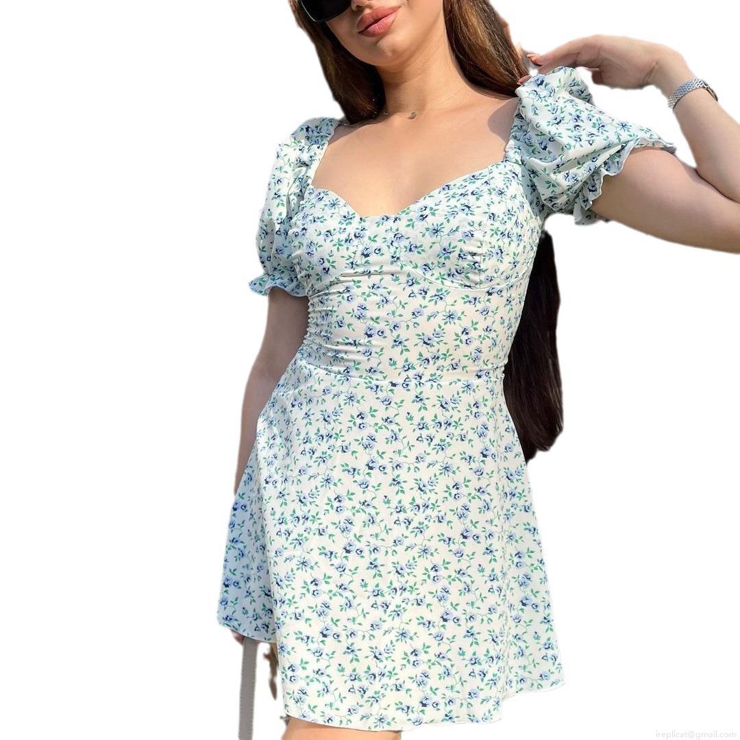 • Women's French Retro Floral Puff Sleeve Dress Lace-up Back High Waist Slim Fit Mini Dress For Summer Vacation Date Party