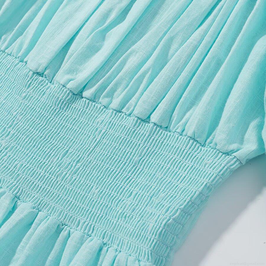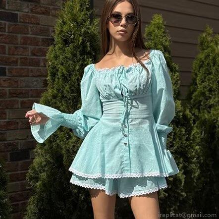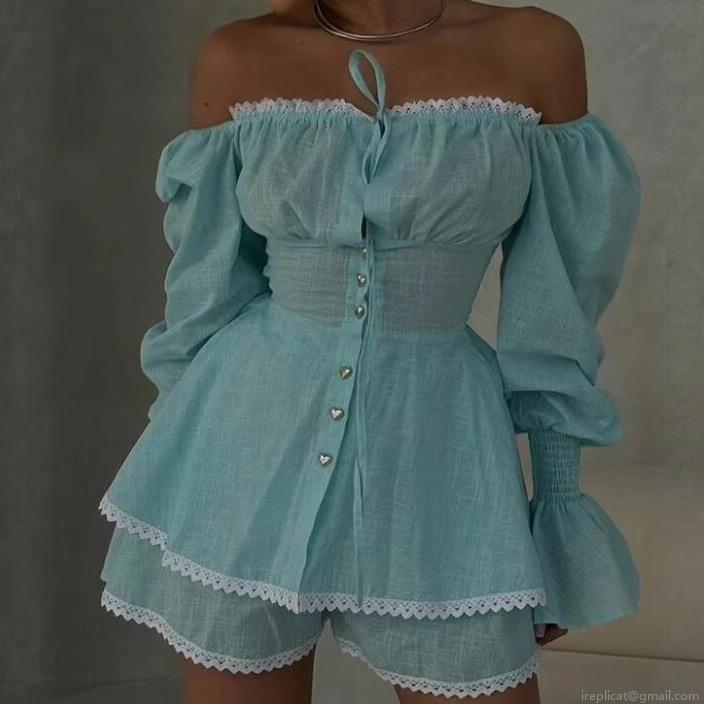 • Women's French Retro Two-Piece Set Off-Shoulder Long Puff Sleeve Top And Shorts Outfits With Lace Trim Heart Buttons Light Blue Cotton Linen Feel Sweet Cottagecore Outfits
