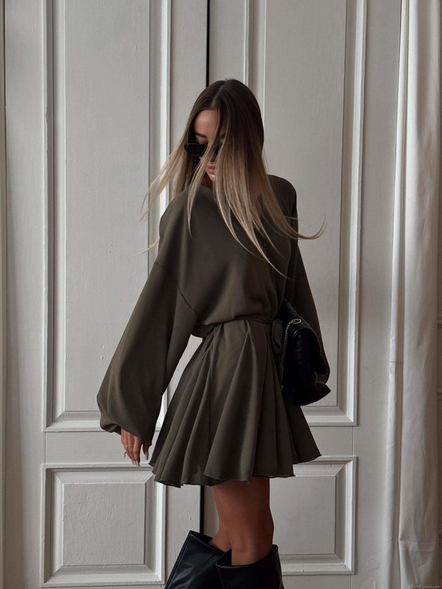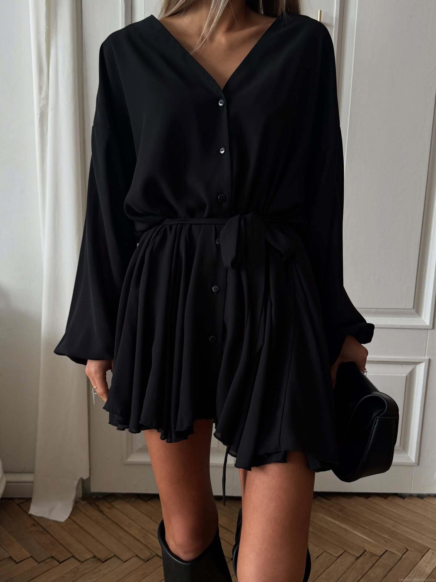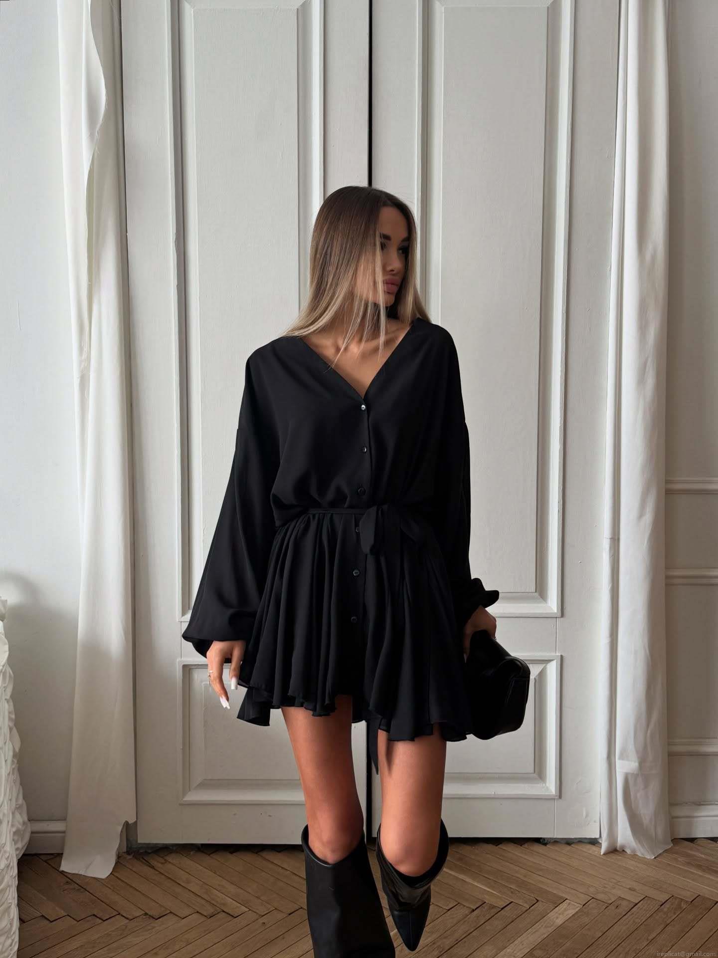 • Women's French Vintage V-Neck Mini Dress Long Lantern Sleeve Chiffon Waist Tie Elegant A-Line Short Skirt For Party Casual Sexy Solid Color Dress