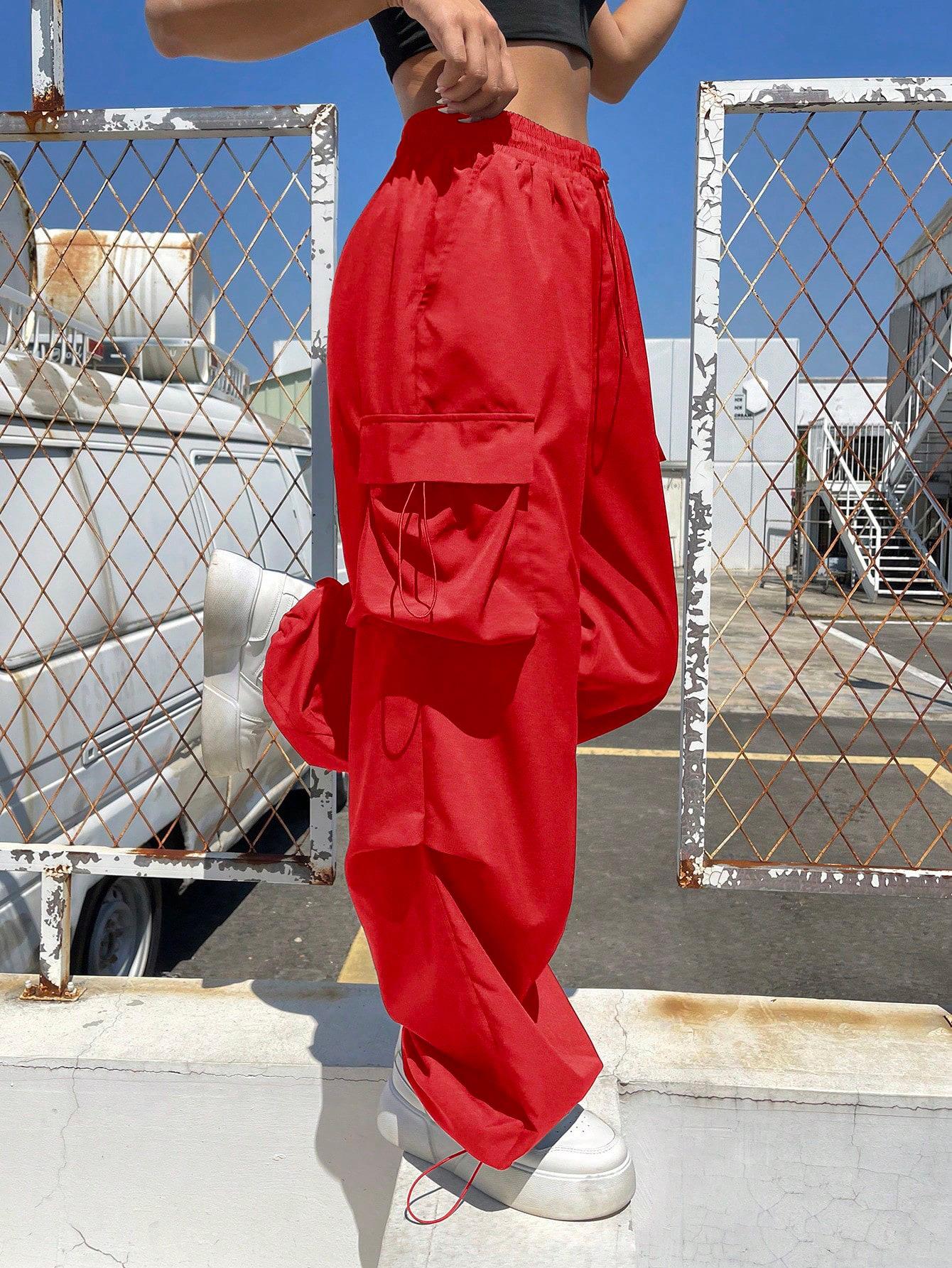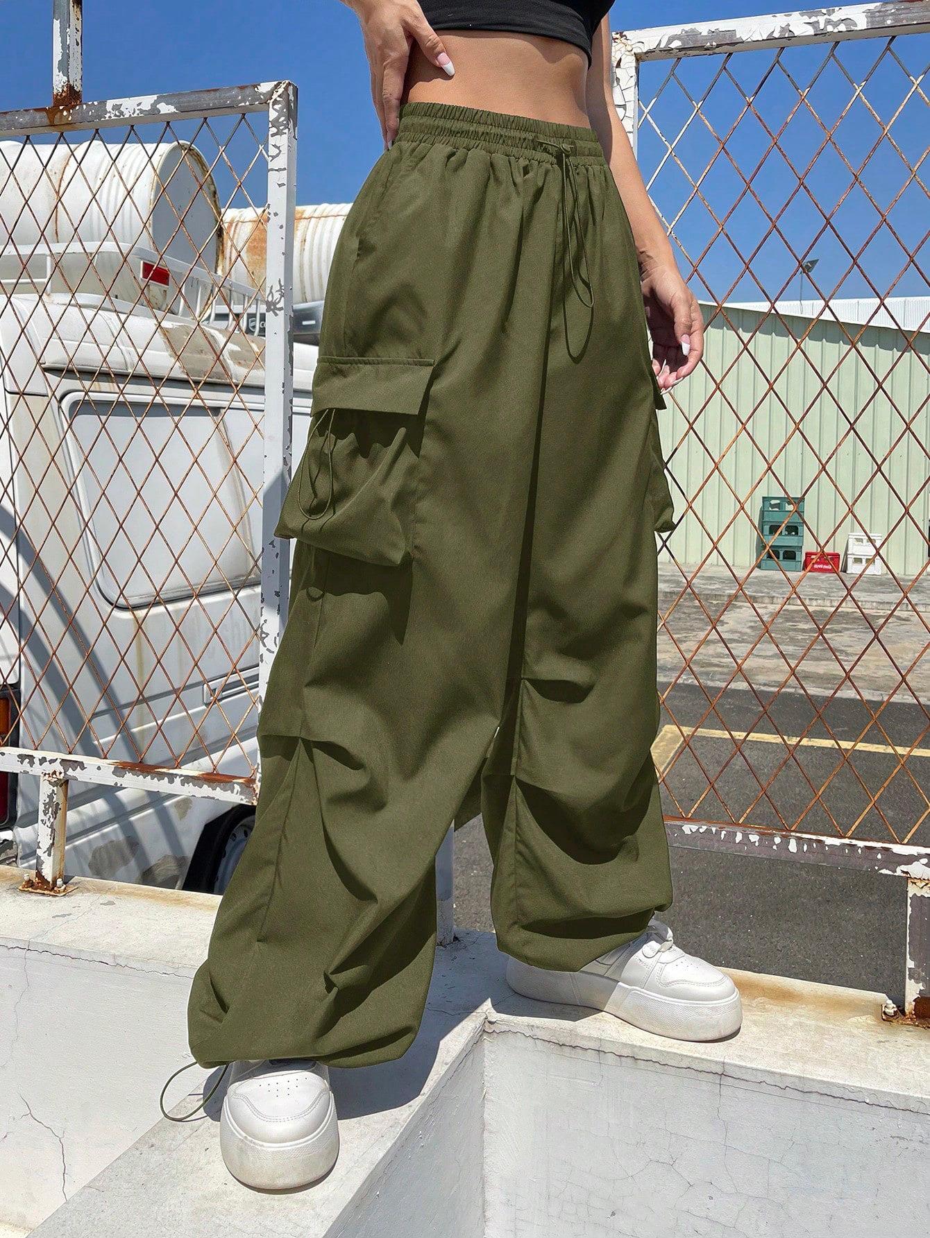 • Women's High Waisted Cargo Pants Multi-Pocket Wide Leg Streetwear Casual Woven Trousers Vintage Y2K Relaxed Fit Drawstring Hem Straight Leg Fashionable Lady Pants