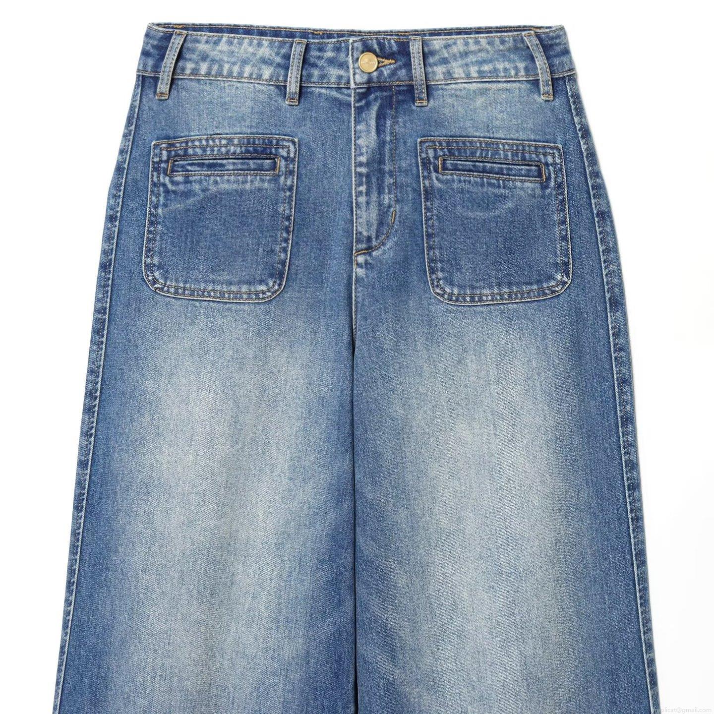 Solid Color, Water Washing And Whitening, High-waisted Design, Wide-leg Cut, Large-size Patch Pocket, Raw Edge Patchwork Trouser Hem