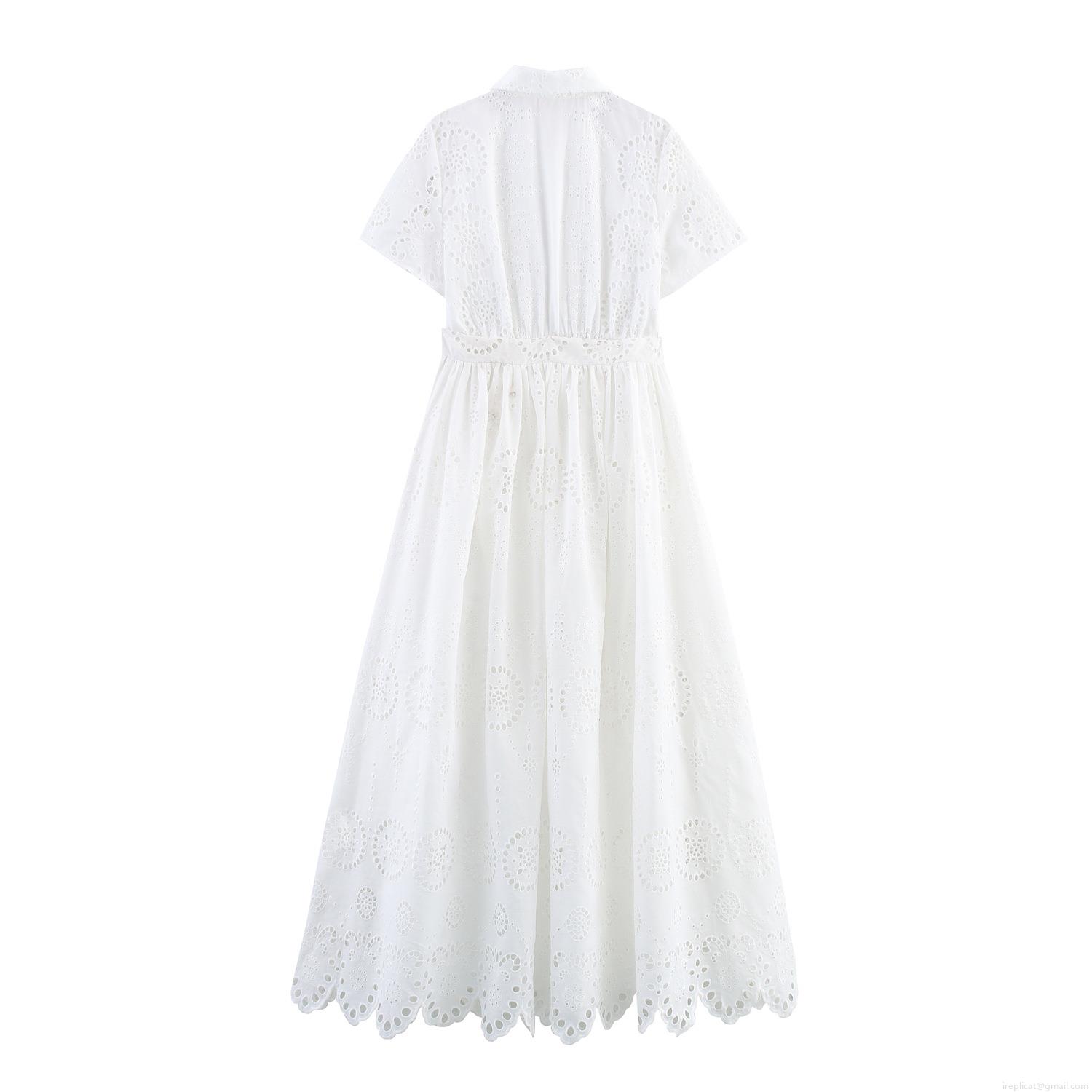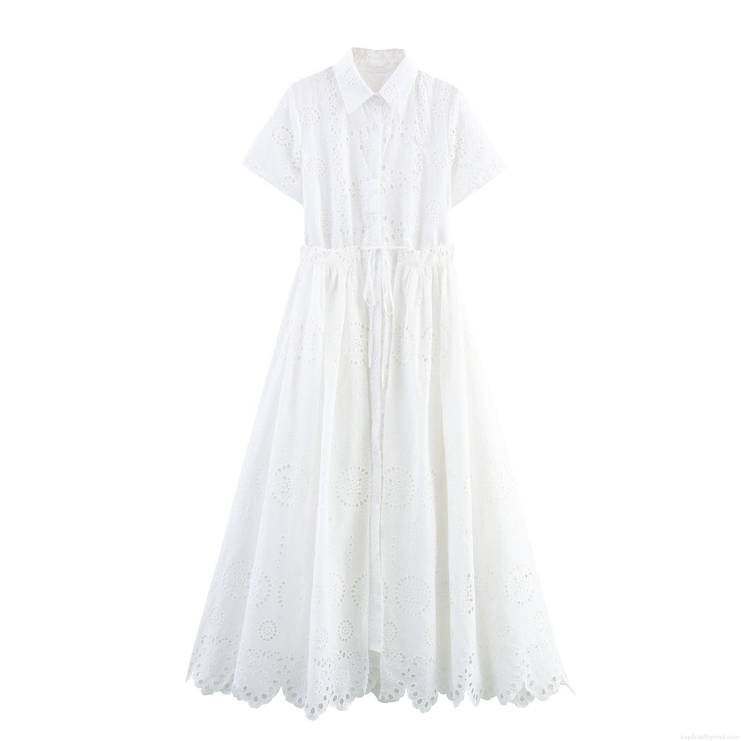 • Women's Hollow Out Embroidery Maxi Dress Elegant Lapel Button Down Shirt Dress French Style White Drawstring High Waist Long Dress Summer Daily Vacation