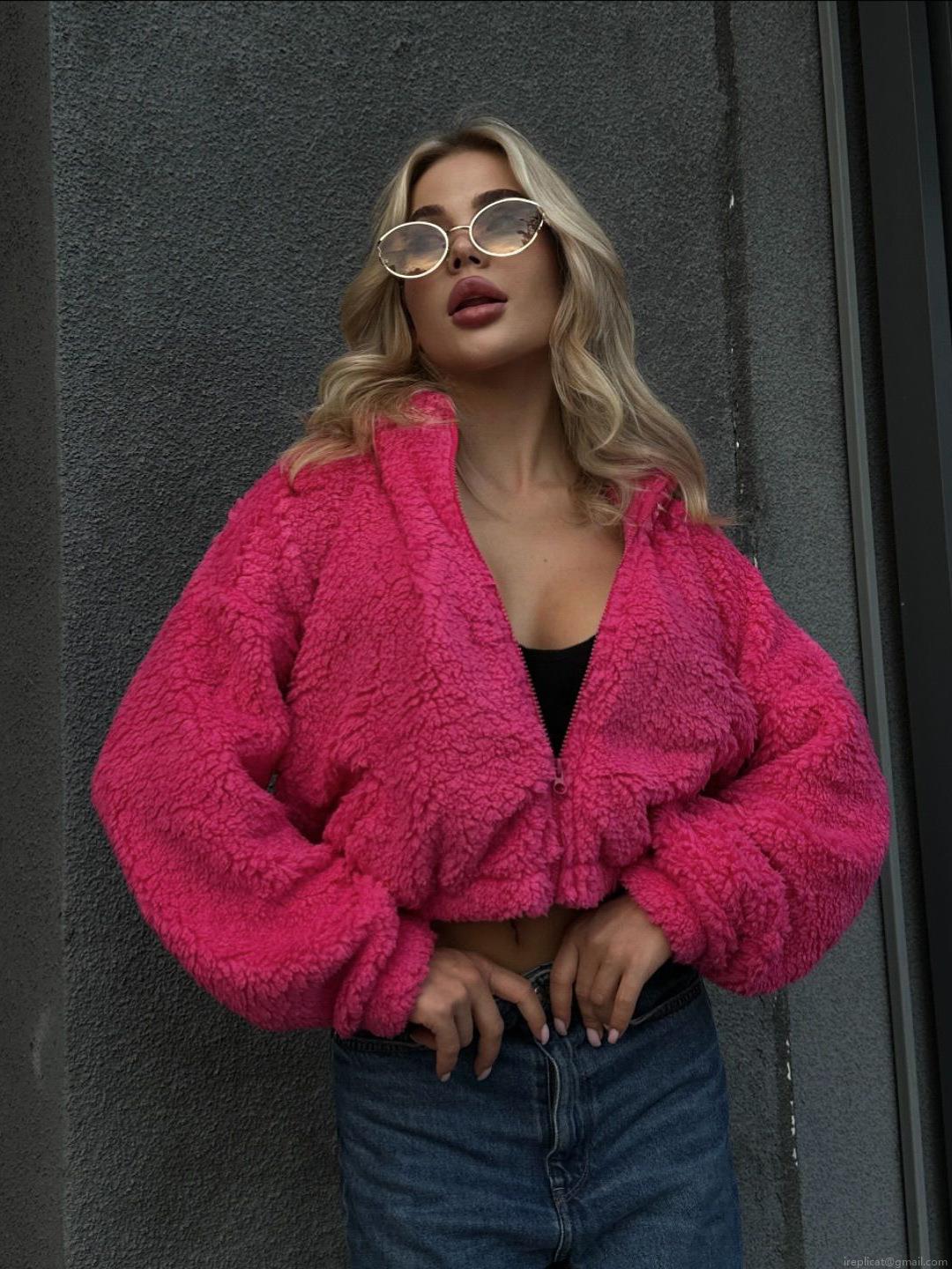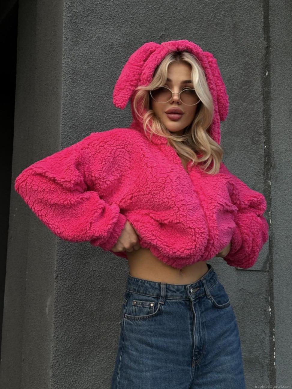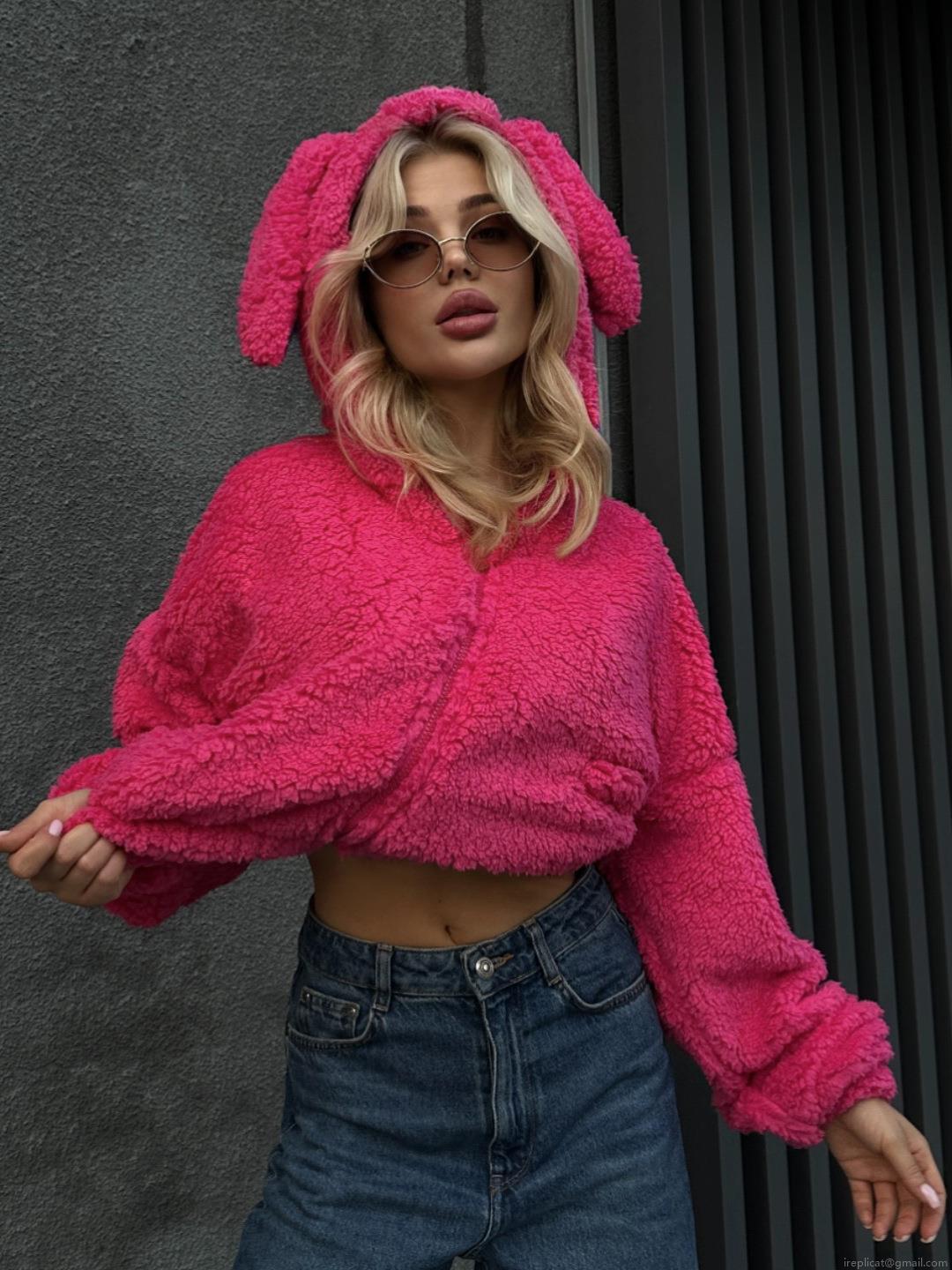 • Women Rose Pink Rabbit Ear Hooded Sweatshirt Zip Up Sherpa Fleece Cropped Hoodie Solid Color Long Sleeve Plush Jacket For Streetwear Autumn Winter