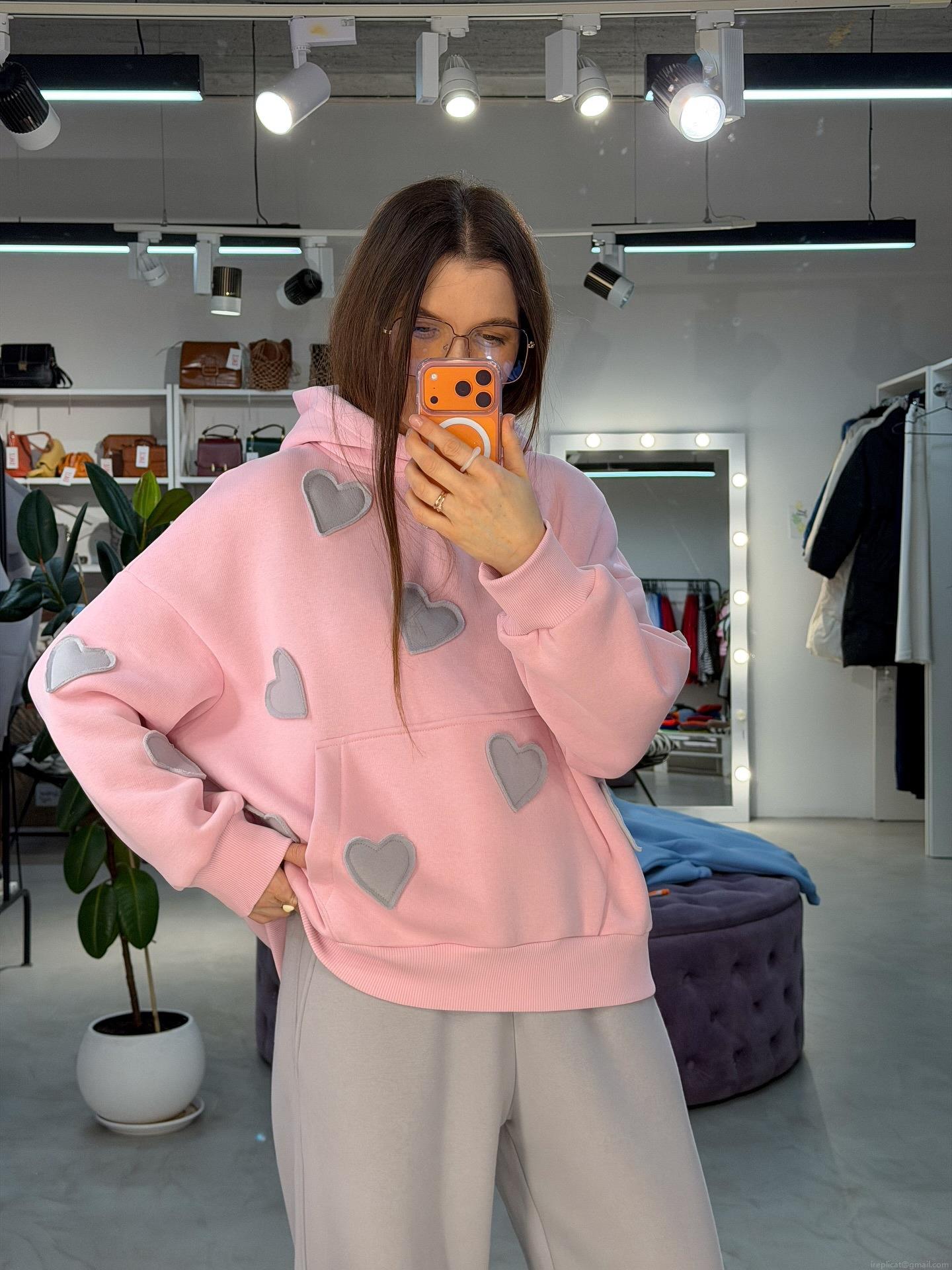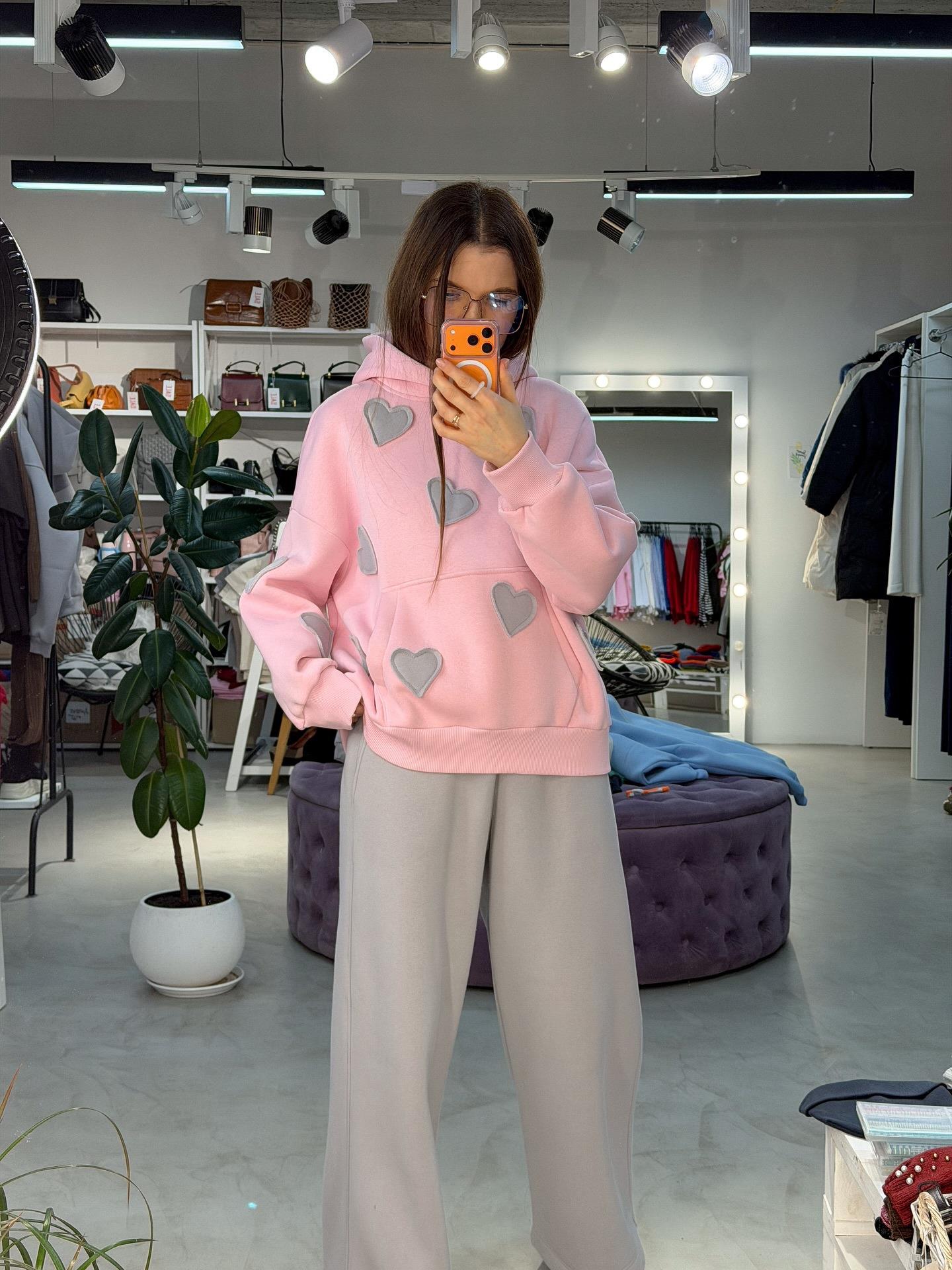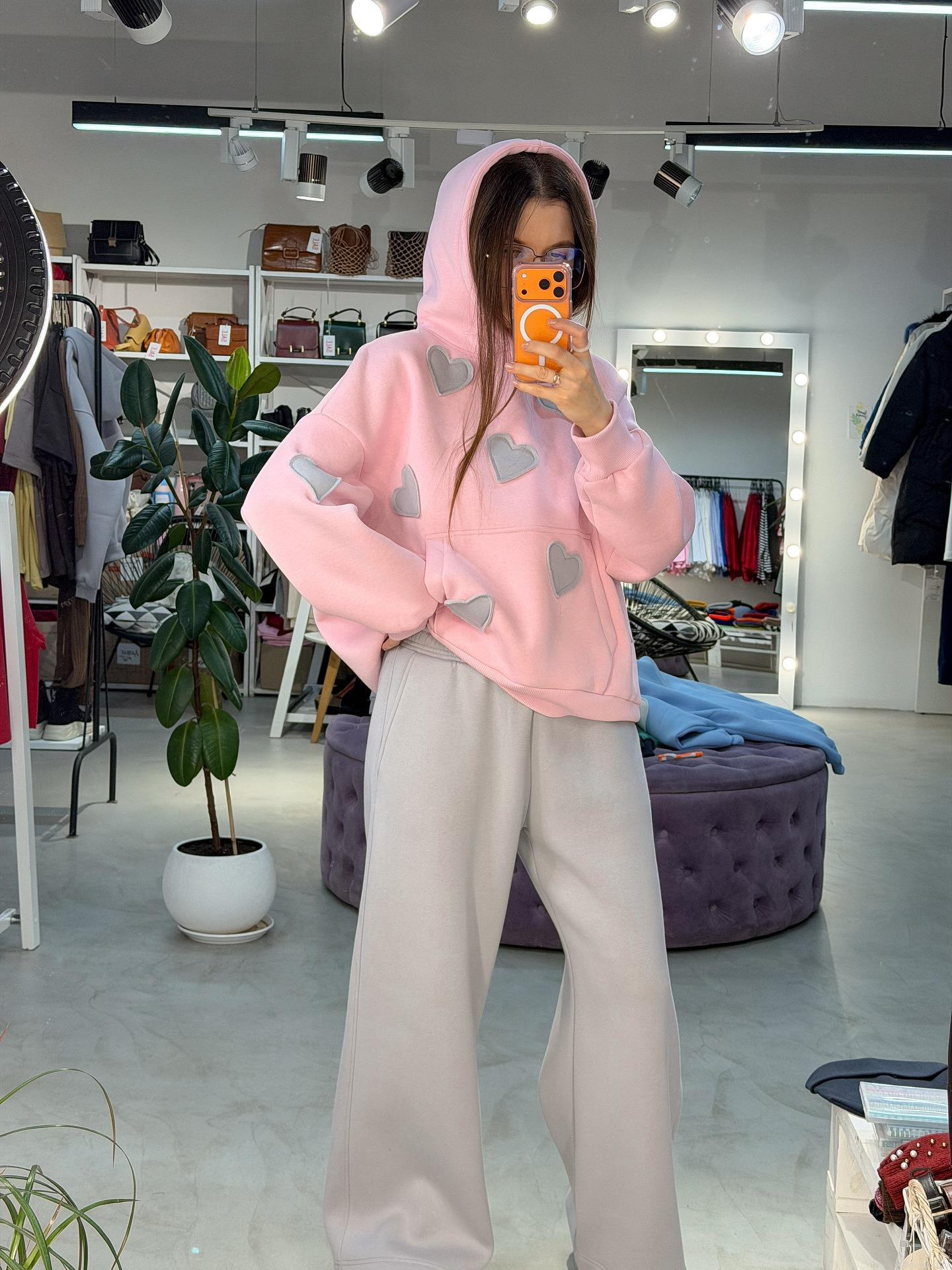 • Women's 100% Cotton Oversized Hoodie Pullover Warm Heart Embroidery Sweatshirt For Valentine's Day Casual Loose Streetwear Pink With Grey Applique Top
