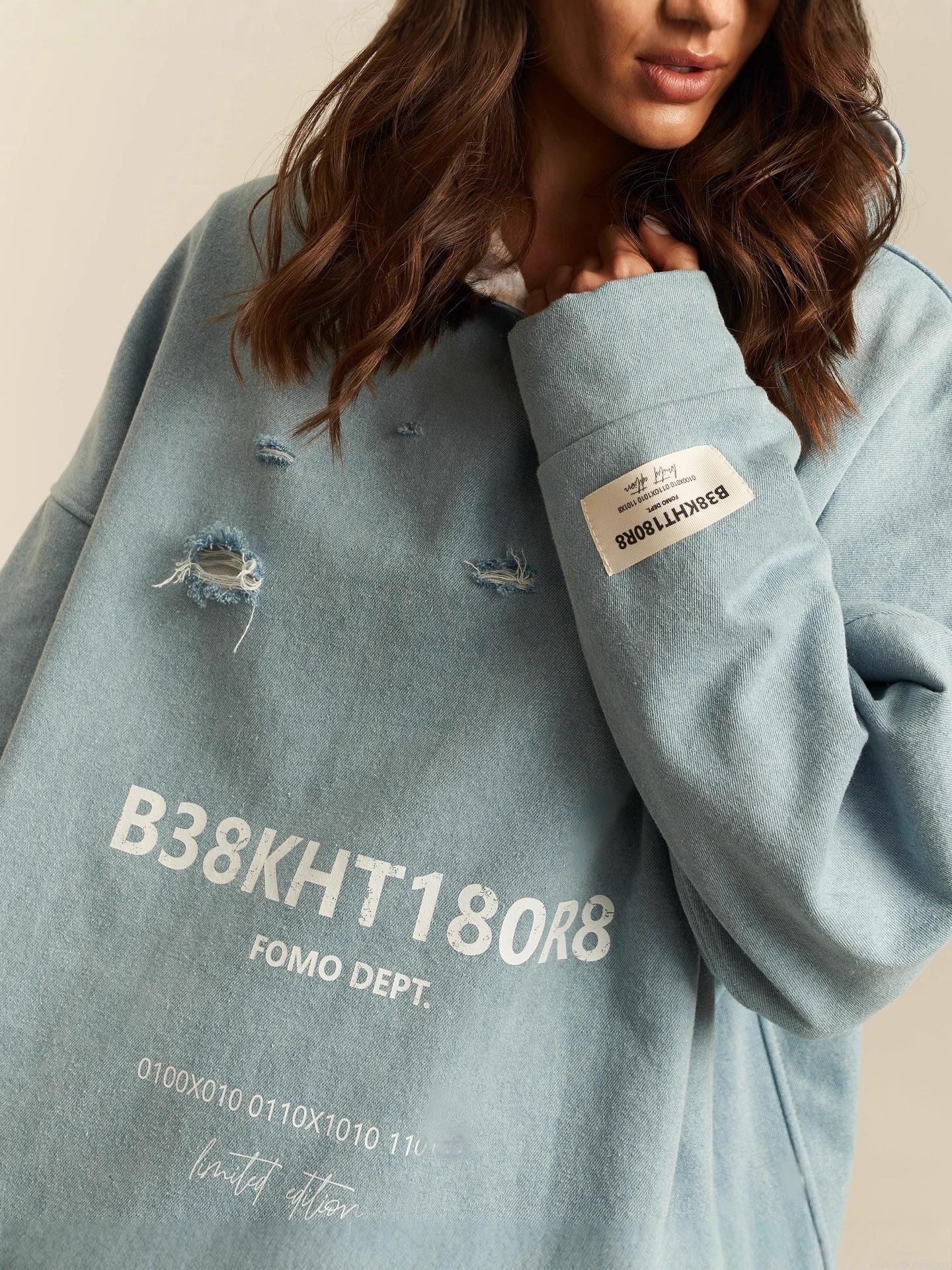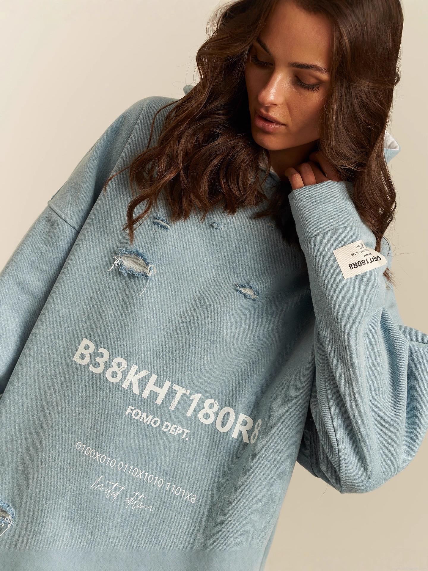Women's American High Street Distressed Oversized Hoodie Light Blue Cotton Blend Letter Print Ripped Pullover Sweatshirt For Streetwear Fashion