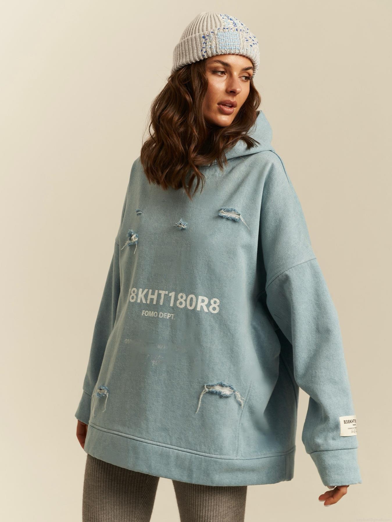 • Women's American High Street Distressed Oversized Hoodie Light Blue Cotton Blend Letter Print Ripped Pullover Sweatshirt For Streetwear Fashion