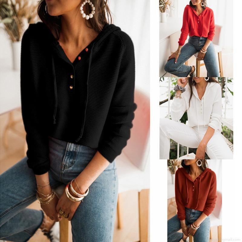 • Women's Casual Waffle Knit Hooded Sweatshirt Cotton Blend Loose Fit Button Neck Long Sleeve Pullover Sweater Top For Fall Winter