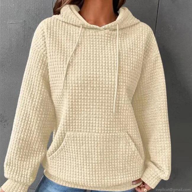 • Women's Casual Waffle Knit Hoodie Sweatshirt Long Sleeve Drawstring Pullover Solid Color Polyester Hooded Top With Kangaroo Pocket For Daily Loungewear