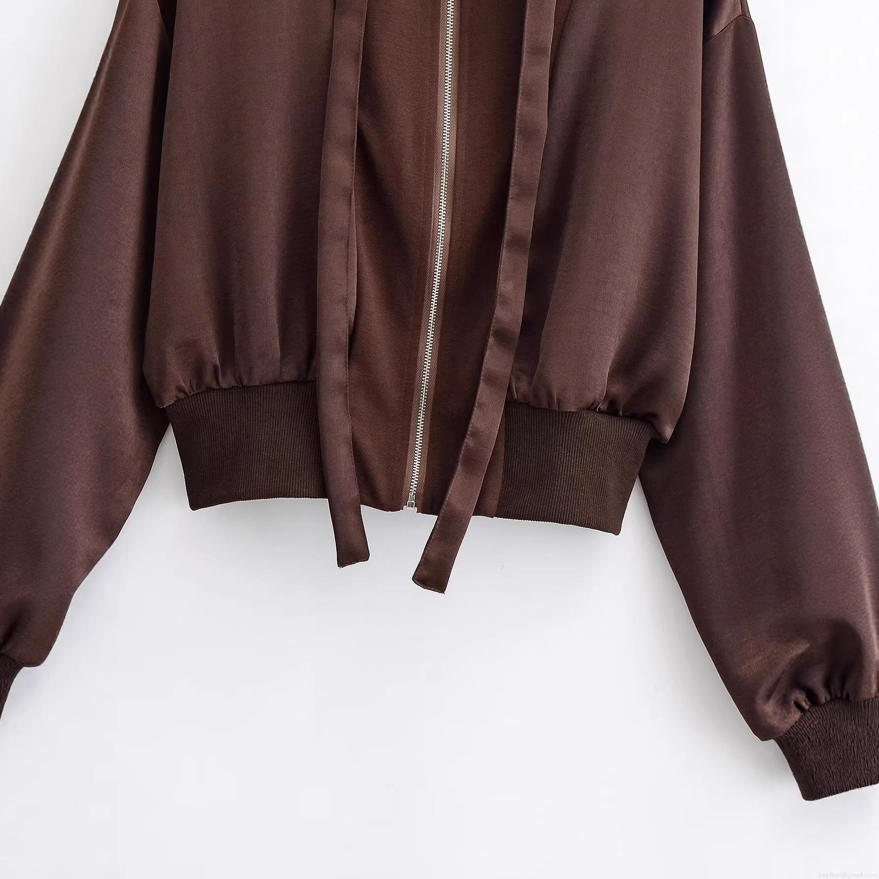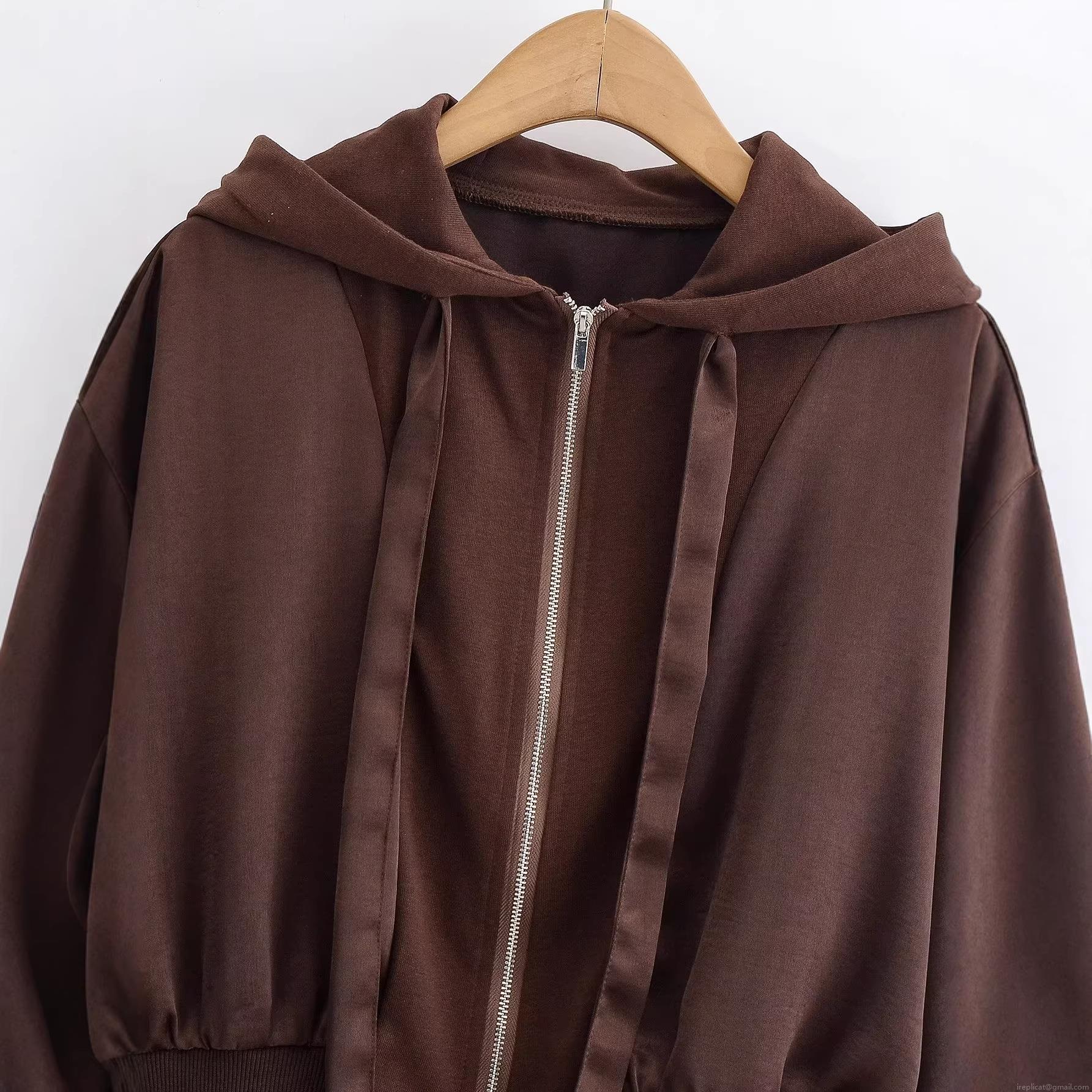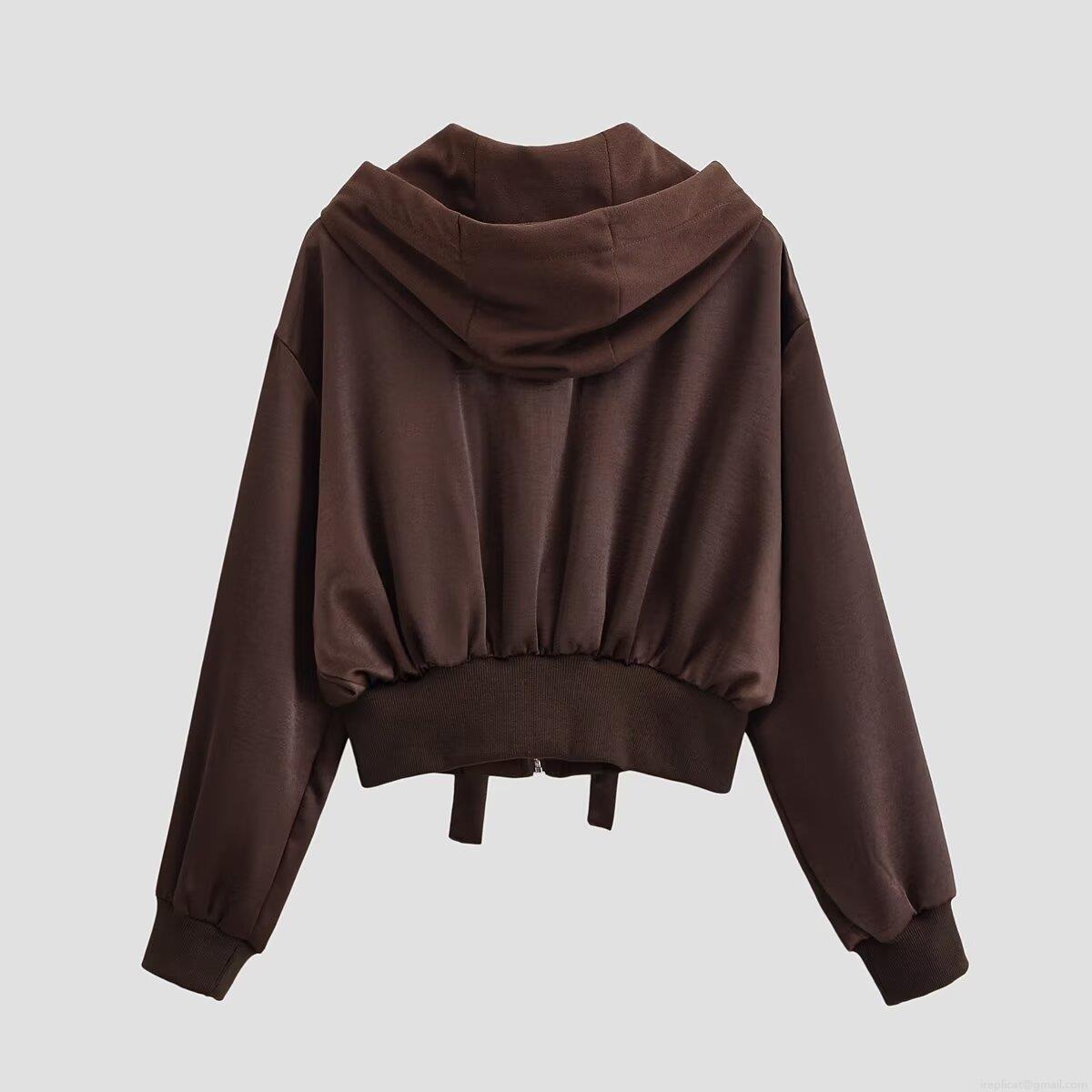 • Women's Cropped Hooded Zip-Up Sweatshirt Jacket 100% Polyester Solid Color Drawstring Long Sleeve Ribbed Hem Coffee Brown Casual Streetwear Outerwear