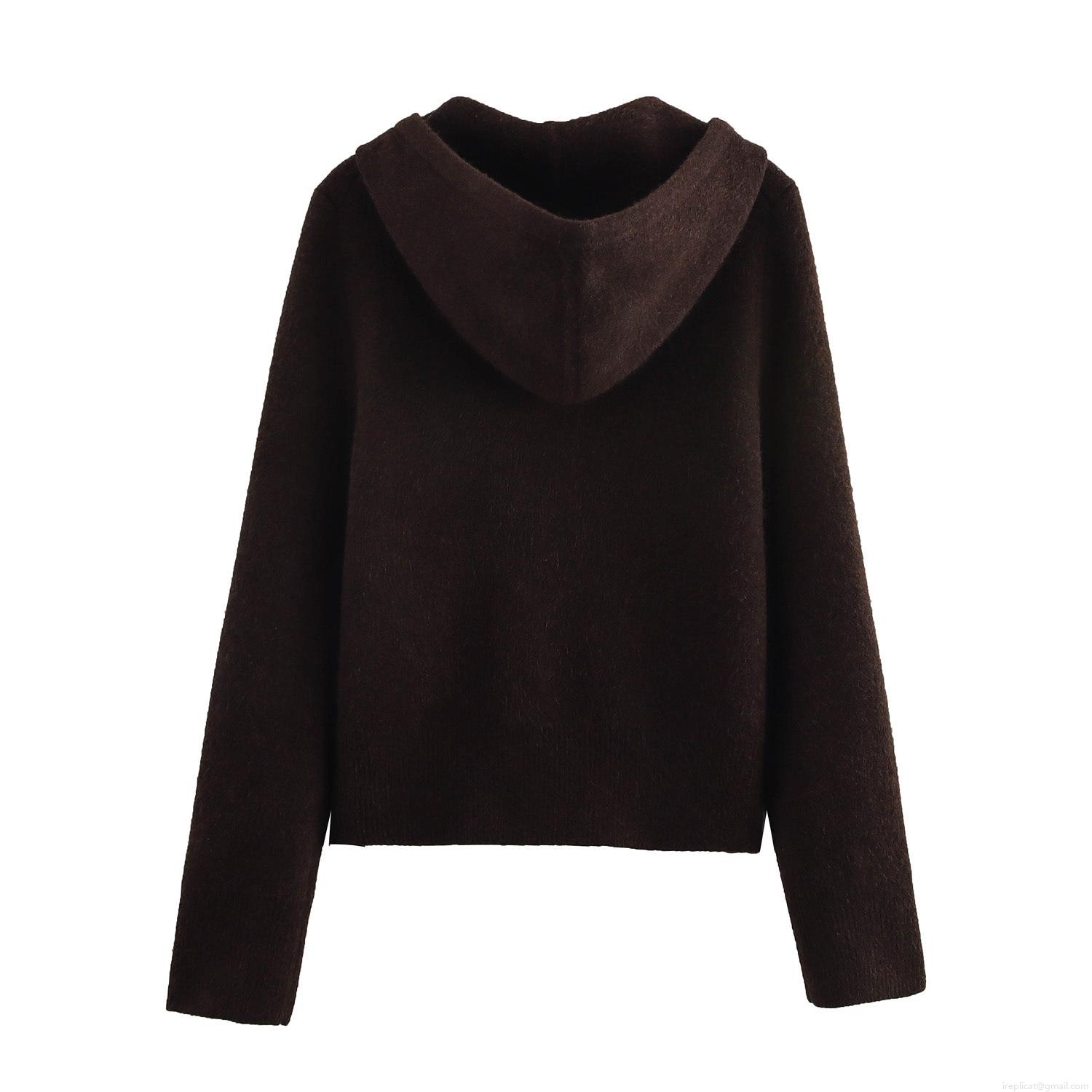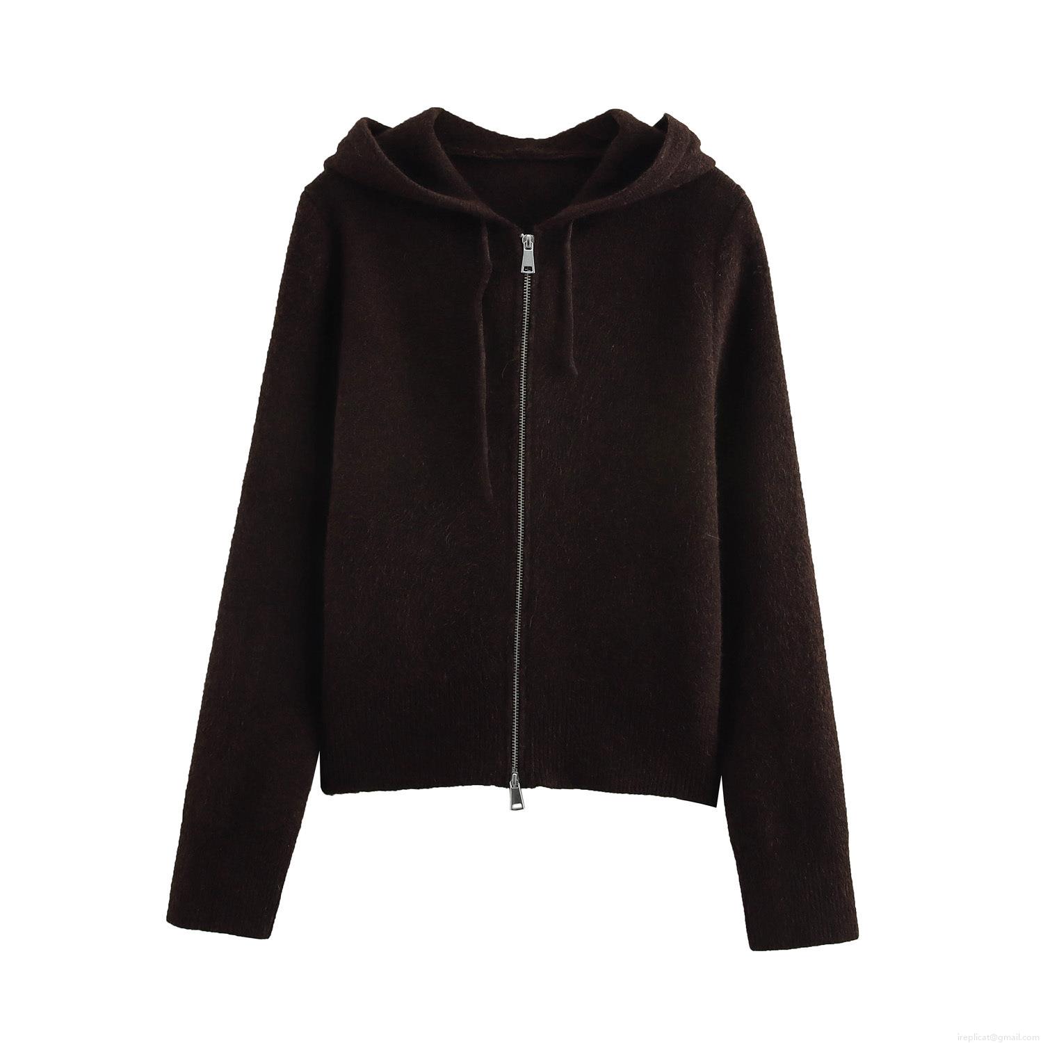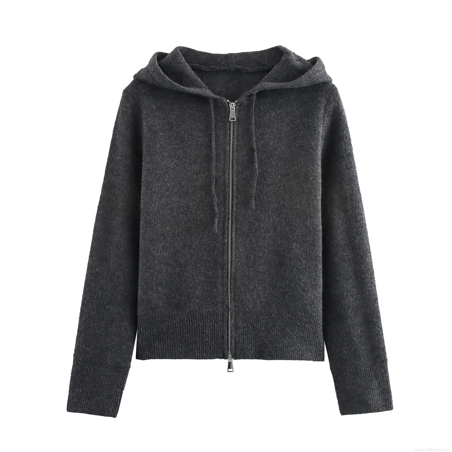 • Women's Fashion Knitted Zip-up Hoodie Short Solid Color Long Sleeve Polyester Sweatshirt For Casual Streetwear Western Style Autumn Winter Cardigan