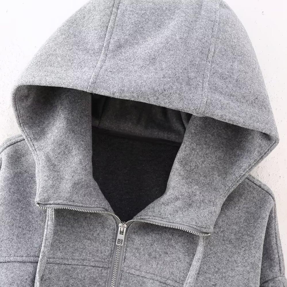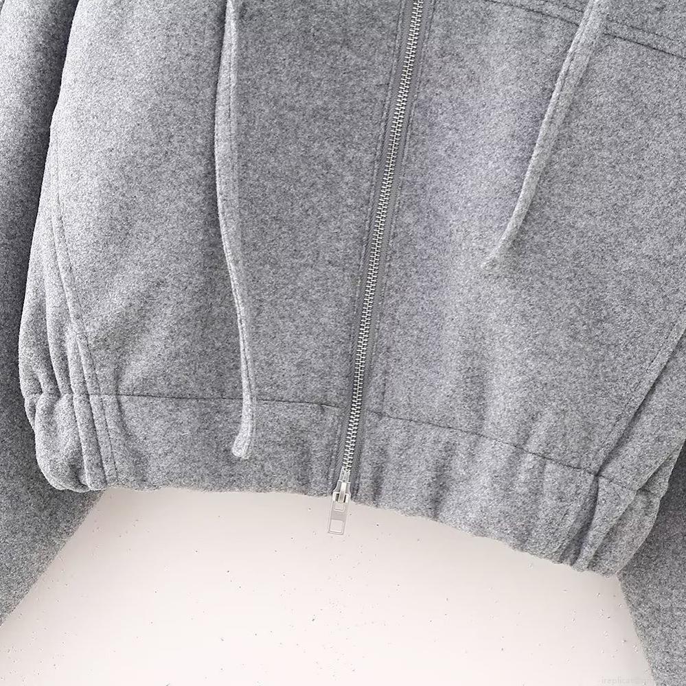 • Women's Fashion Solid Grey Short Hooded Jacket Zip Up Crop Hoodie Sweatshirt Long Sleeve Drop Shoulder Top With Drawstring Casual Daily Outerwear