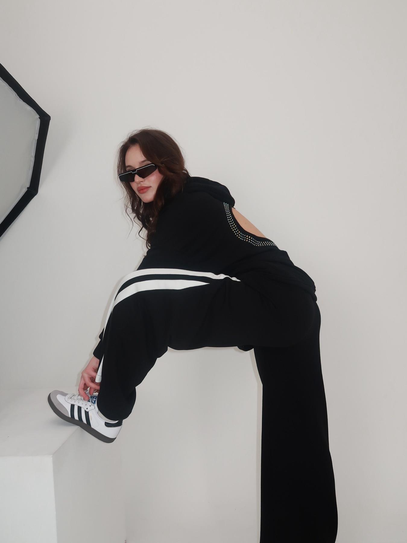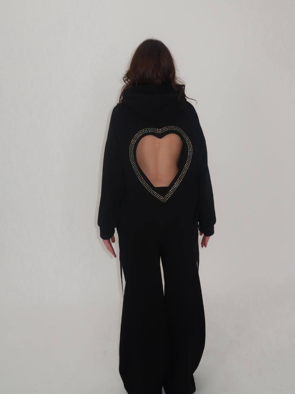 Women's Heart Cutout Rhinestone Hoodie Long Sleeve 100% Cotton Sweatshirt Loose Streetwear Fashion Pullover Top Black