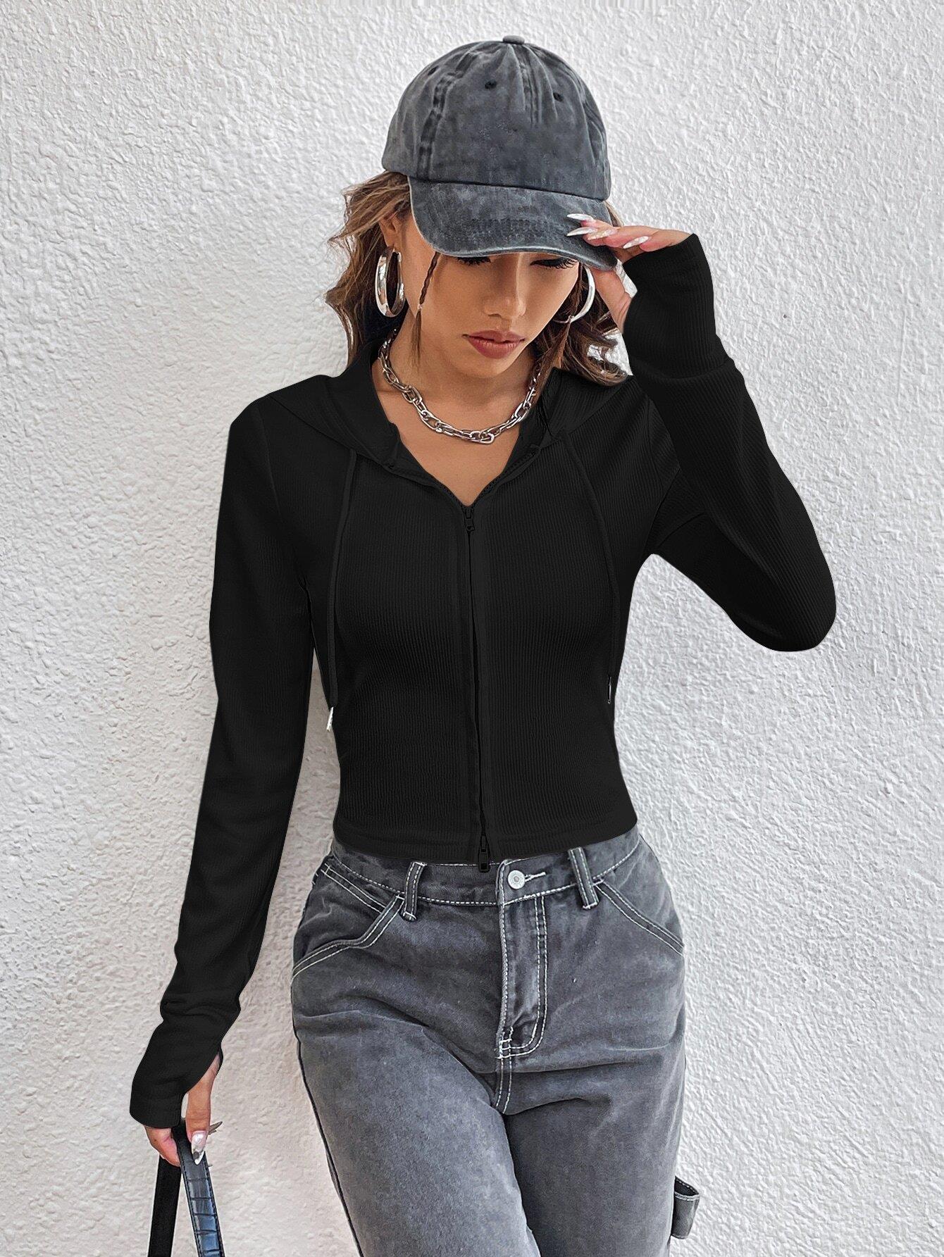 • Women's Hooded Zip-Up Knit Top Viscose Polyester Elastane Ribbed Slim Fit Short Cardigan Streetwear Long Sleeve Fall T-Shirt For Women