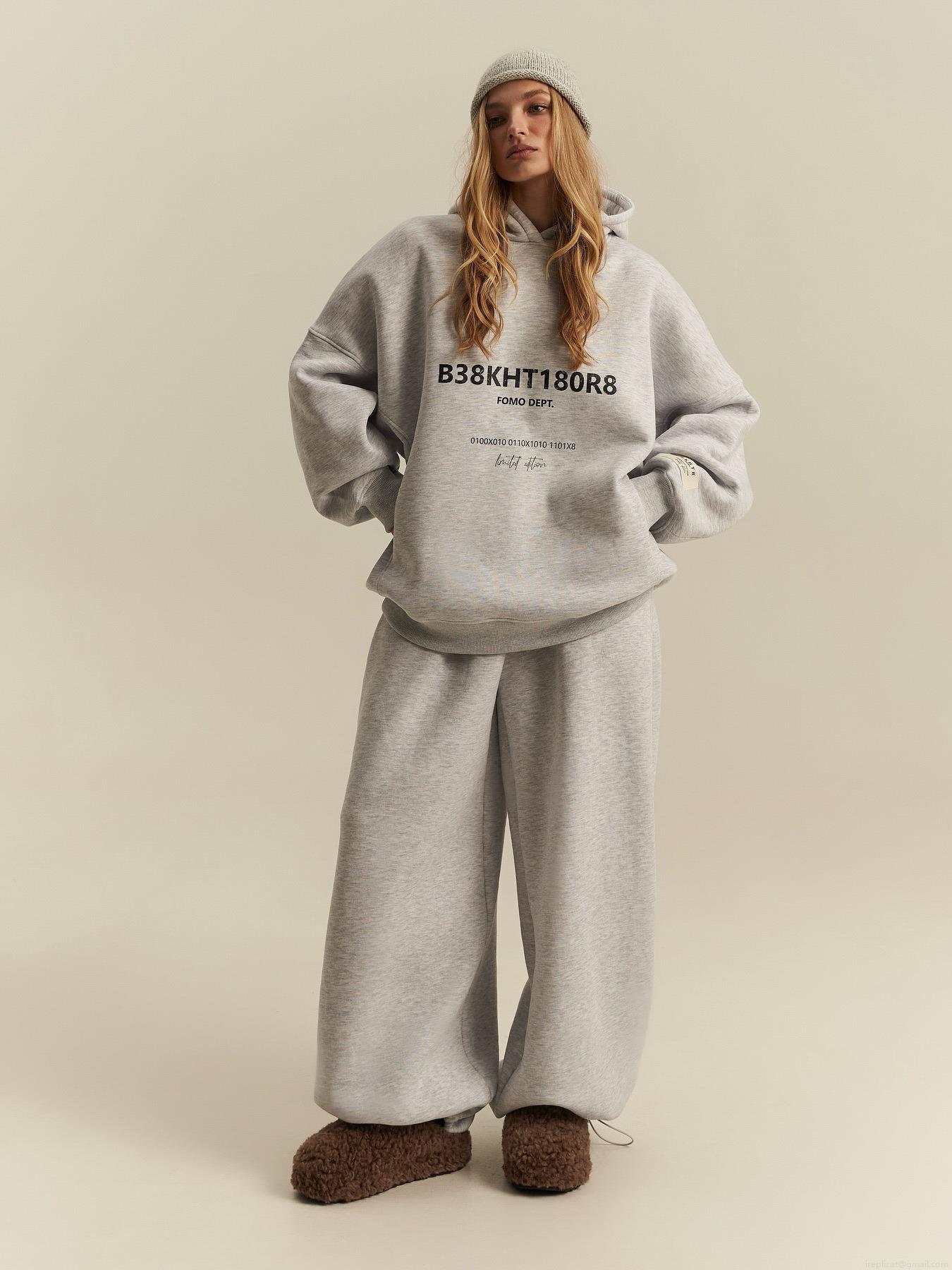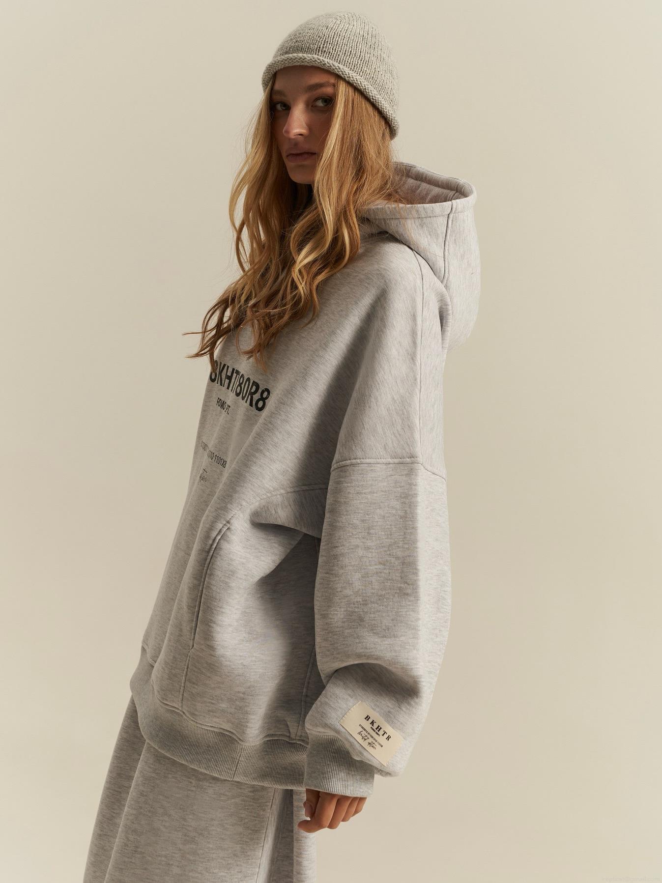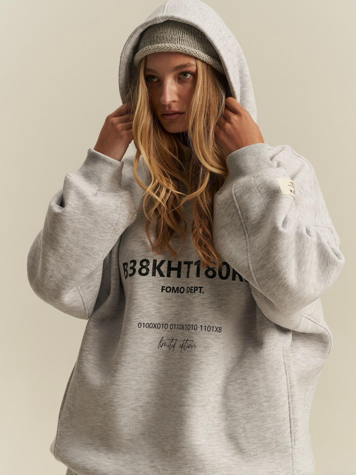 Women's Oversized Hooded Sweatshirt 100% Cotton Letter Print Long Sleeve Pullover Autumn Winter Streetwear Casual Loose Hoodie Jacket Gray