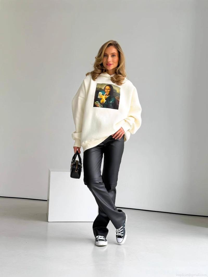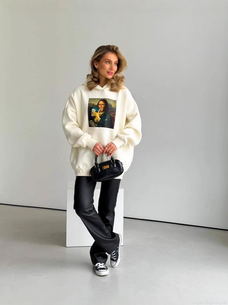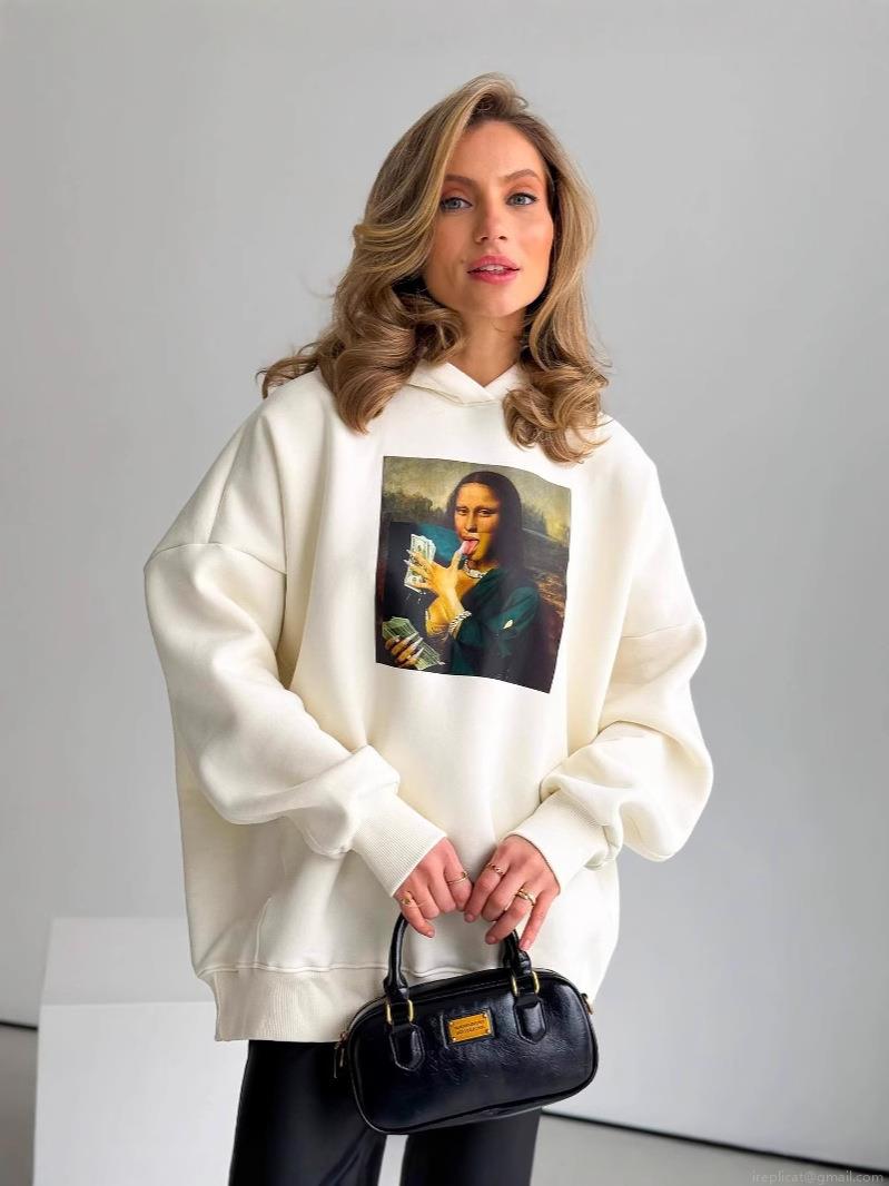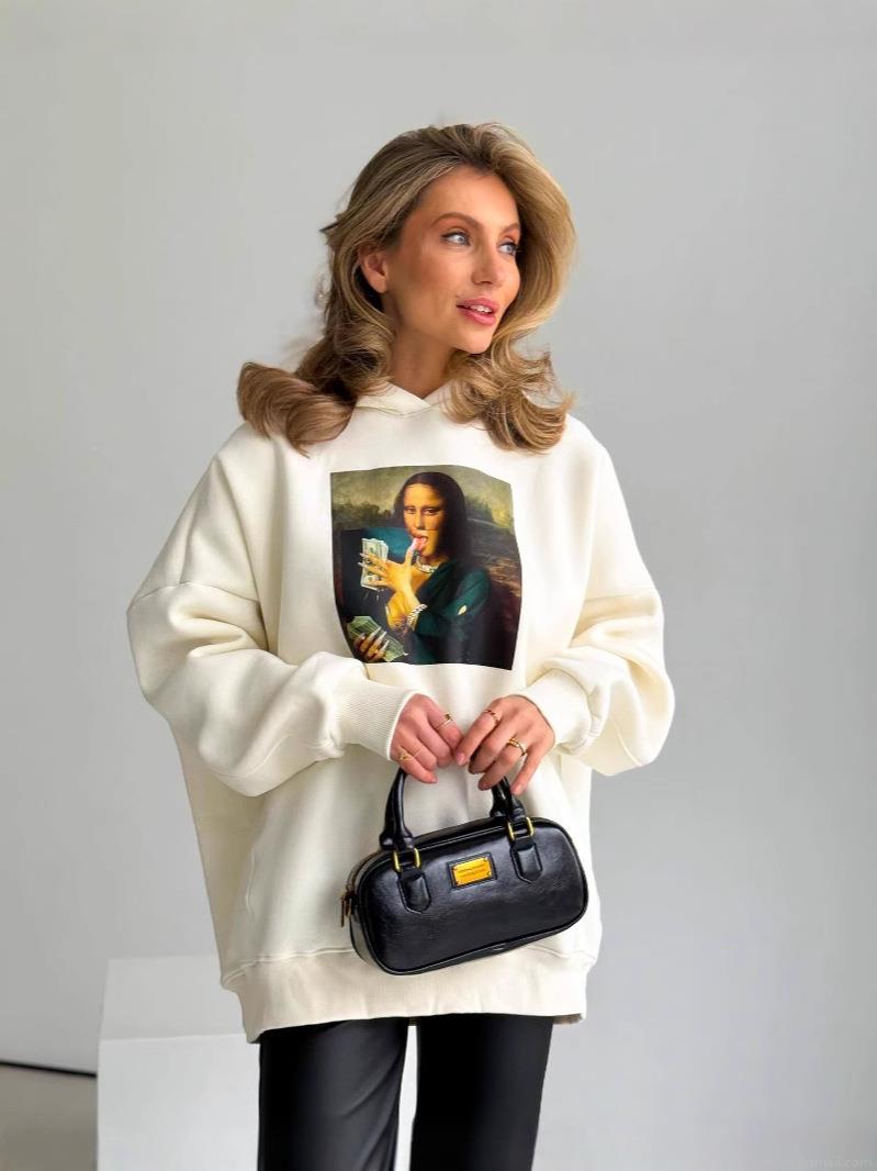 • Women's Oversized Hoodie Funny Mona Lisa Graphic Print Long Sleeve Hooded Sweatshirt Cotton Blend Streetwear Cream White Casual Pullover Top