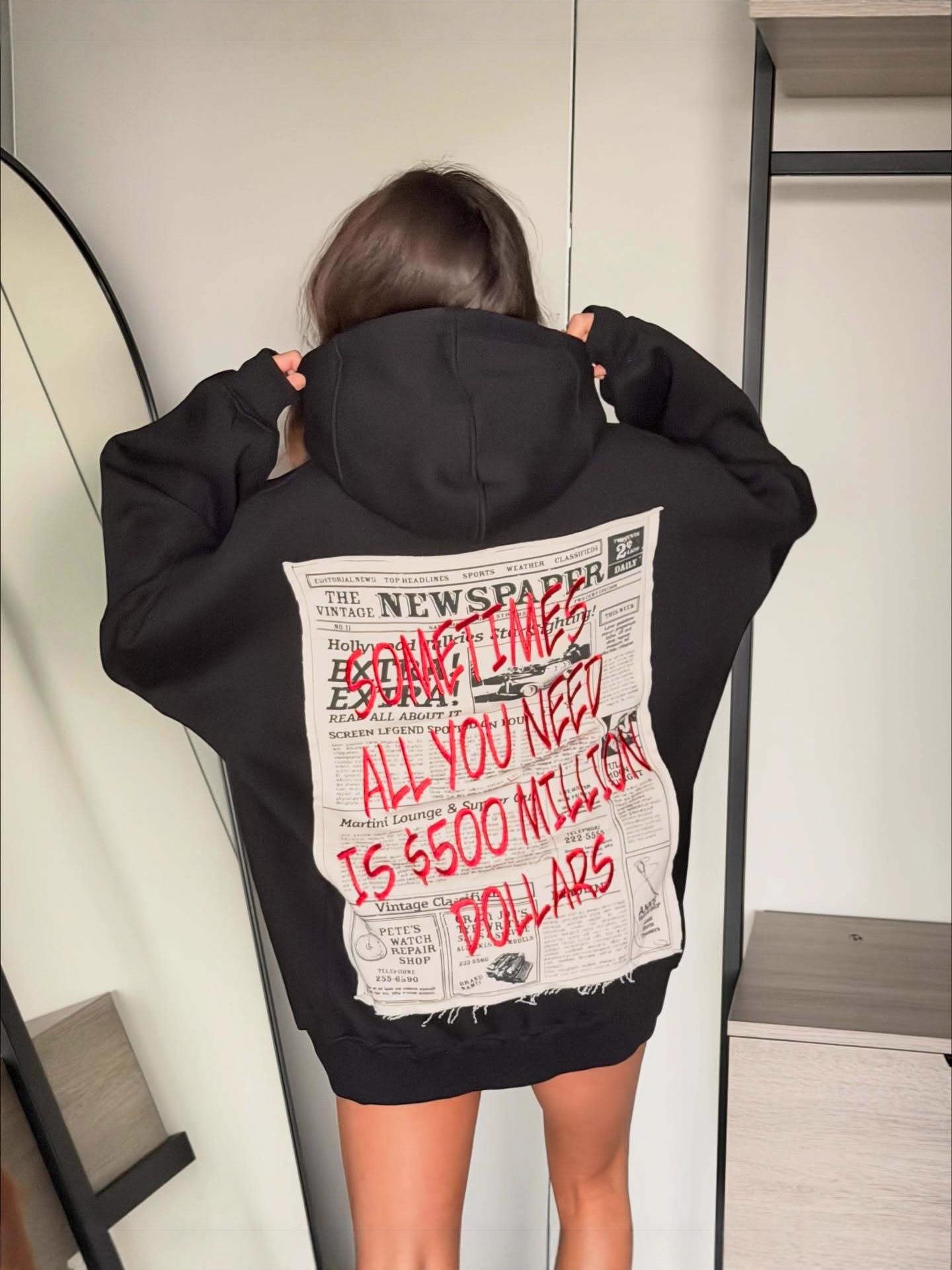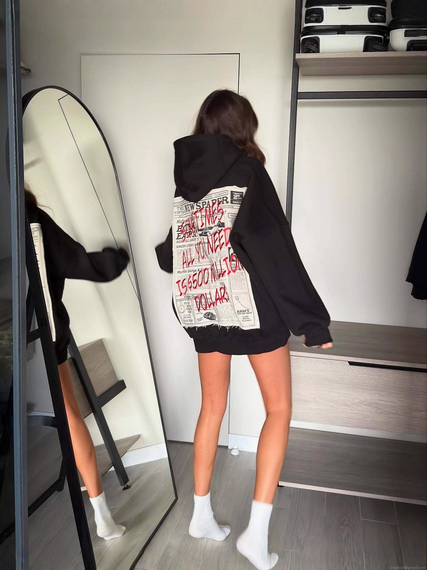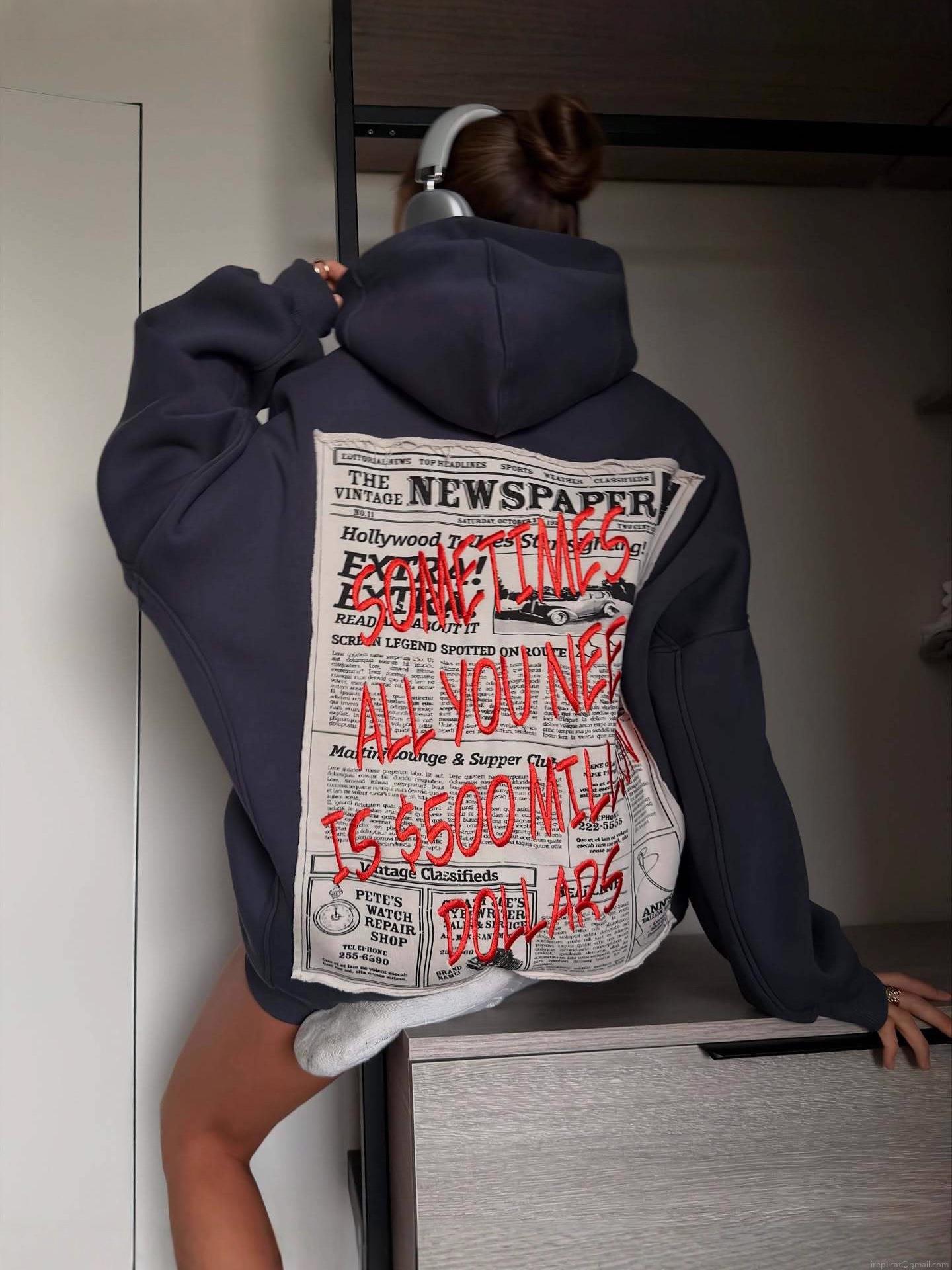 • Women's Oversized Newspaper Print Hoodie Retro American Streetwear Letter Embroidery Drop Shoulder Long Sleeve Pullover Sweatshirt With Pocket