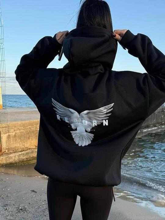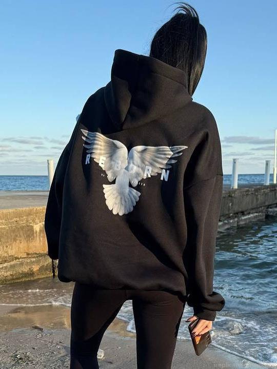 • Women's Reborn Letter Pigeon Print Oversized Hoodie Cotton Blend Long Sleeve Hooded Fleece Lined Sweatshirt Streetwear Casual Loose Fit Pullover Winter Top