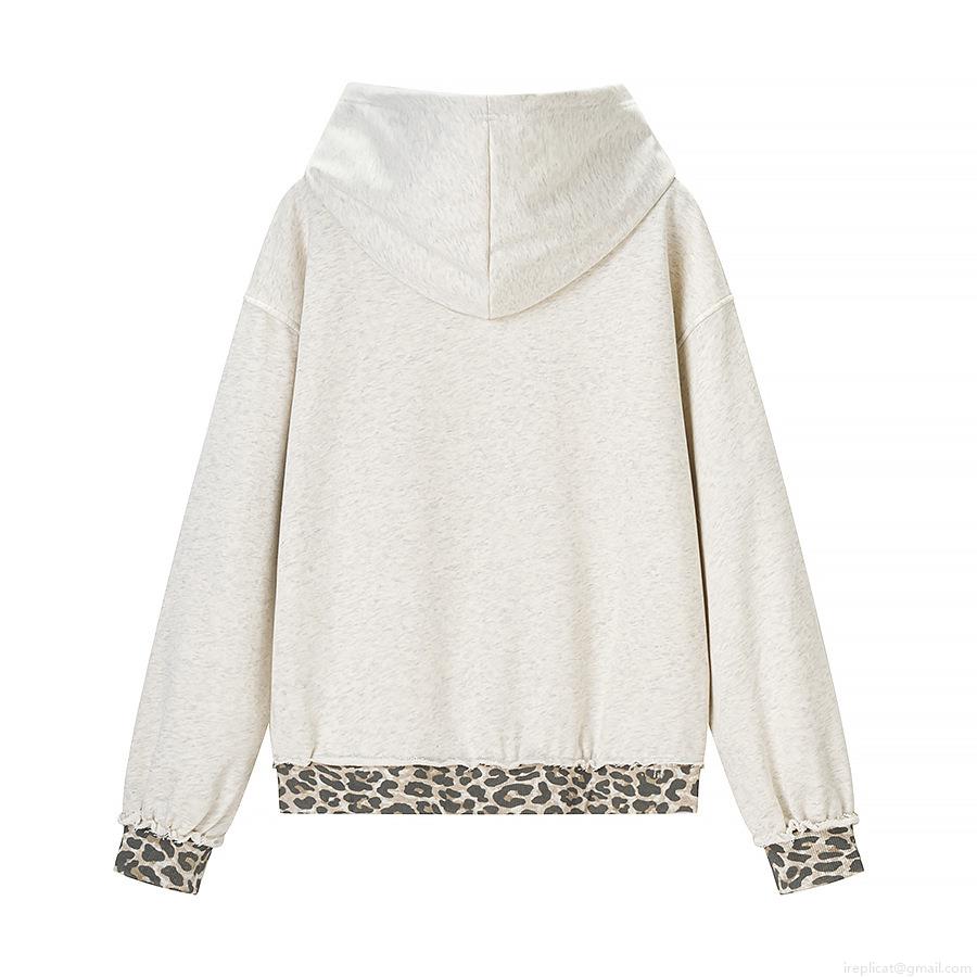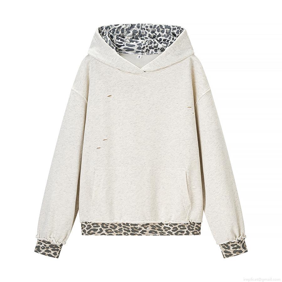 Women's Fashion Leopard Splicing Hoodie Distressed Long Sleeve Cotton Blend Pullover Sweatshirt Oatmeal Streetwear Casual Loose Tops