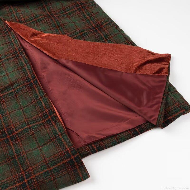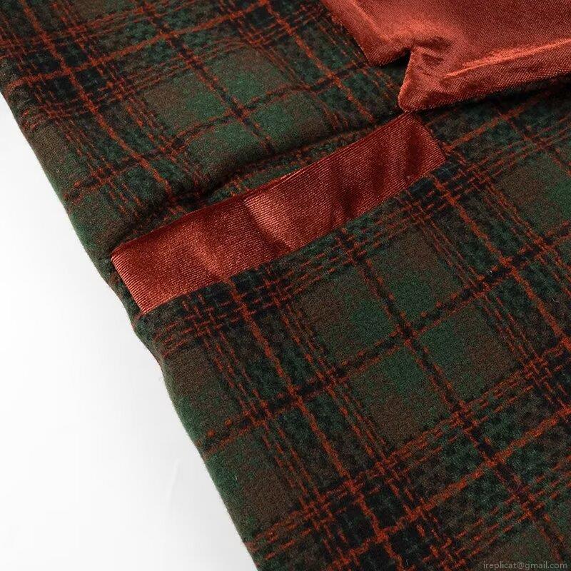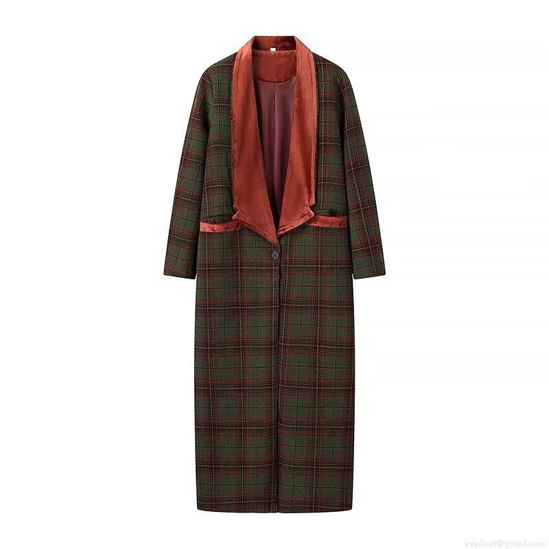 • British Style Women Plaid Long Coat With Velvet Lapel Patchwork Single Breasted Polyester Overcoat For Autumn Winter Office Commute Streetwear