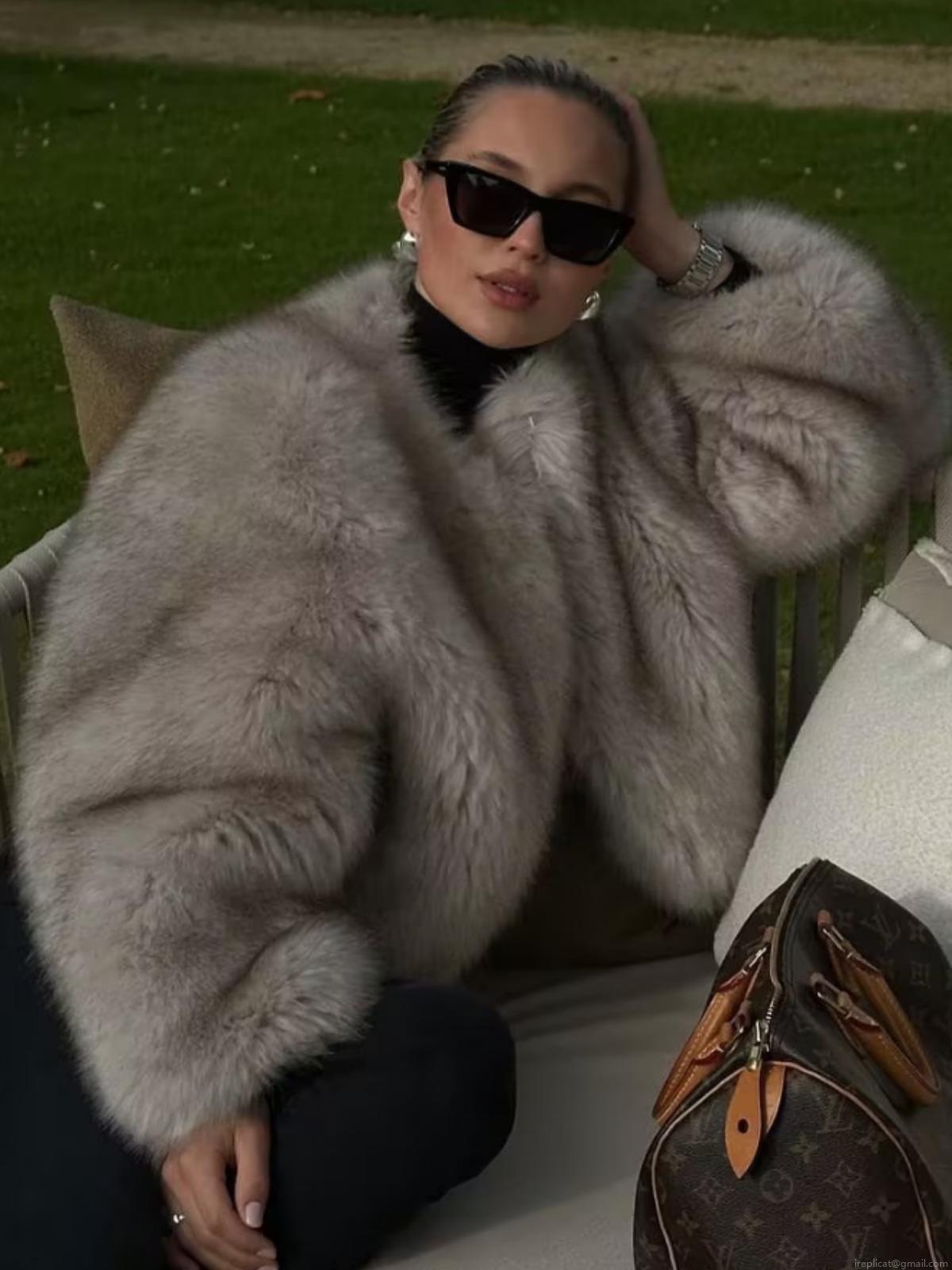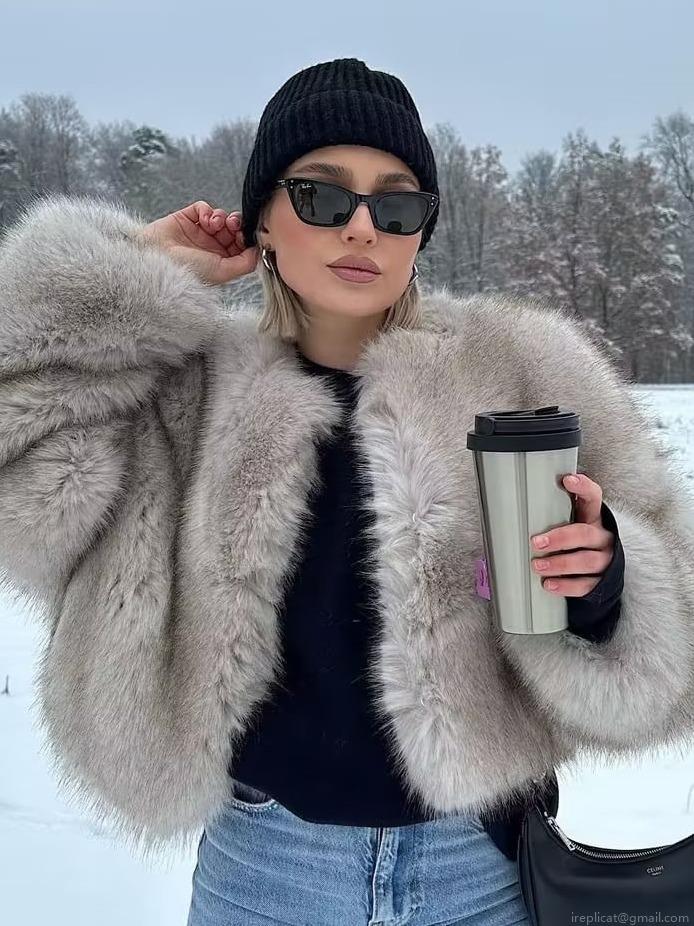 • Chic Women's Faux Fur Crop Jacket Round Neck Long Sleeve Beige Winter Outwear Thick Warm Coat With Polyester Lining For Women