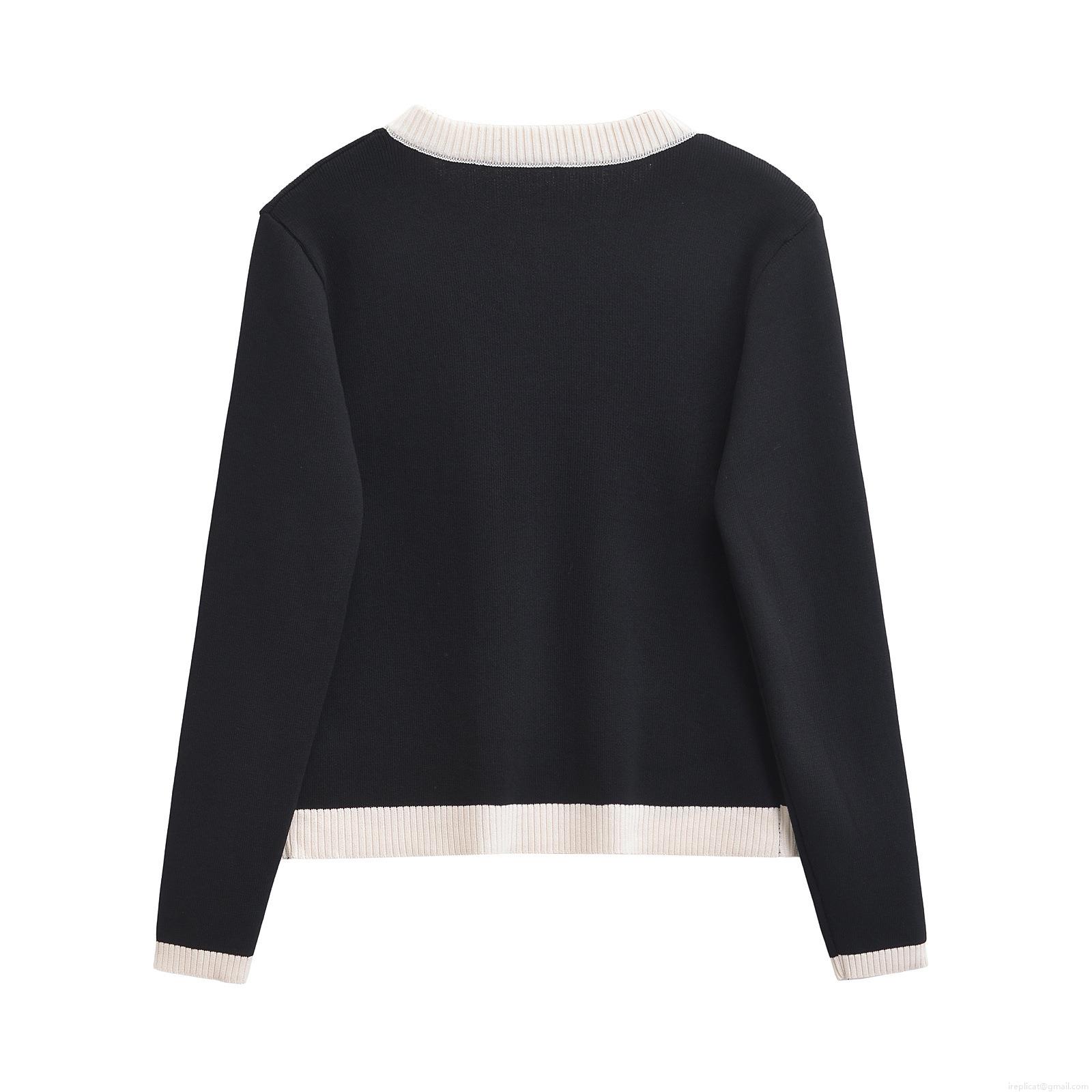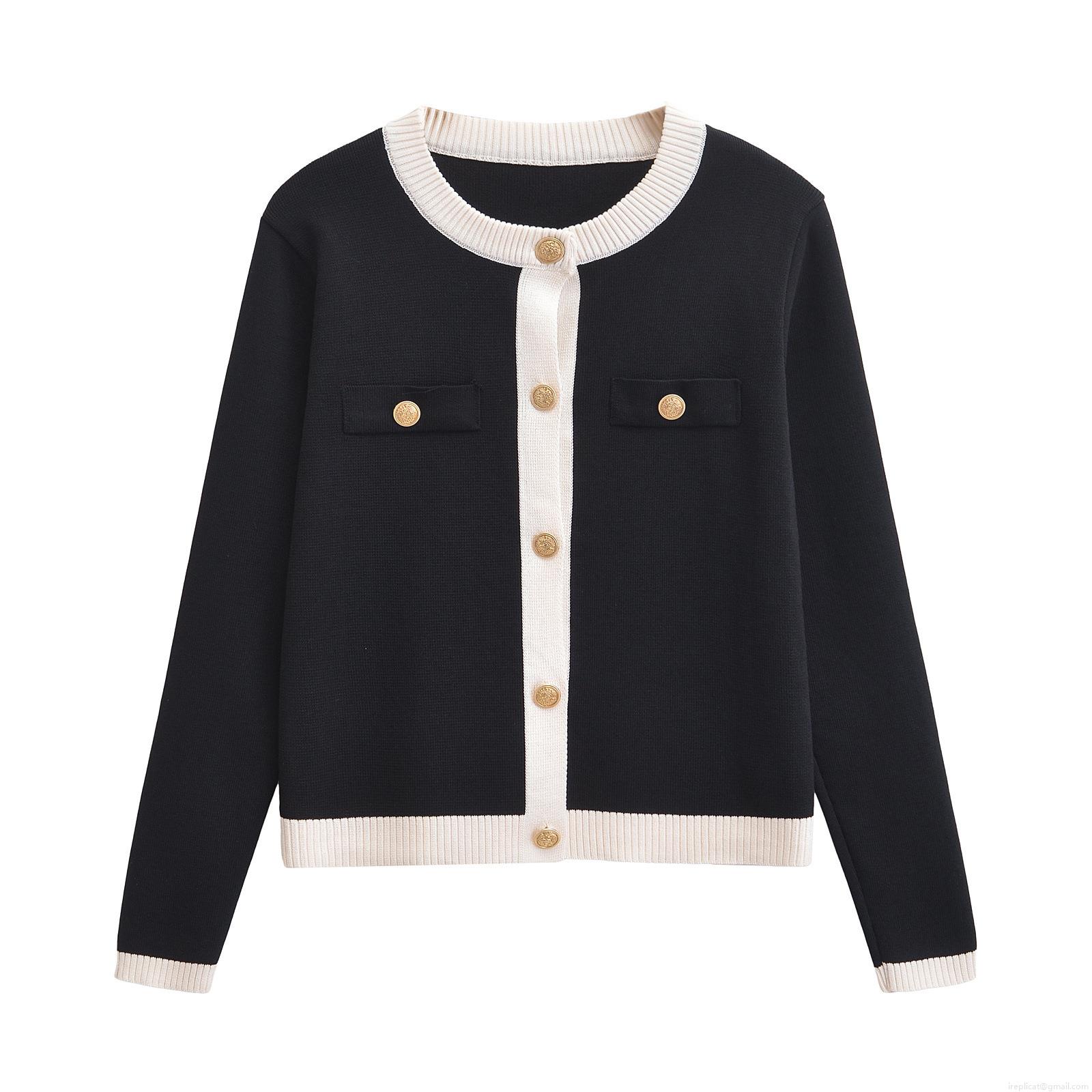 • Elegant Women Knit Cardigan Jacket Polyester Contrast Trim Gold Button Long Sleeve Round Neck Sweater For Office Daily Commute Fashion Outerwear