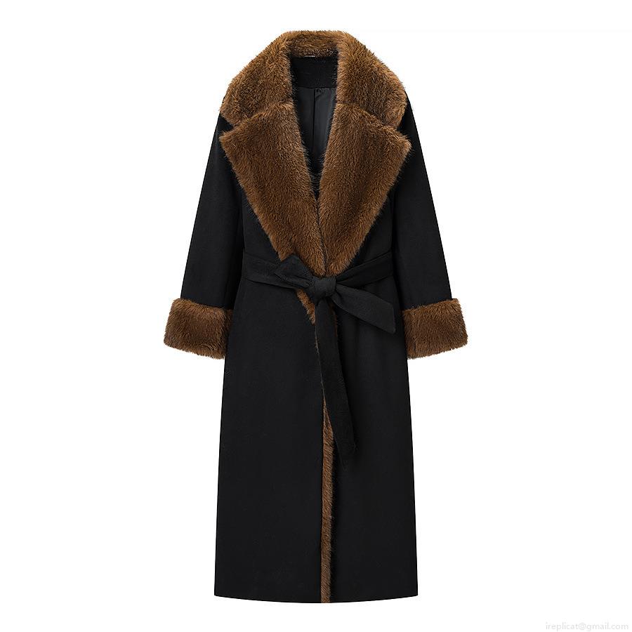 • Elegant Women's Long Coat With Faux Fur Collar And Cuffs Patchwork Polyester Belted Wrap Overcoat For Winter Autumn Daily Dating Women Clothing