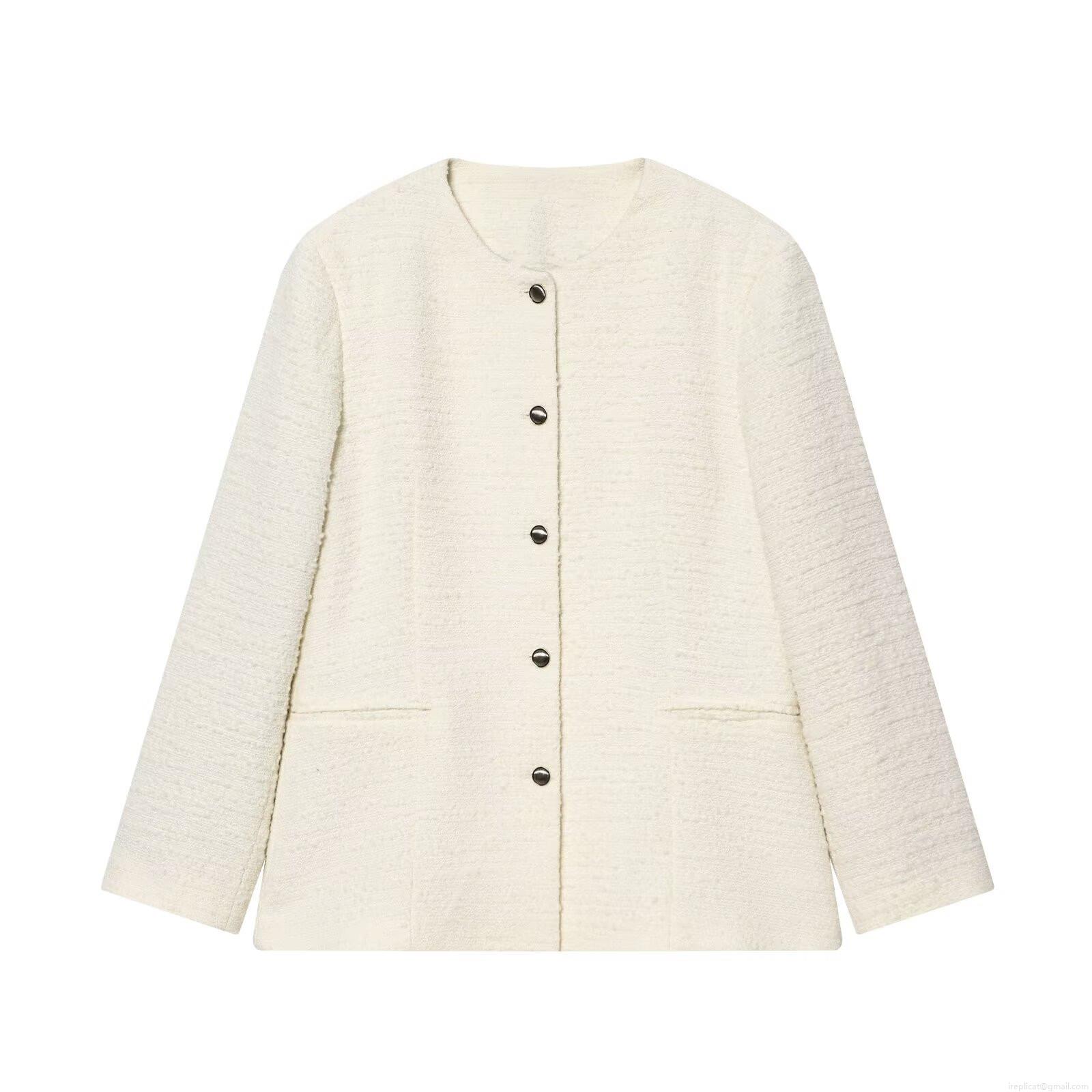 Elegant Women's Tweed Jacket Chanel Style Round Neck Single Breasted Metal Button Blazer Long Sleeve Autumn Winter Office Commute Coat Cream White