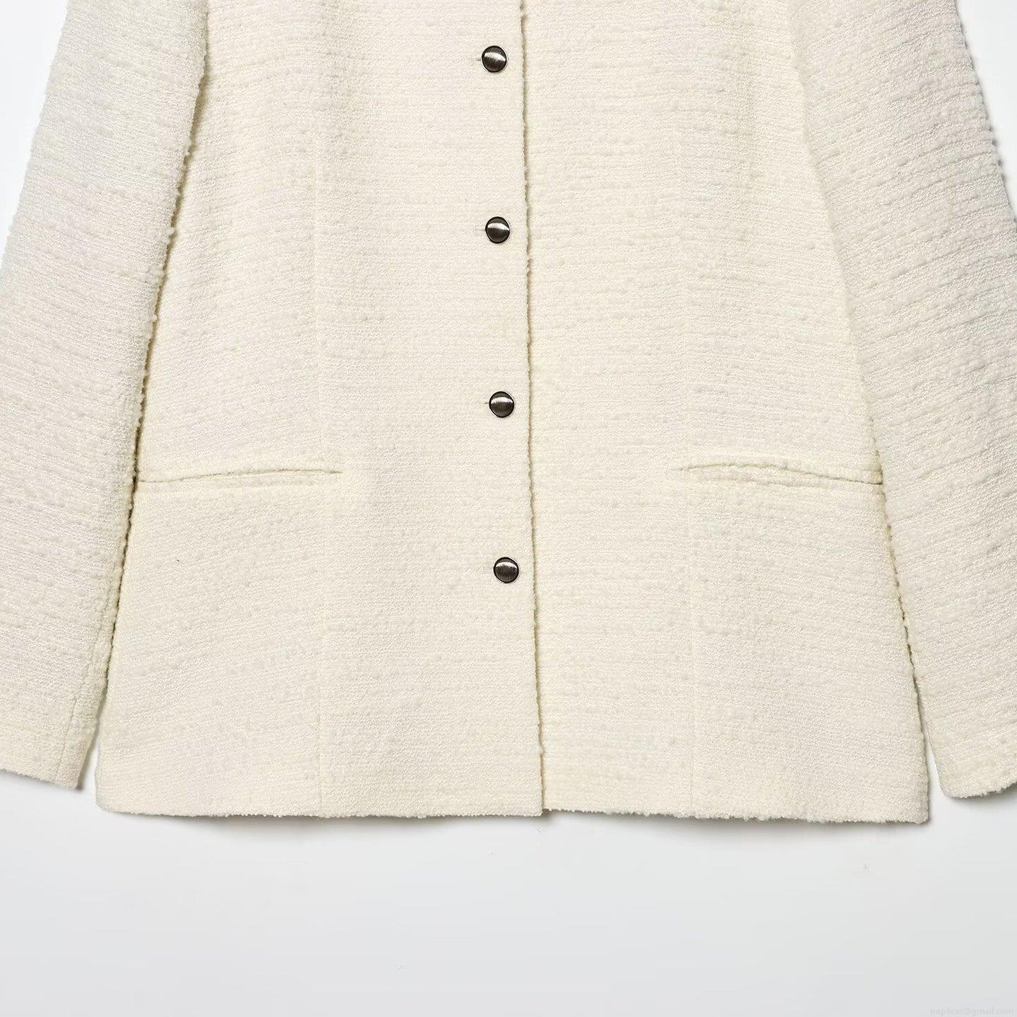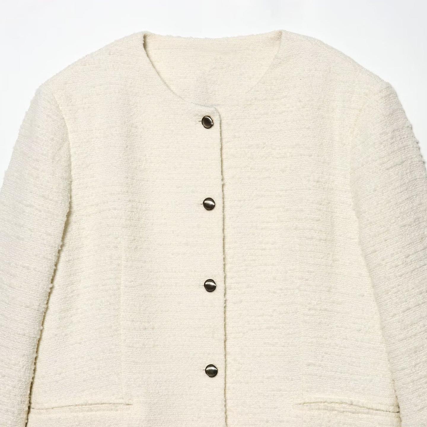 • Elegant Women's Tweed Jacket Chanel Style Round Neck Single Breasted Metal Button Blazer Long Sleeve Autumn Winter Office Commute Coat Cream White