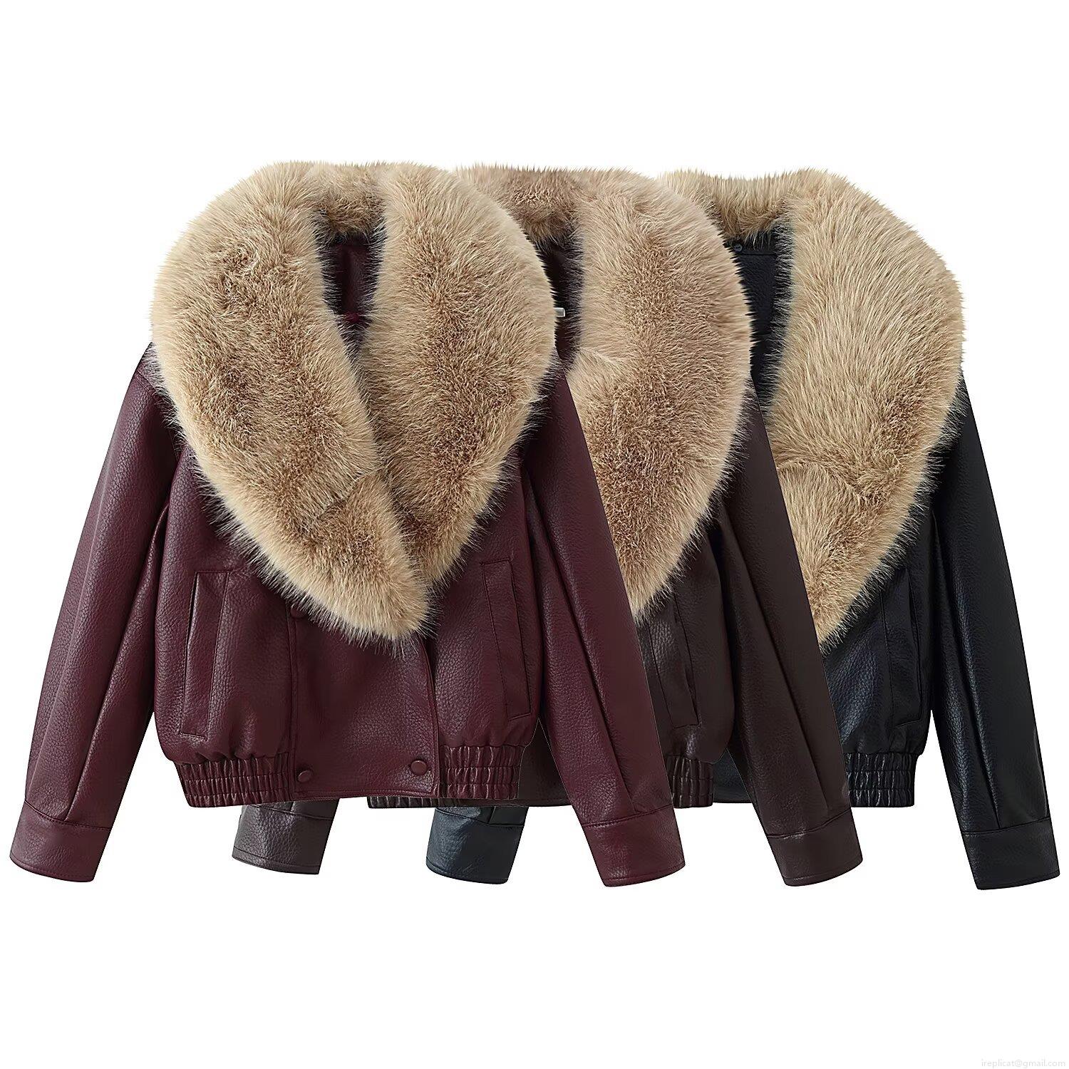 Fashion Women's Short PU Leather Jacket With Large Faux Fur Collar Solid Color Long Sleeve Biker Coat Slim Outwear Streetwear For Ladies