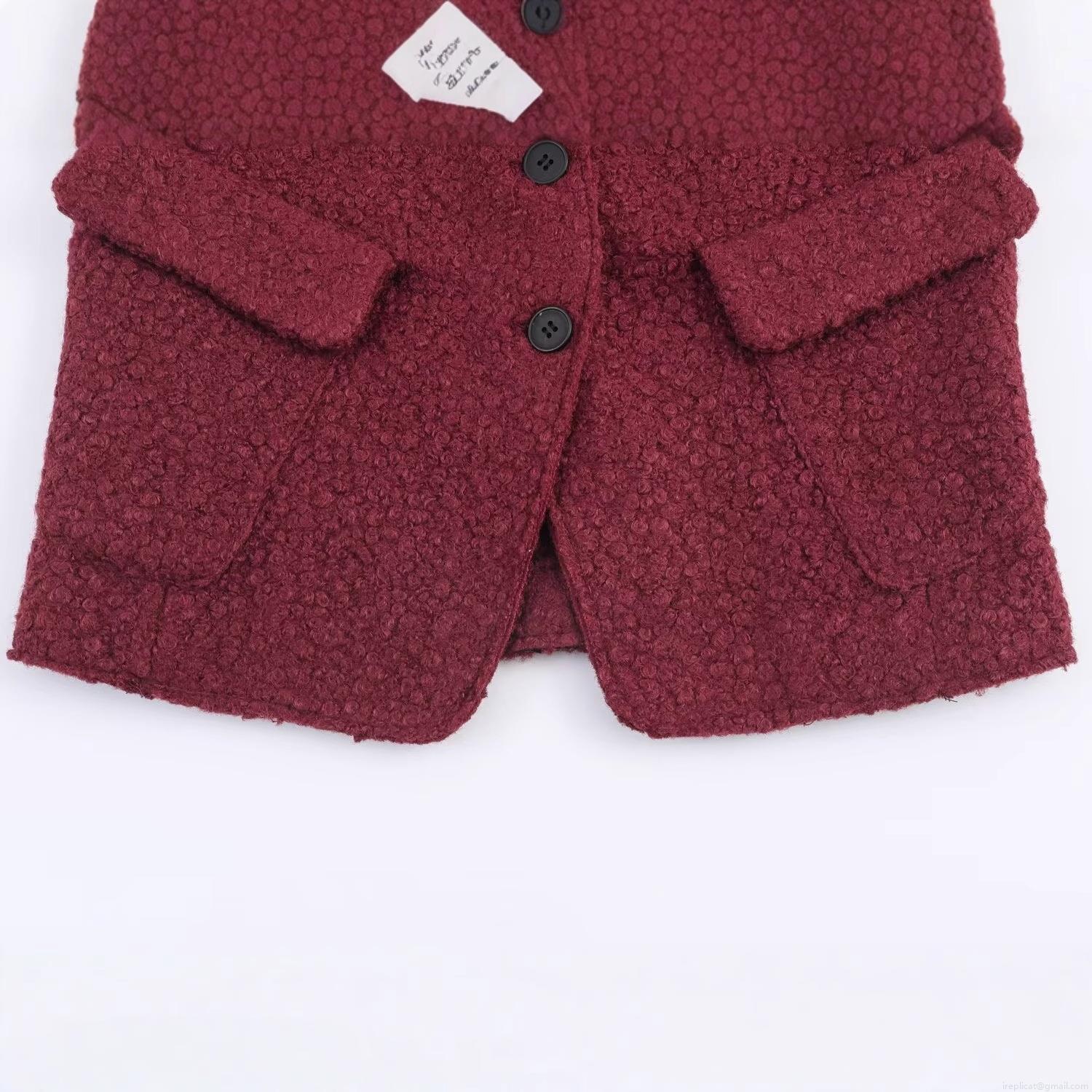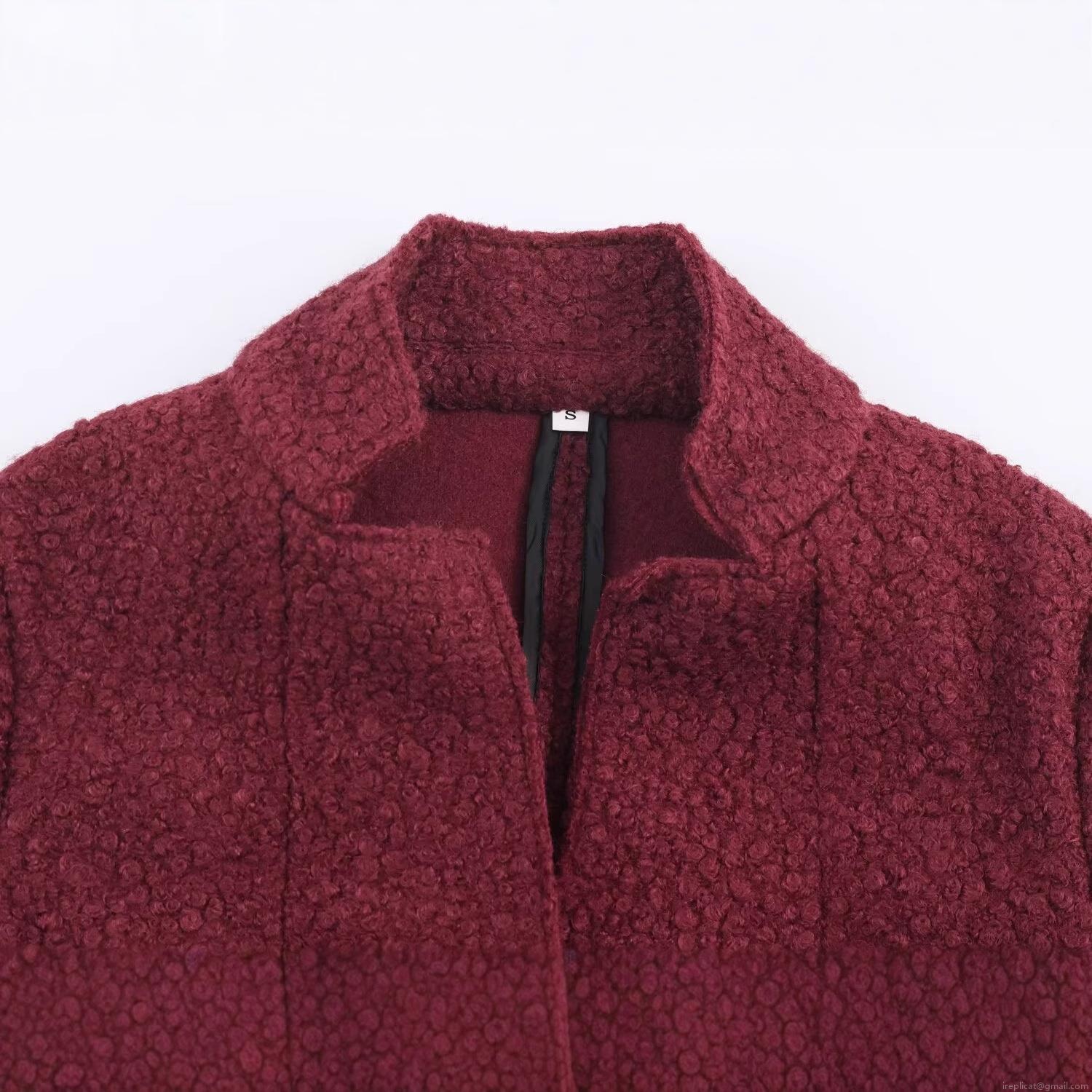 • French Retro Slim Fit Wine Red Boucle Wool Jacket For Women Elegant Stand Collar Single Breasted Short Coat With Pockets For Autumn Winter Party Office