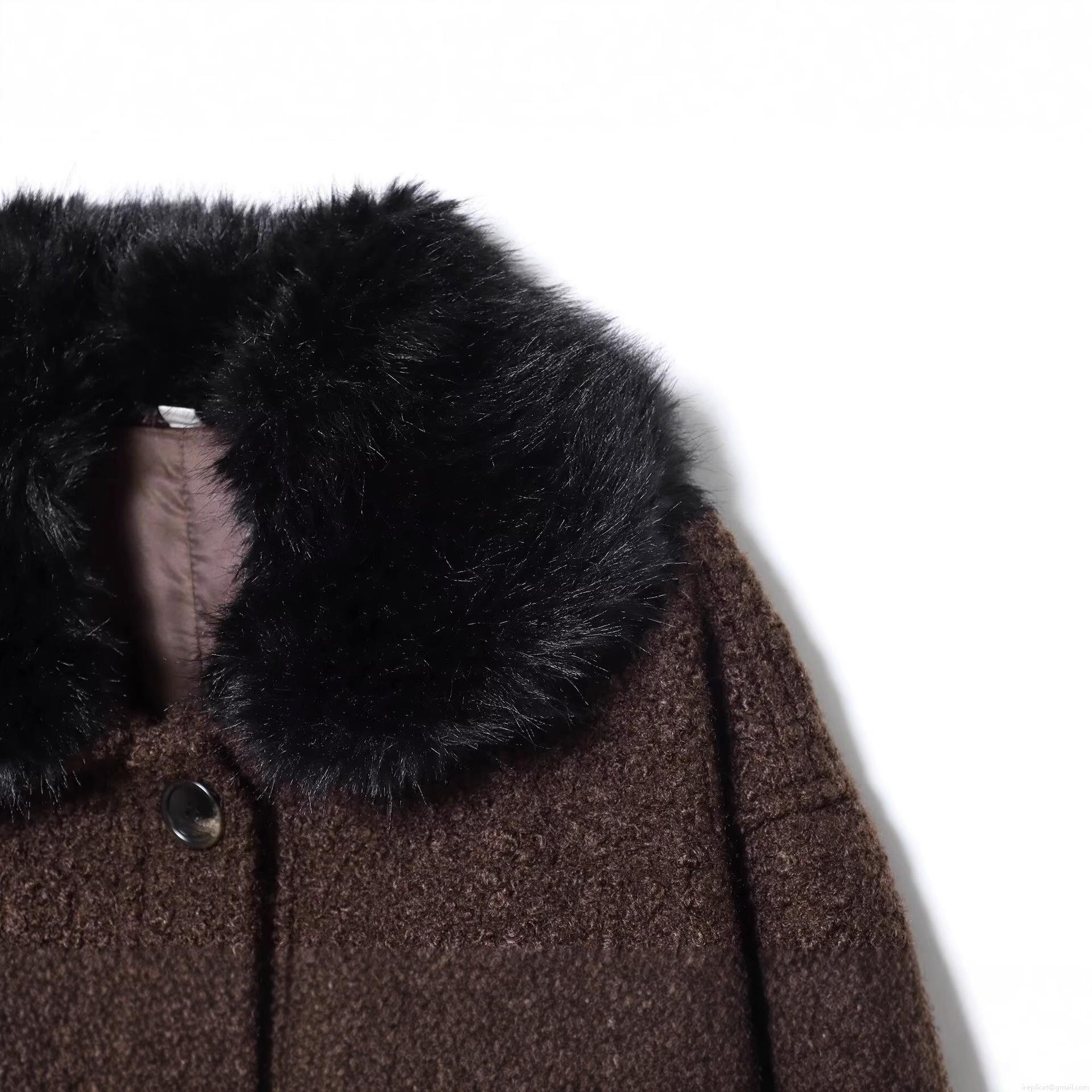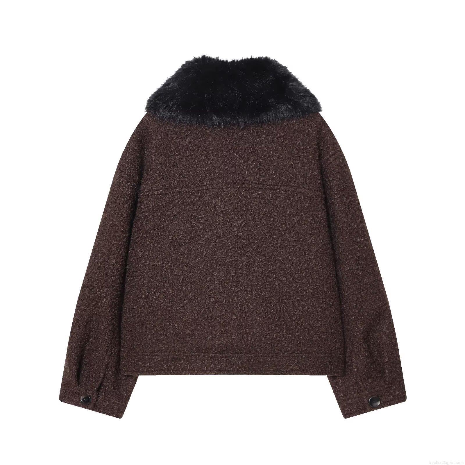 • French Style Women's Retro Short Jacket With Black Faux Fur Collar Elegant Dark Coffee Bouclé Coat Single Breasted Thick Winter Outerwear For Ladies