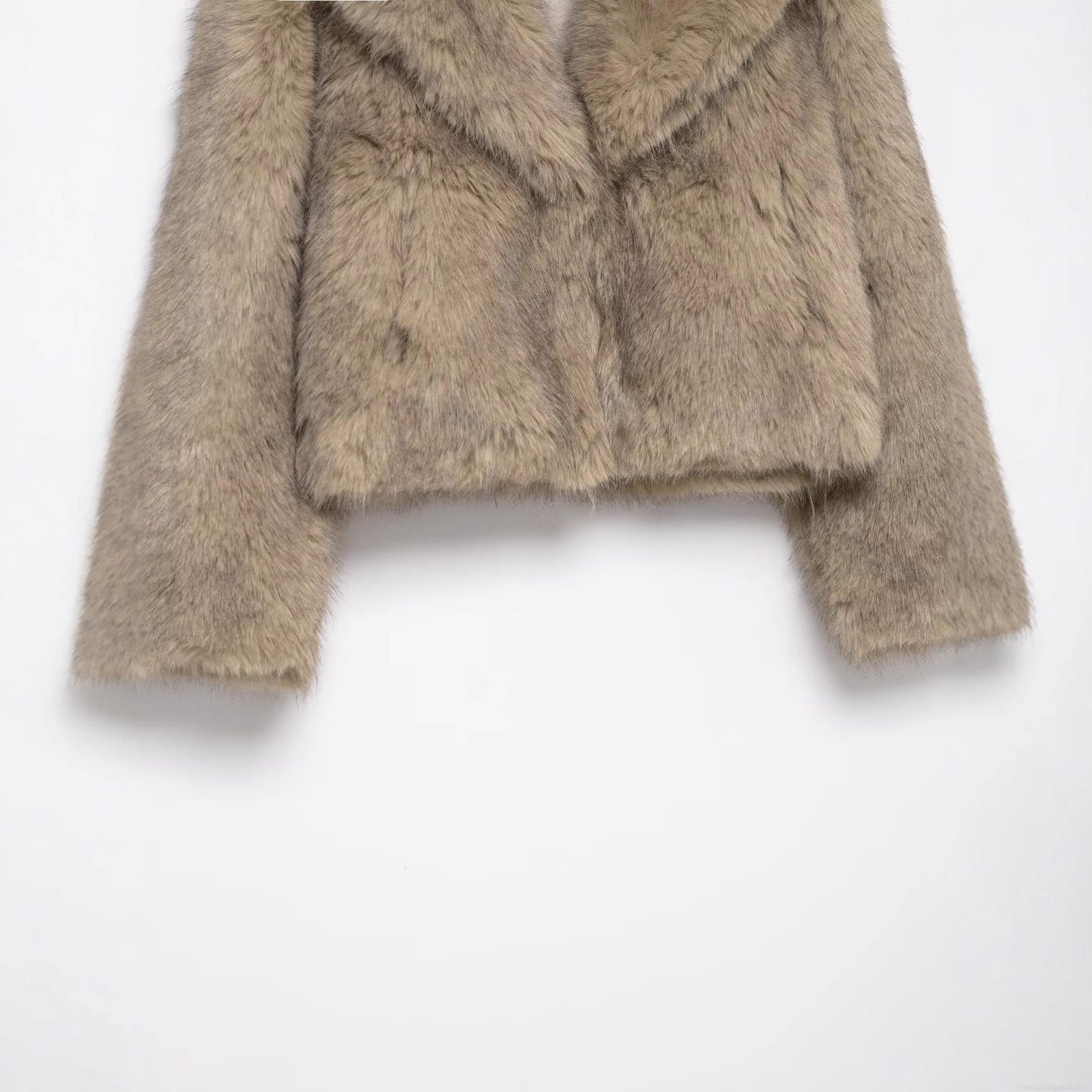 Luxury Faux Fur Short Coat For Women Elegant Lapel Long Sleeve Warm Winter Jacket Solid Camel Taupe Outerwear For Party Office Lady